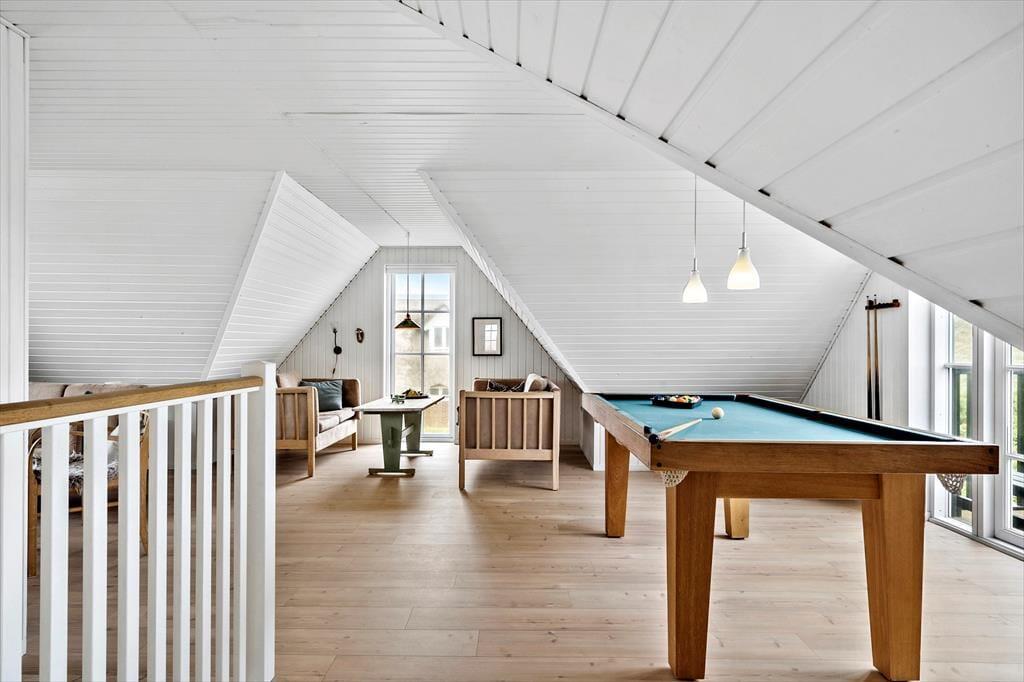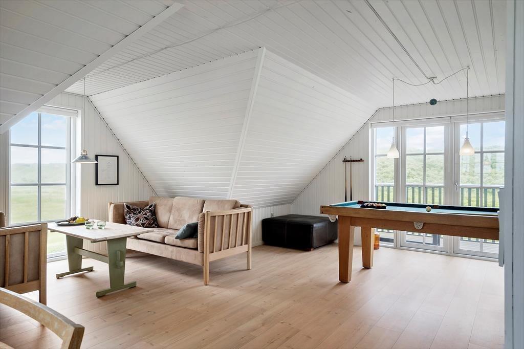 Indenfor i sommerhuset på Fourmivej 78 venter en varm og indbydende atmosfære. De charmerende trævægge og det naturlige lys, der strømmer ind, giver huset en klassisk og hyggelig sommerhusstemning. Stuen, køkkenet og spiseområdet ligger i åben forbindelse, så der er rig mulighed for at samles om måltider og gode stunder foran brændeovnens knitrende ild. Når du har brug for lidt ekstra underholdning, kan du udfordre dine medrejsende til en omgang pool. Sommerhuset er fordelt over to plan, hvilket giver både albuerum og mulighed for ro, når det er tiltrængt. Efter en dag fuld af oplevelser kan du slappe af i saunaen eller lade kroppen glide ned i det indendørs spabad, hvor velvære hurtigt indfinder sig.