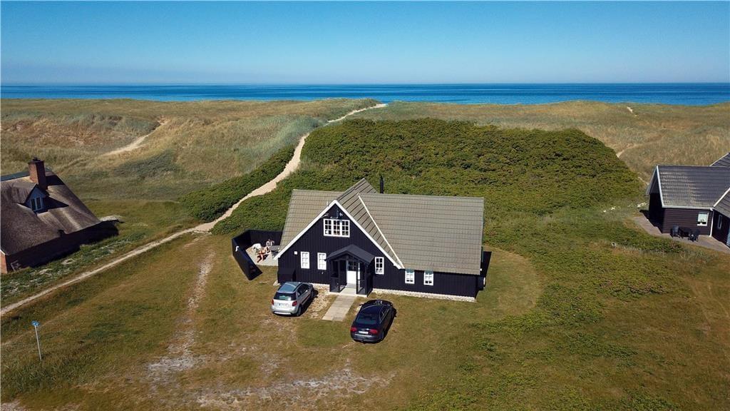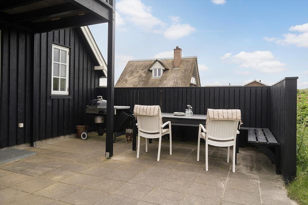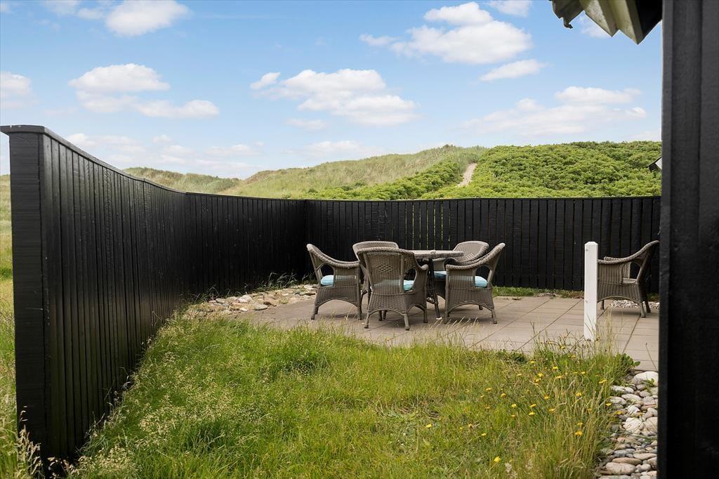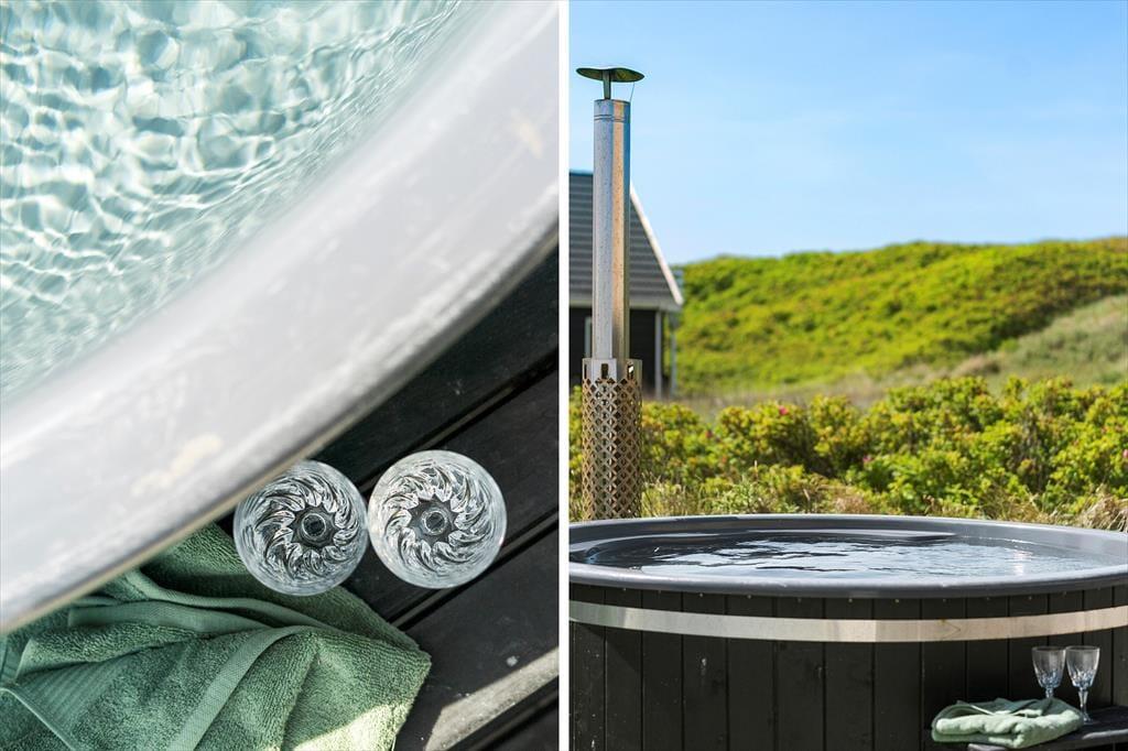 Terrassen omkring huset byder på flere skønne steder at slå sig ned – heriblandt et vildmarksbad, der fuldender følelsen af luksus under åben himmel. På solrige dage kan du læne dig tilbage i liggestolen, mens du lytter til Vesterhavets brusen, og på kølige aftener er der intet bedre end at sænke sig ned i det varme vand og kigge op på stjernerne. Hunden vil elske at følge dig på små ture i klitterne, der nærmest begynder ved din hoveddør, og hele området omkring huset indbyder til afslappet udeliv. Når vinden tager til, kan du finde ly i de hyggelige kroge omkring huset – måske med en god bog og en kop varm kaffe i hånden.