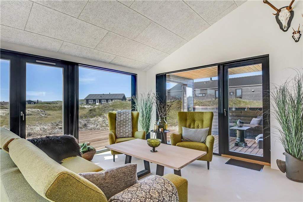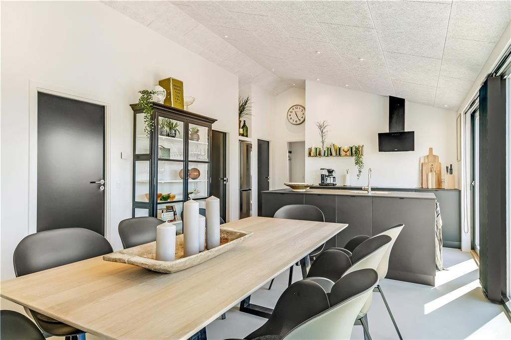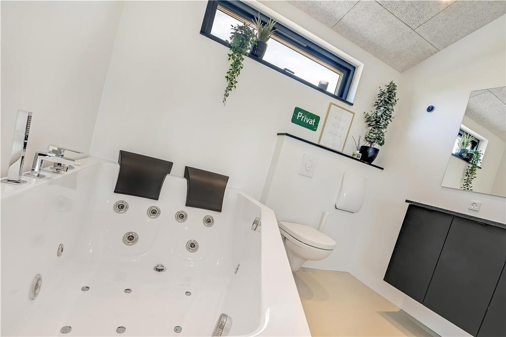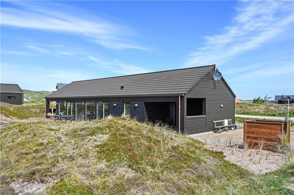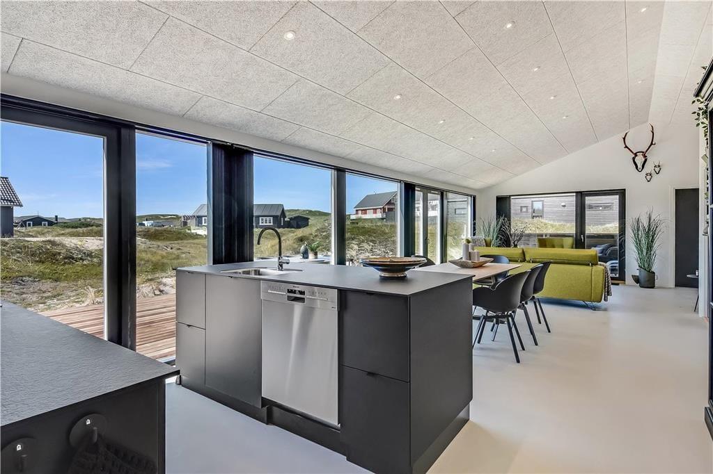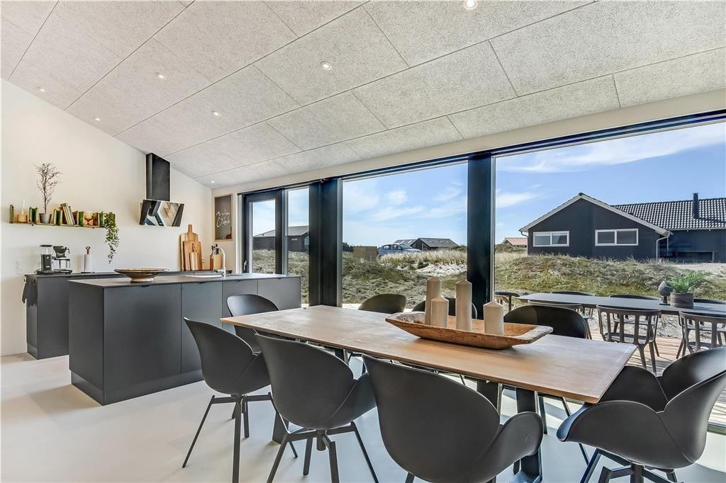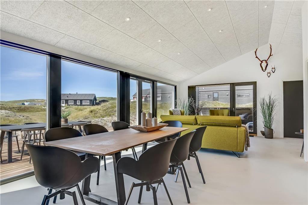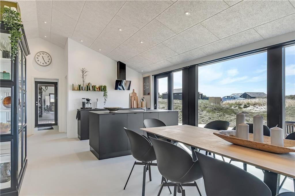 Indendørs bliver du mødt af en behagelig stemning og en stilren indretning, der gør det nemt at finde sig til rette. Store vinduer lukker masser af lys ind og skaber en let og luftig atmosfære. Køkken og stue ligger i åben forbindelse, så man nemt kan være sammen – hvad enten der skal laves mad, hygges med en kop kaffe eller slappes af i sofaen. I det lækre badeværelse kan du tage en pause fra hverdagen og synke ned i det indendørs spabad, der er perfekt til både velvære og afslapning efter en lang strandtur. Huset er indrettet med mange fine detaljer, der giver en fornemmelse af, at her er tænkt over tingene – og alt sammen i en stil, der passer til ferie ved Vesterhavet.