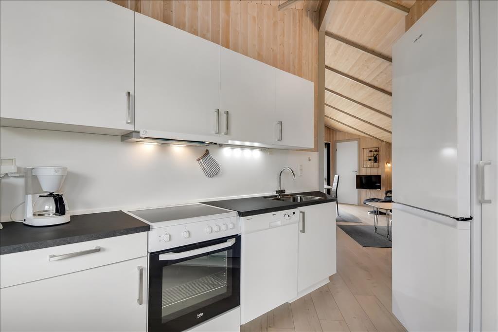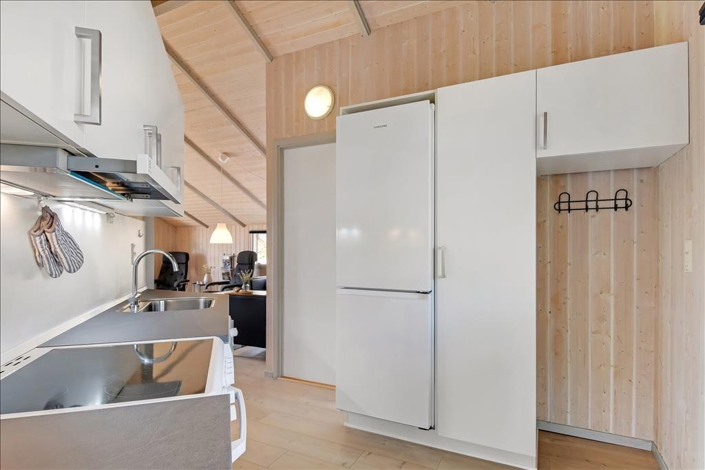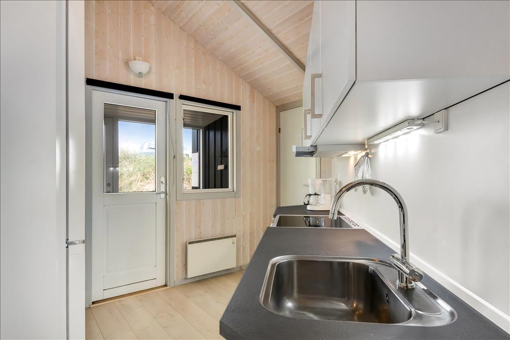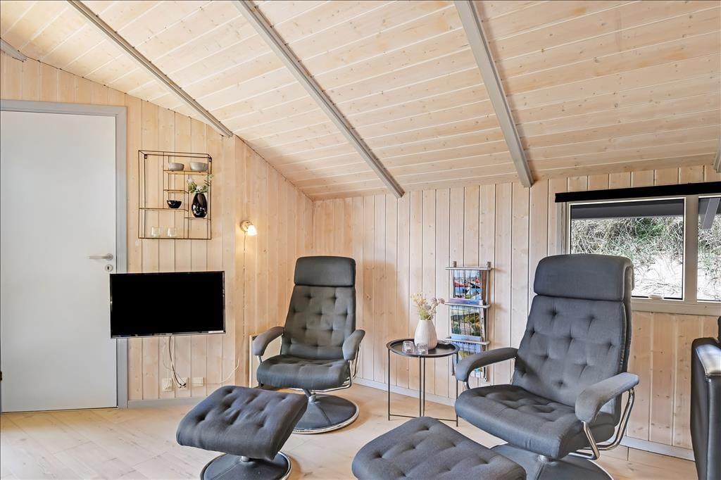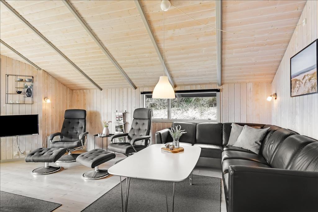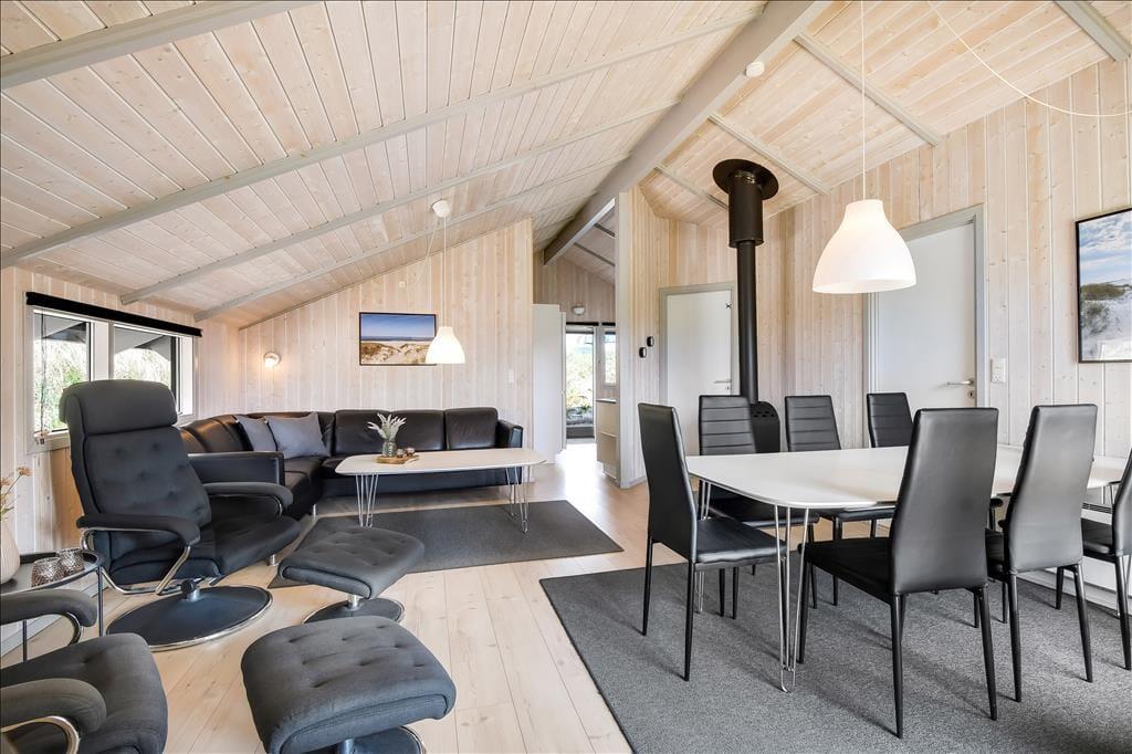Når du træder ind i sommerhuset, bliver du mødt af et lyst og venligt interiør, hvor lyse trævægge og trælofter skaber en varm og afslappet stemning. Indretningen er klassisk og rolig, og det er nemt at finde sig til rette – uanset om du er på weekendophold eller på ferie i længere tid. Huset har en fin opholdsafdeling, hvor stue og køkken ligger i åben forbindelse og inviterer til hyggelige timer med madlavning, spil og fælles måltider. Efter en lang dag med strandliv og udflugter kan du forkæle dig selv med et varmt bad i spabadet eller nyde et velfortjent hvil i saunaen – mens varmen langsomt løsner op i kroppen. Her er det nemt at komme helt ned i gear og bare være til stede i nuet.