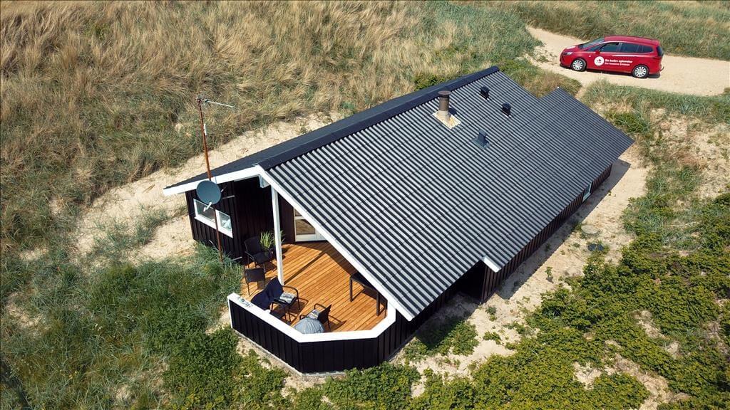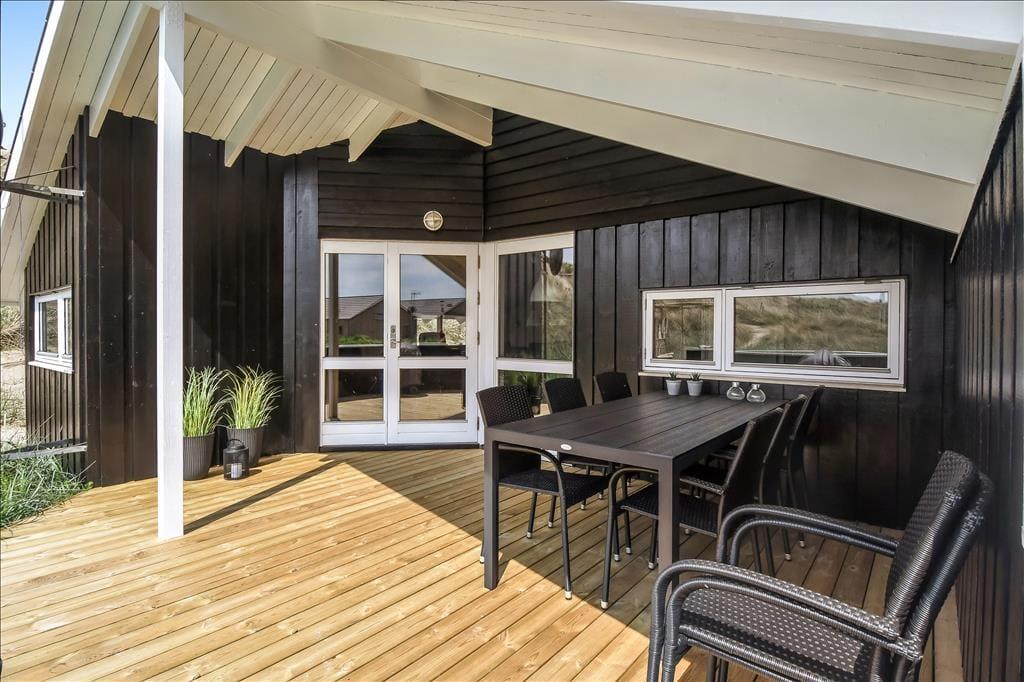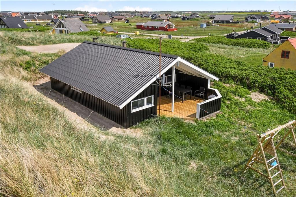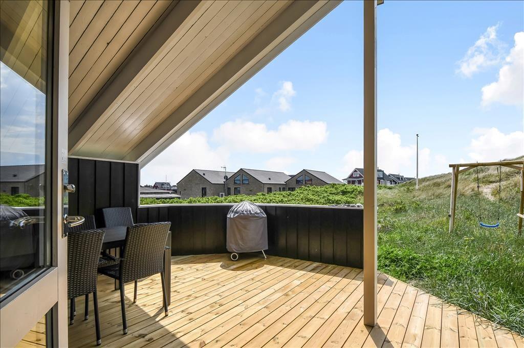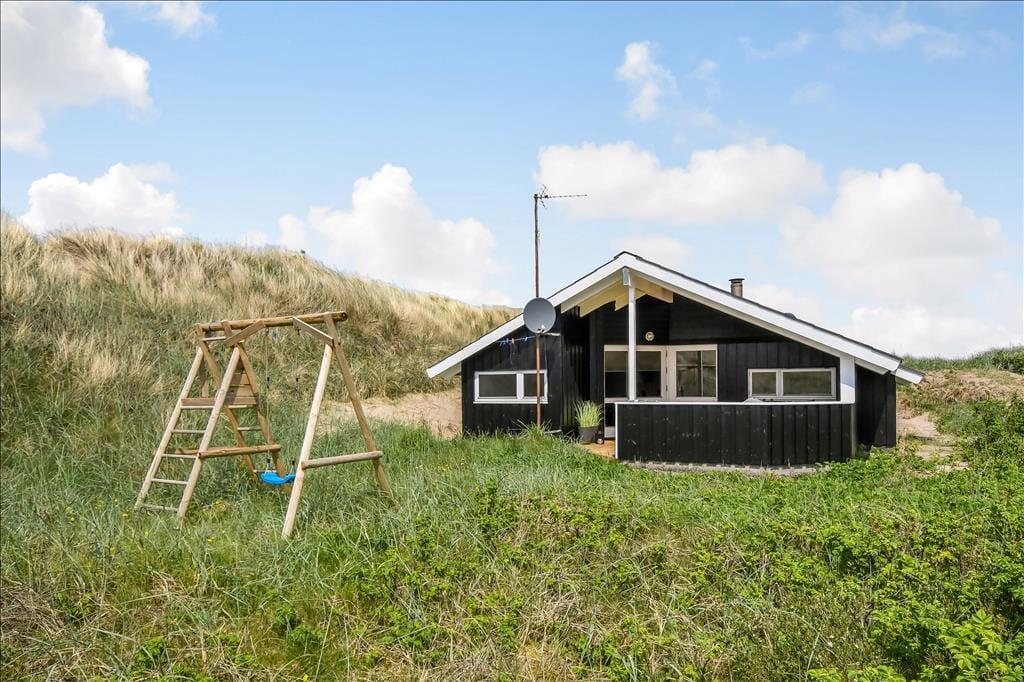 Udendørs er sommerhuset lige så indbydende. Fra terrassen kan du skimte klitterne og fornemme nærheden til havet, og med både lækroge og plads til at spise ude får du her en skøn ramme om livet i det fri. Morgenkaffen smager ekstra godt i den friske luft, og senere på dagen kan du nyde solskinstimer i liggestolen, mens børnene gynger i haven. Måske får du lyst til at tænde op i grillen og samle familien til aftensmad under åben himmel – og bagefter slentre en tur ned til vandet, som du når på få minutter. Haven er desuden helt ideel til en ferie med hund, da den åbne natur og den fredelige beliggenhed gør det let at lufte både ben og poter. Her kan du trække vejret dybt og bare nyde stilheden og duften af saltvand.