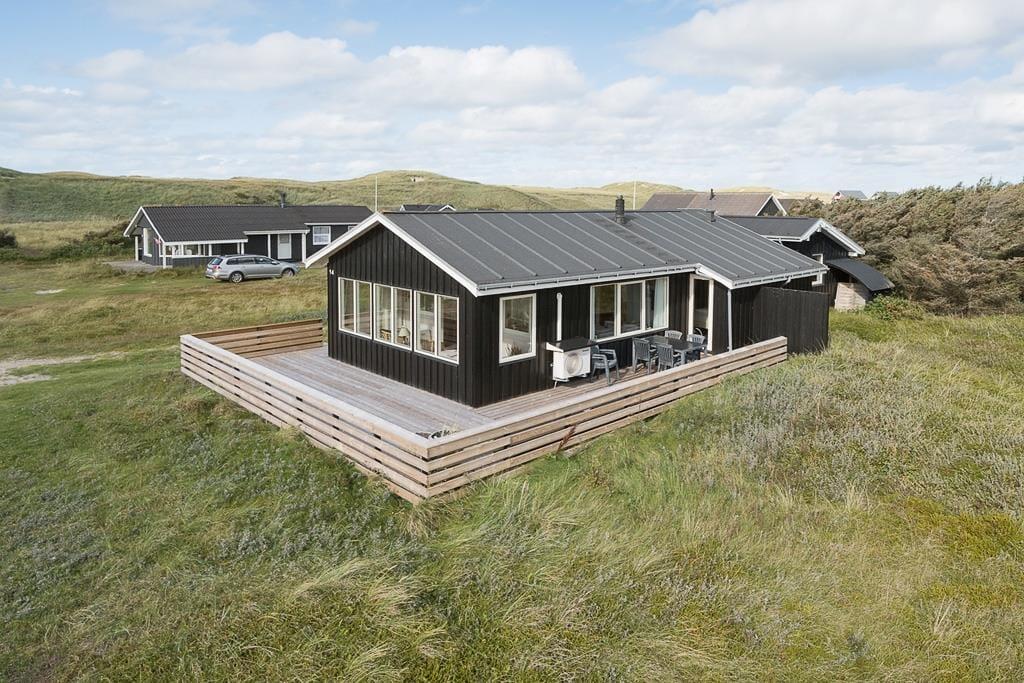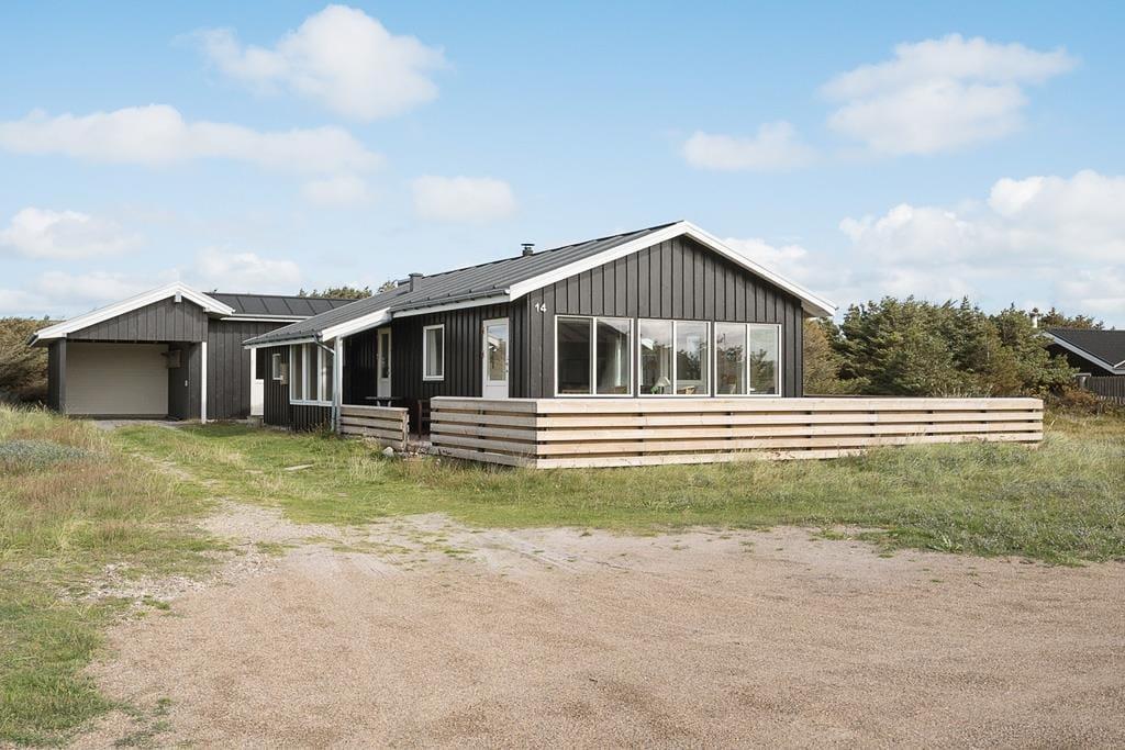 Rundt om huset venter en naturskøn grund med plads til både leg og ro. Den store træterrasse ligger med kig til klitterne og er udstyret med havemøbler, så du nemt kan finde en god plads i solen – eller skyggen, hvis du foretrækker det. Her kan du spise dine måltider under åben himmel, nyde dagens første kop kaffe i stilhed, eller tænde op i grillen og lade duften af sommer sprede sig. Den lukkede vej og naturgrunden omkring huset giver en fredelig og privat stemning, som gør det let at koble helt fra. Børnene kan more sig med at gynge i haven eller bygge sandslotte nede på stranden.