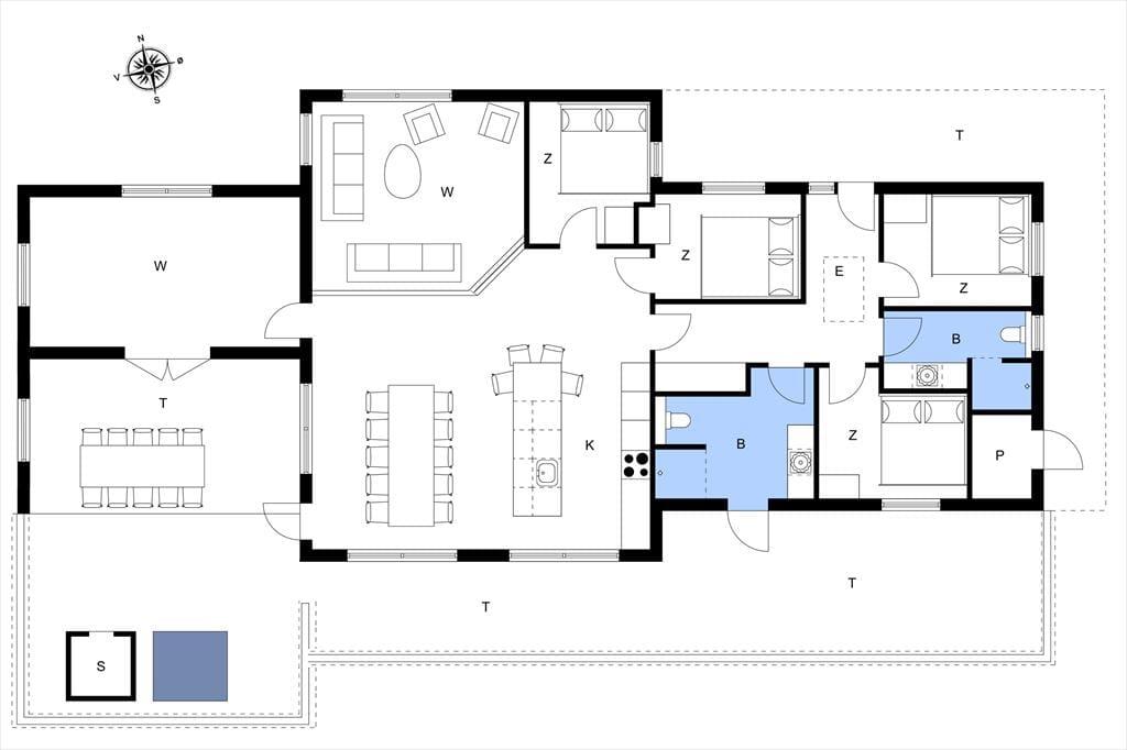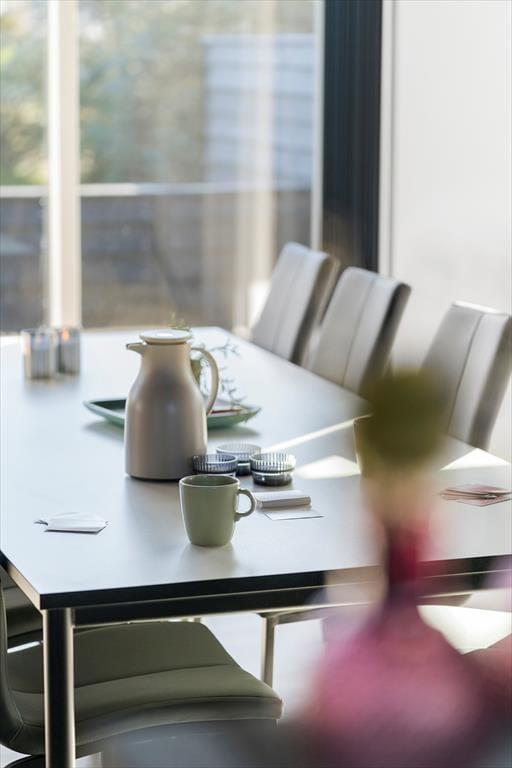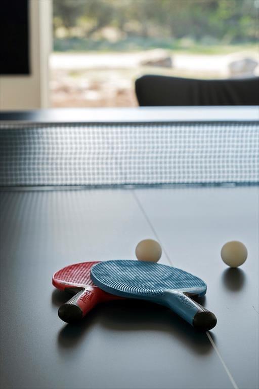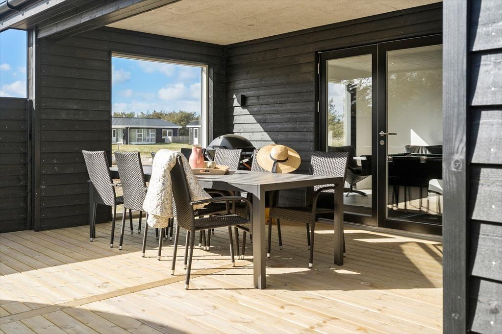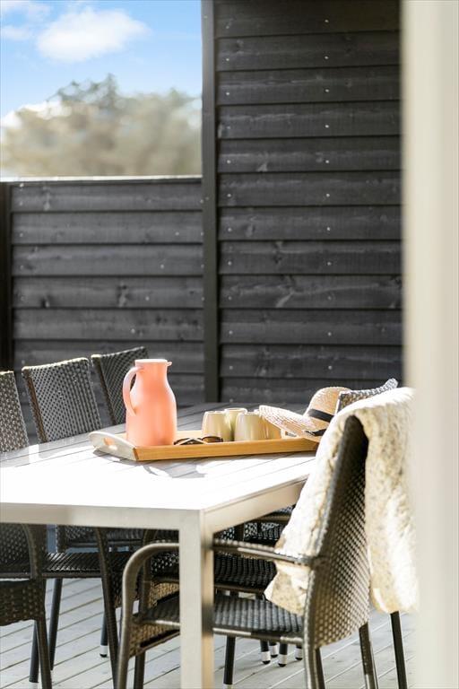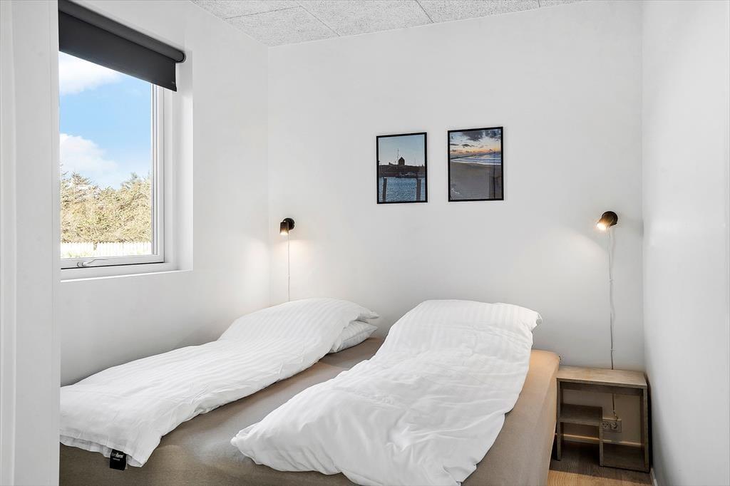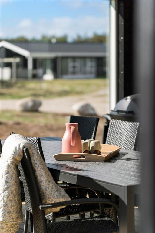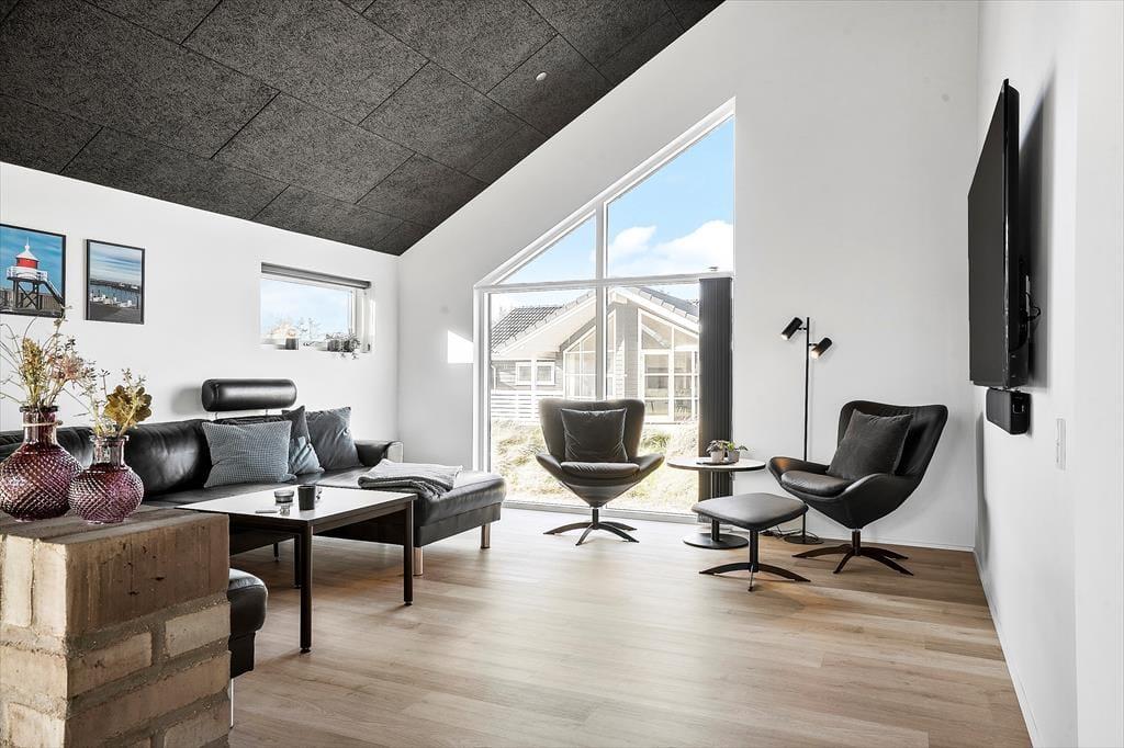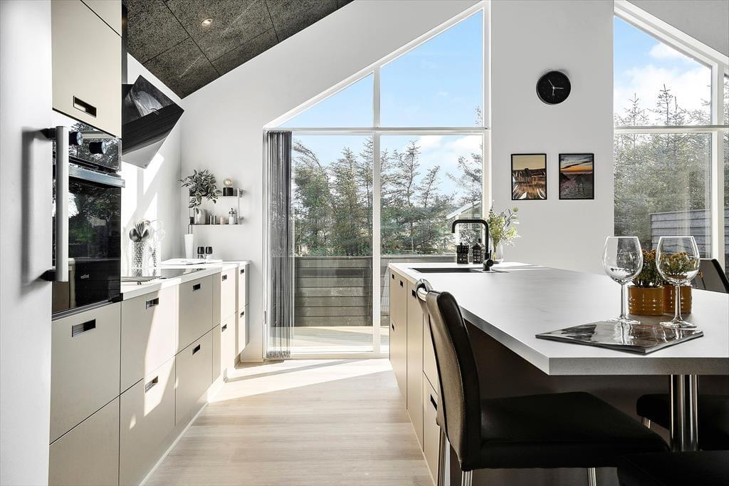 Indenfor byder sommerhuset på en lys og moderne indretning, hvor feriestemningen hurtigt indfinder sig. Stue og køkken ligger i åben forbindelse, hvilket gør det let at være sammen om både madlavning, spil og hyggelige samtaler. Store vinduer trækker naturen med ind i opholdsrummet og lader dig følge lyset og vejret gennem hele dagen. Huset er tænkt til fællesskab og fornøjelse – og det mærkes især i aktivitetsrummet, hvor du kan dyste i både pool og bordtennis. Her kan både børn og voksne få timer til at flyve af sted, især på dage hvor vejret måske lokker mindre til udendørs aktiviteter. Hjemmets indretning kombinerer funktionalitet og velvære, og der er skabt gode rammer for både ro og samvær.