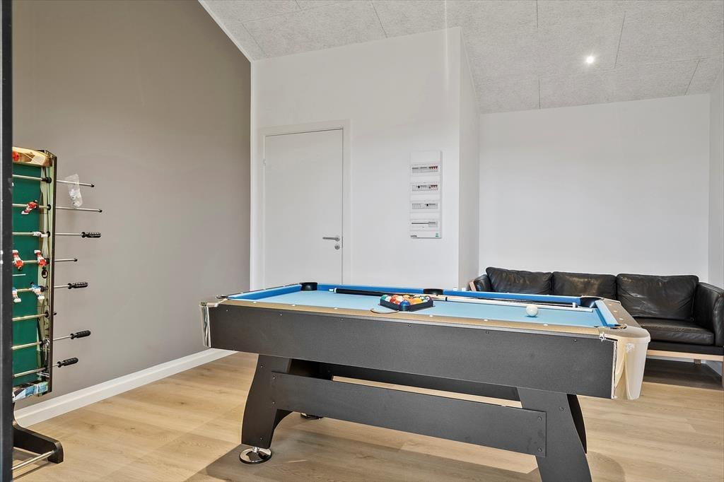 Allerede ved første skridt ind i huset fornemmer du den høje standard og de gennemtænkte detaljer. Det store opholdsrum er holdt i lyse farver og rene linjer, og indretningen emmer af luksus og feriestemning. Køkken og stue ligger i åben forbindelse, hvilket gør det nemt at samles om madlavning, samtaler og hyggelige måltider. Når det er tid til lidt sjov og konkurrence, kan I trække jer tilbage til husets aktivitetsrum, hvor poolbordet står klar til venskabelige dueller. Her er plads til fællesskab, men også mulighed for at finde ro – og uanset årstid er rammerne sat for kvalitetstid med dem, du holder af.