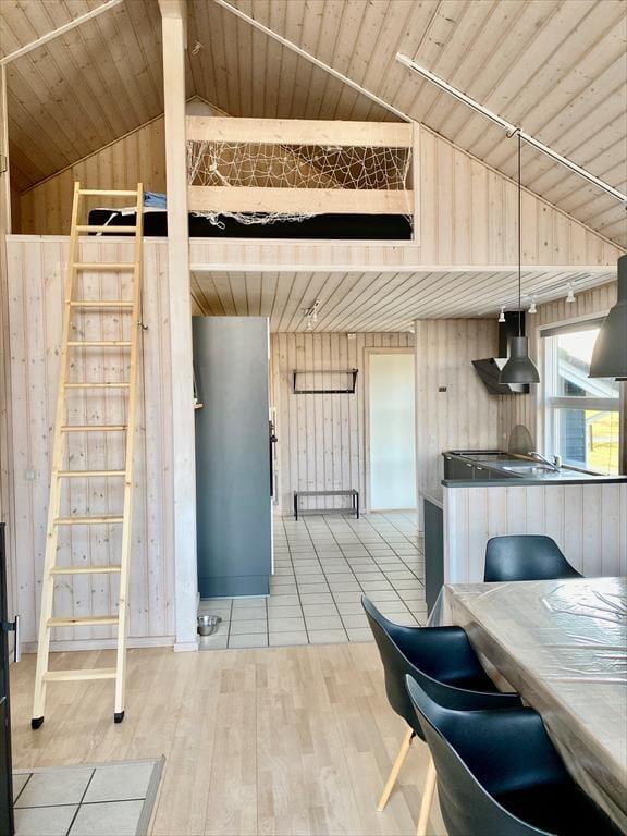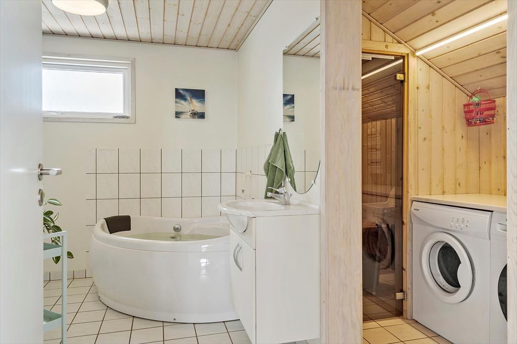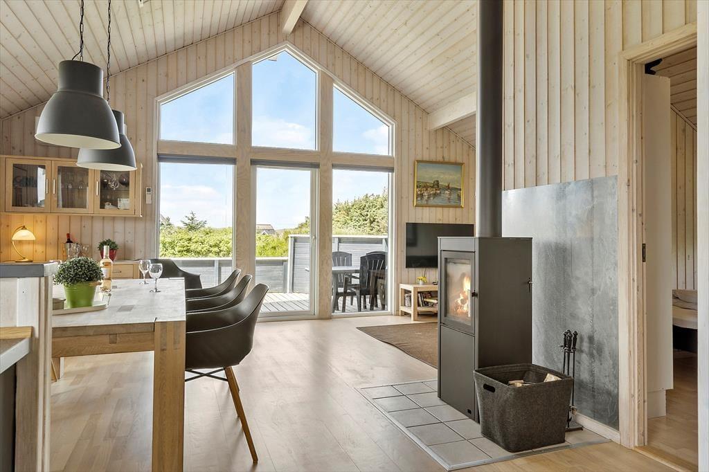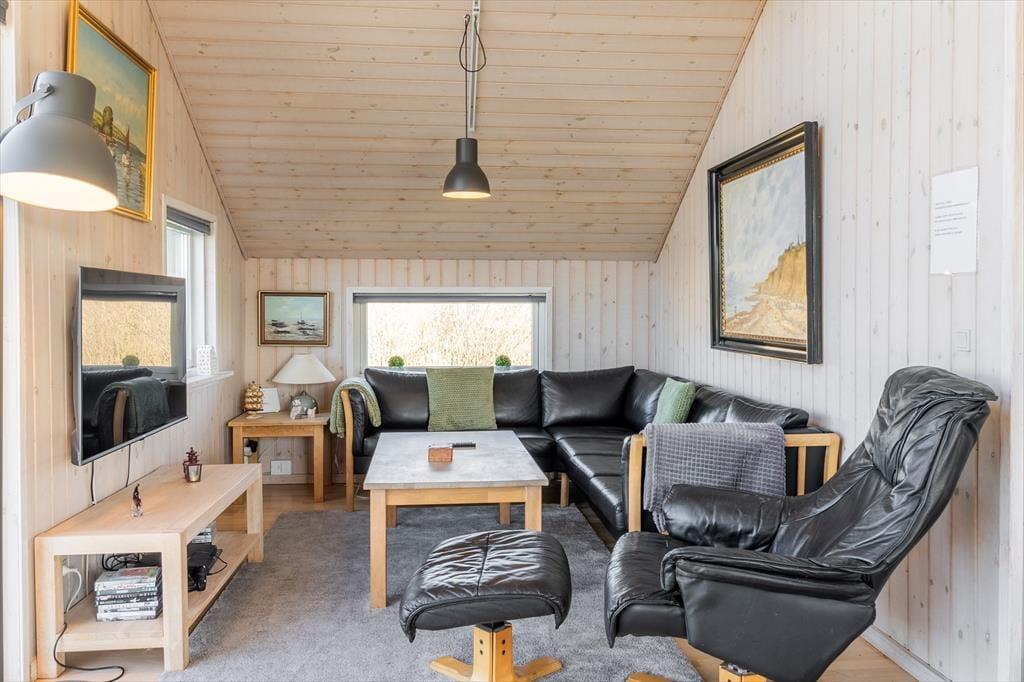 Det lyse og velindrettede sommerhus inviterer dig indenfor til en afslappet ferieatmosfære. Huset er indrettet i en klassisk og hyggelig stil, hvor brændeovnen i stuen sørger for varme og stemning på kølige dage. Opholdsrummet samler stue og køkken i ét, så hele familien kan være sammen, mens der laves mad, spilles spil eller hygges i sofaen. Når du vil forkæle dig selv lidt ekstra, kan du tage en tur i husets indendørs spa eller nyde roen i saunaen – to faciliteter, der giver feriedagene en ekstra luksuspræget kant. En hyggelig hems fungerer som et ekstra frirum – måske til afslapning med en god bog eller til børn, der gerne vil have deres egen lille hule. Her får du et sommerhus, der skaber gode rammer for både nærvær, ro og feriehygge.