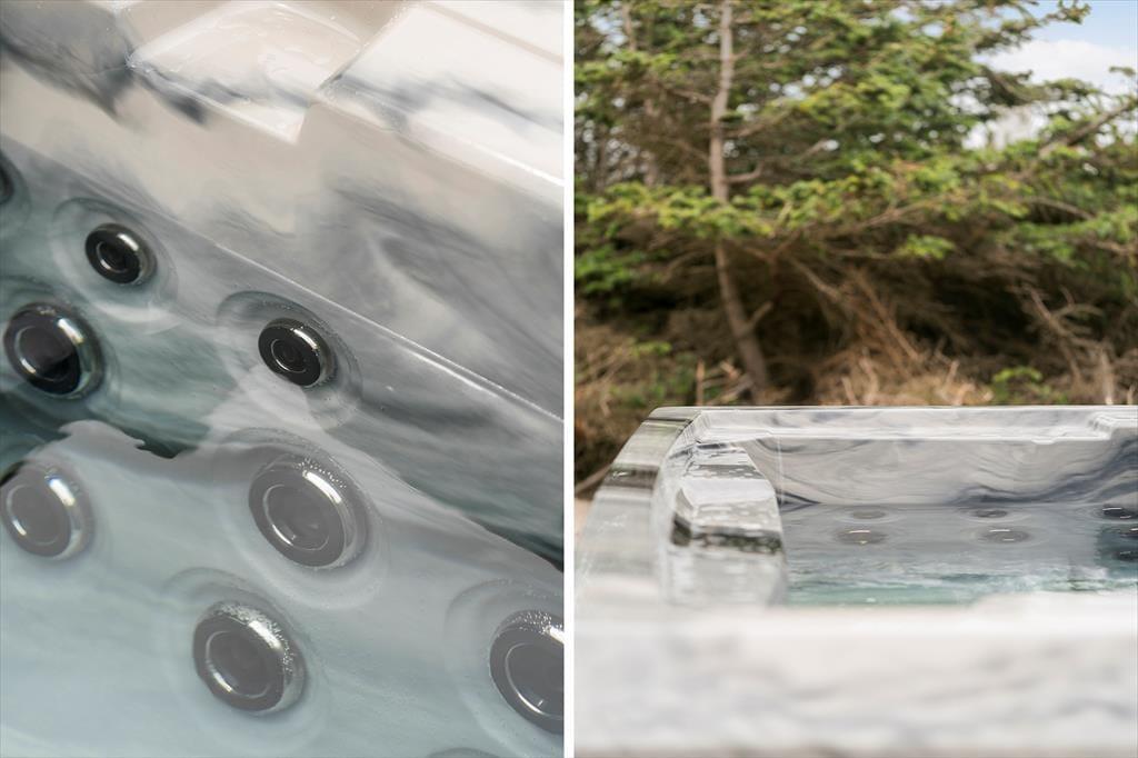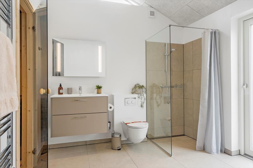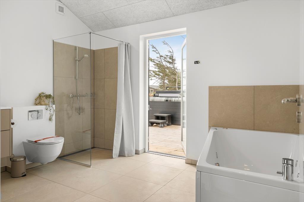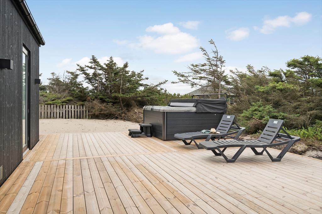 Sommerhusets udemiljø er helt i top – med en stor og solrig terrasse, hvor der både er plads til afslapning, samvær og lidt ekstra hverdagsluksus. Her finder du nemlig både en udendørs spa og en udebruser, så du nemt kan skifte mellem kolde dukkerter i havet og varme bobler under åben himmel. Terrassen er indrettet, så du kan nyde solen hele dagen, og når aftenen falder på, kan du tænde op i grillen og samle familien til middag i det fri. Den omkringliggende græsplæne giver god plads til leg og boldspil, og din hund kan trygt være med overalt. Her får du en dejlig base til at nyde udelivet i ro og fred – med havbrisen i håret og fuglesang i baggrunden.