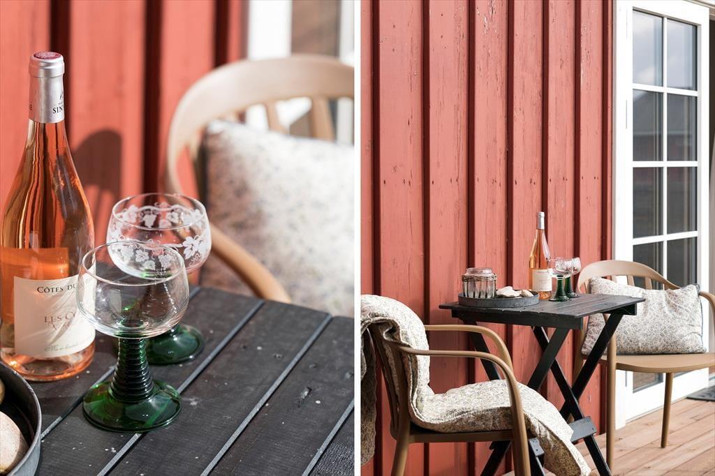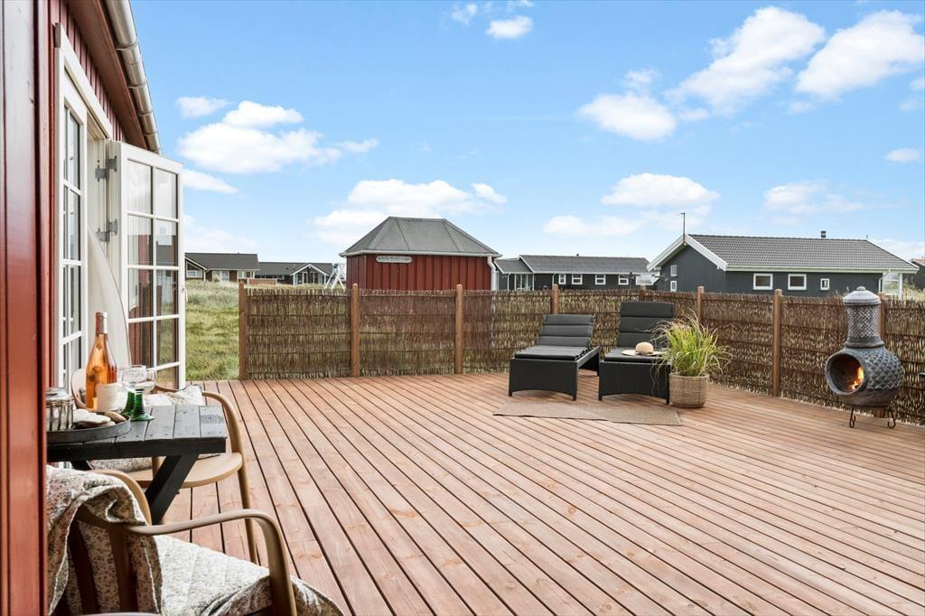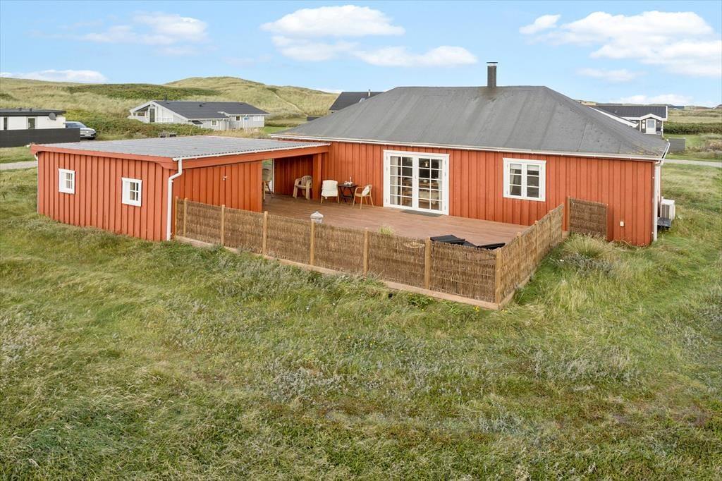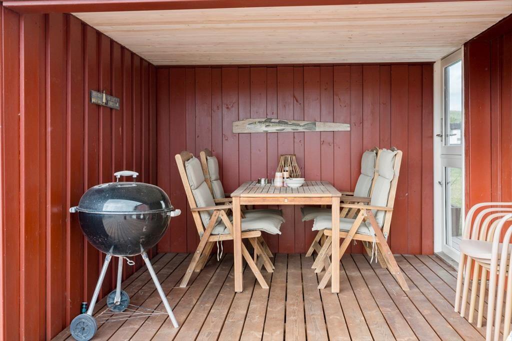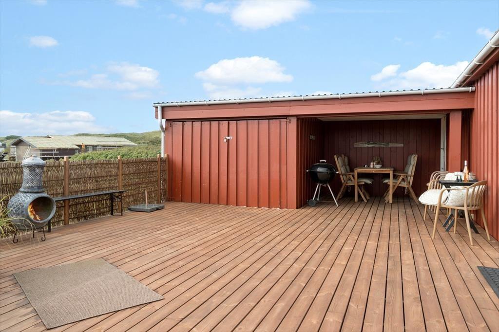 Udenfor finder du flere hyggelige kroge, hvor du kan nyde den friske havluft og solens stråler. Den store terrasse indbyder til afslappende timer i liggestolen eller lange aftener med grill og fællesspisning under åben himmel. Terrassen er delvist overdækket, så selv hvis der skulle komme en lille byge, kan I stadig opholde jer udenfor og nyde feriestemningen. Sommerhusets grønne område er autentisk naturgrund, som kan nydes fra terrassen mange opholdssteder. Og så er der bare noget særligt over at sidde her i de stille sommeraftener og lytte til naturens lyde, mens solen går ned over kystlandskabet.