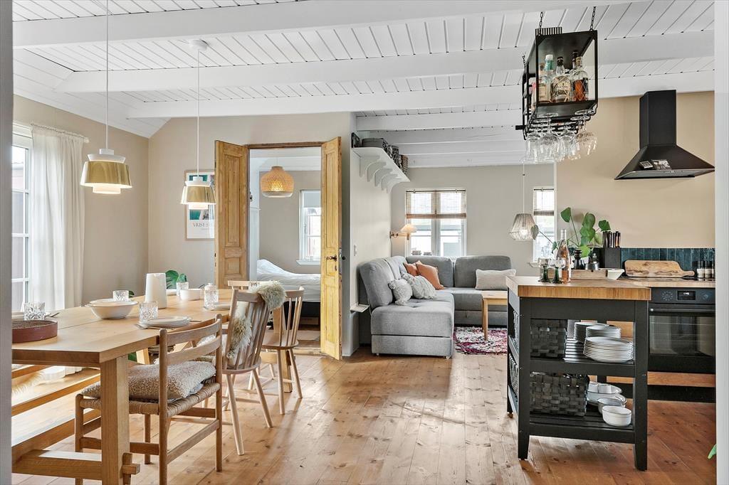 Når du træder ind i sommerhuset på Charlottevej 11, bliver du straks mødt af en hyggelig og charmerende atmosfære, hvor detaljerne er nøje gennemtænkte for at skabe den perfekte ferieoplevelse. Huset er indrettet med fokus på varme og komfort, hvilket straks kan mærkes i opholdsstuen, hvor den indbydende sofagruppe er det naturlige samlingspunkt. Her kan I slappe af foran fjernsynet efter en dag fuld af oplevelser. Det åbne køkken- og spiseområde ligger i direkte forbindelse med stuen, så I let kan nyde hinandens selskab, mens maden forberedes. De lyse rum og store vinduer skaber en luftig og behagelig atmosfære, og med fire soveværelser er der rigeligt med plads til både små og store feriegæster.