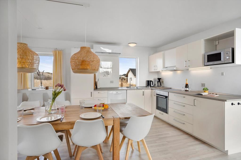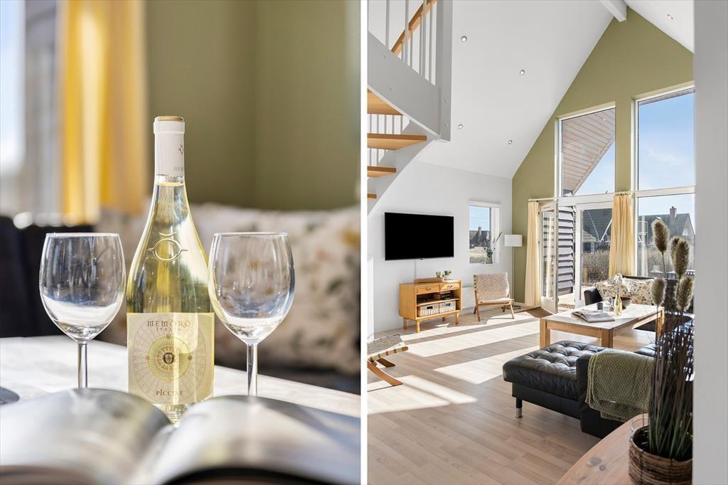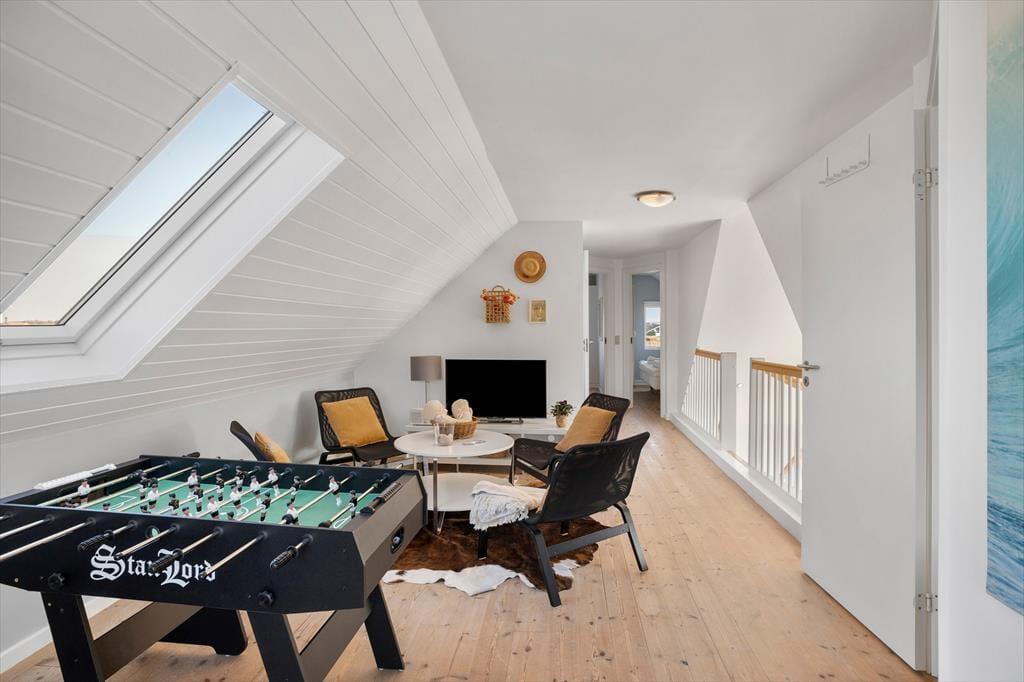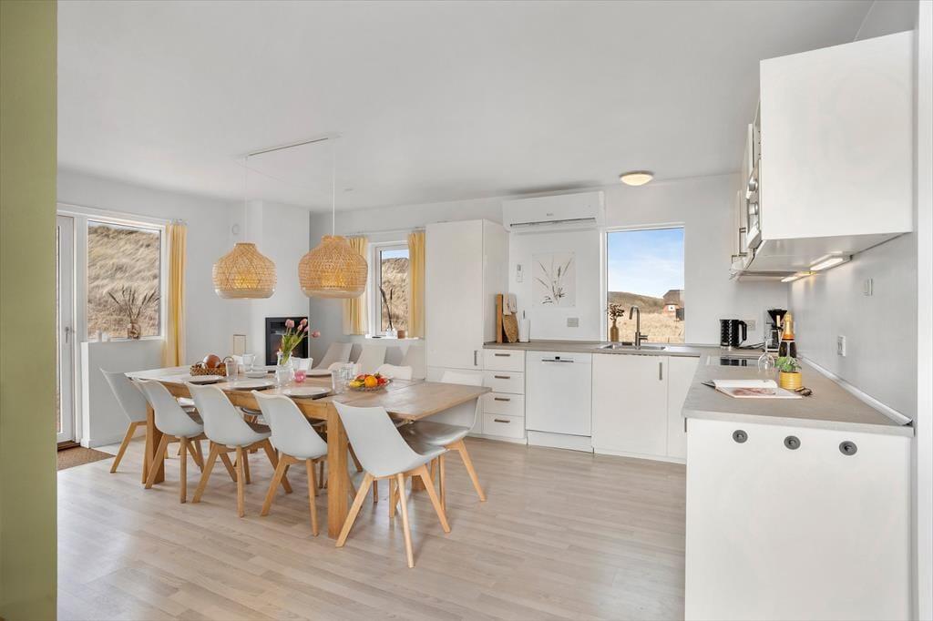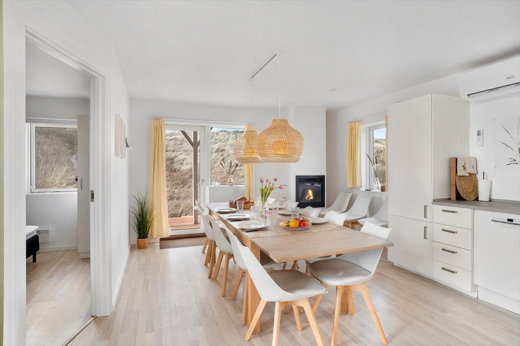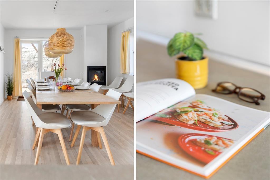 Indenfor byder sommerhuset på en lys og hyggelig atmosfære, hvor det er let at føle sig hjemme fra første øjeblik. Indretningen er venlig og imødekommende med god plads til hele familien – eller måske to familier, der rejser sammen. Når dagens oplevelser er overstået, kan du finde ro i stuens bløde sofahjørne, hvor lyset strømmer ind fra vinduerne. Efter en frisk tur til stranden kan det være ekstra skønt at synke ned i det varme vand i spabadet – eller finde ro og varme i saunaens afslappende rum. Det her er et sommerhus, hvor afslapning ikke bare er en mulighed – det er en del af hele oplevelsen.