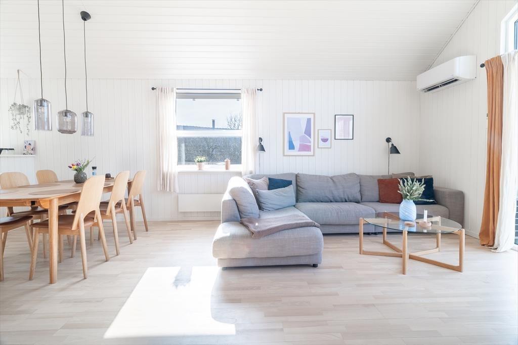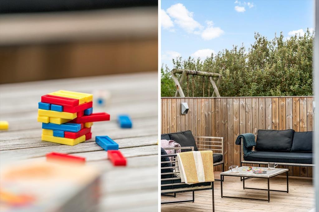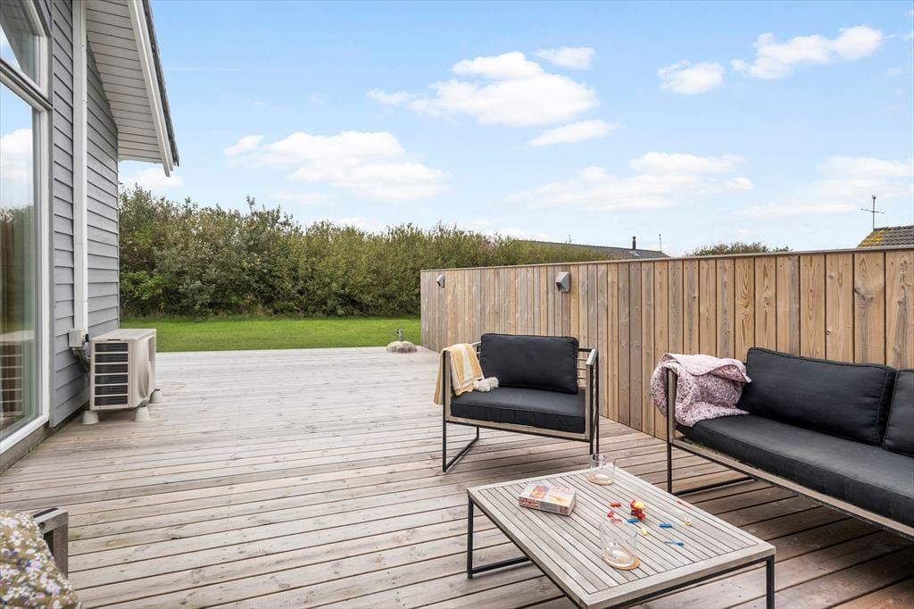 Når solen skinner, og dagene er lange, er det udenfor, ferielivet for alvor folder sig ud. Den store træterrasse på 80 m² giver masser af plads til at læne sig tilbage i en liggestol, spise dagens måltider i det fri eller måske bare læse en god bog i skyggen. Mod øst er 20 m² af terrassen overdækket, så du altid kan finde et behageligt sted at sidde – også hvis duggen falder eller solen står lavt på himlen. Træerne omkring grunden skaber ikke kun læ, men også en særlig stemning af privatliv og fred, som er svær at finde andre steder. Her er der plads til både børn, voksne og hunde – og tid til bare at være til stede.