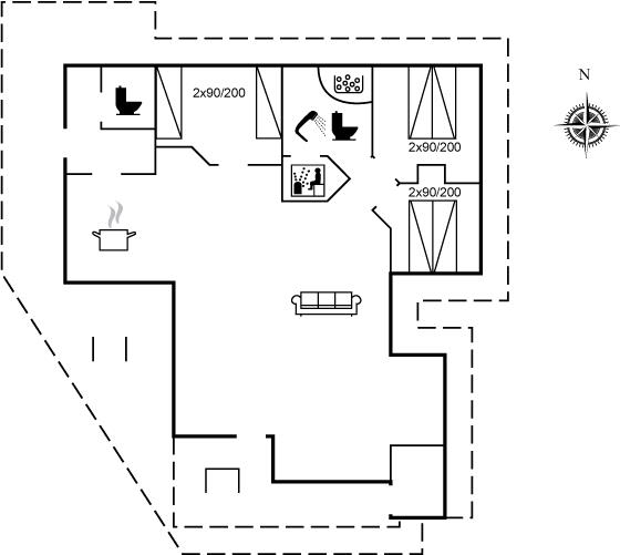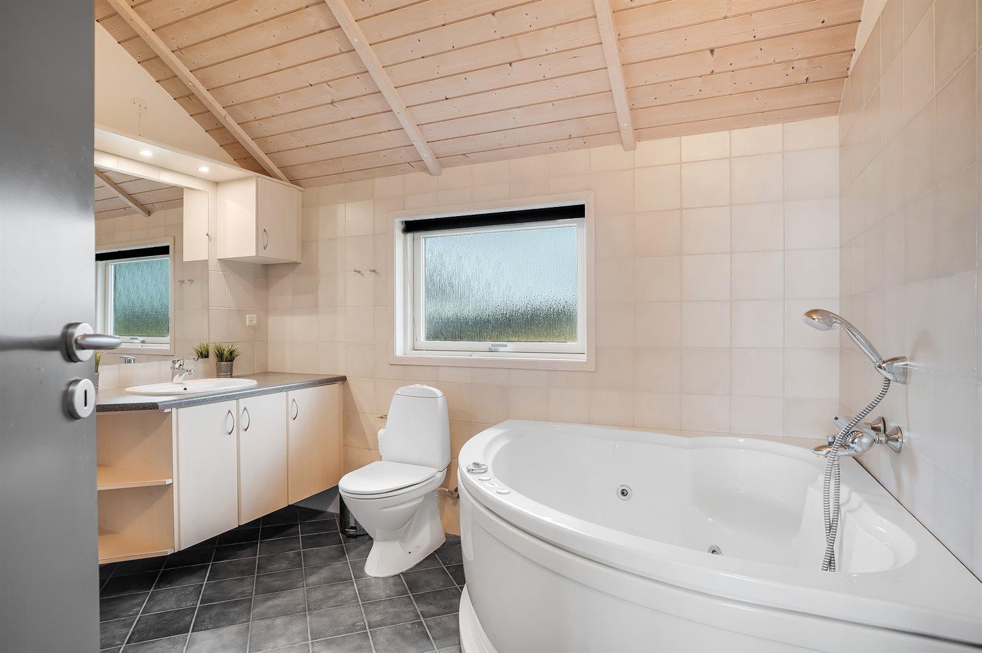 Der er 1 badeværelse med bruseniche og 2 toiletter, heraf 1 gæstetoilet. Der er gulvvarme på 1 badeværelse. Der er gulvvarme på gæstetoilettet. I saunaen er der mulighed for afslapning.