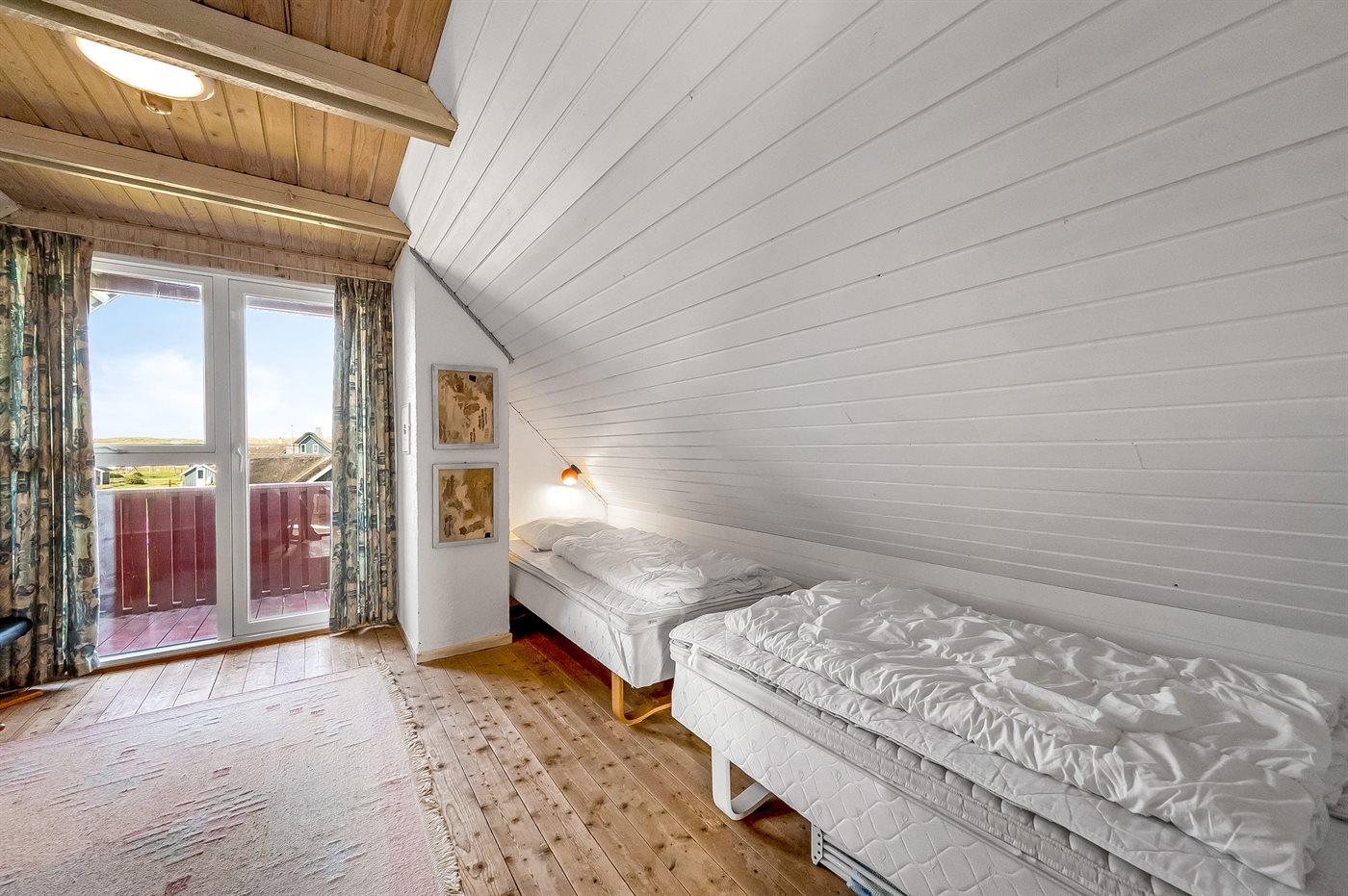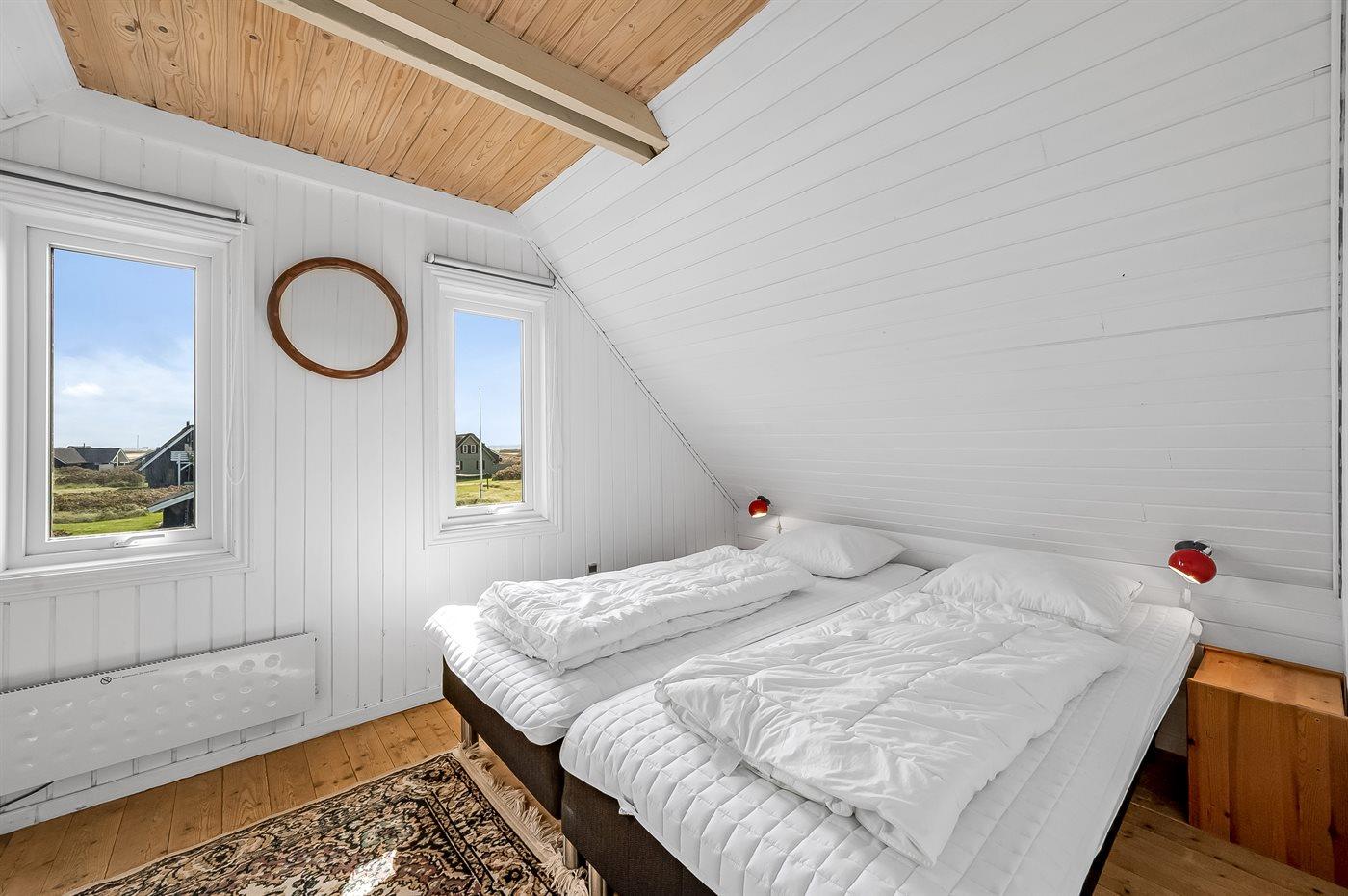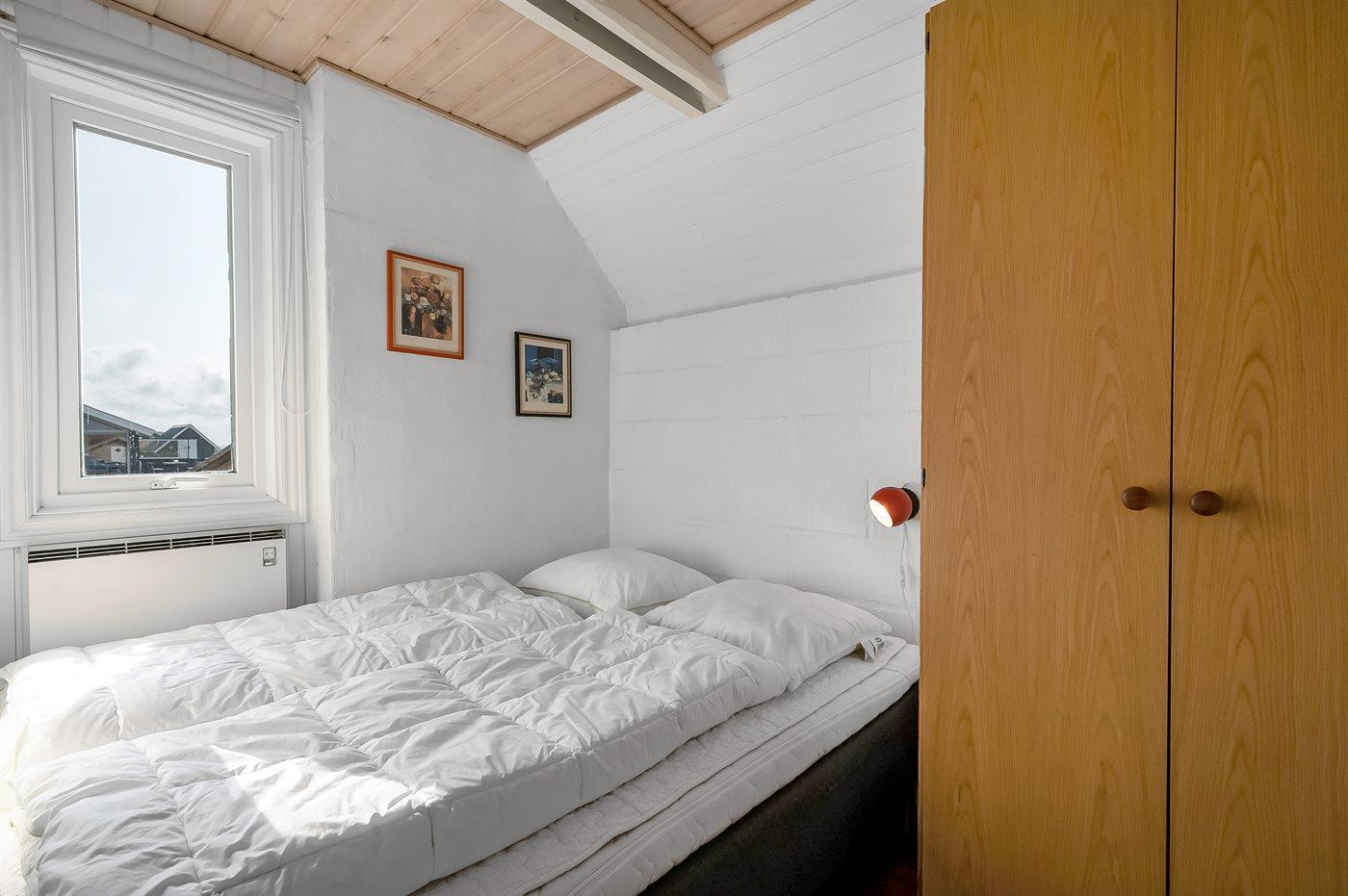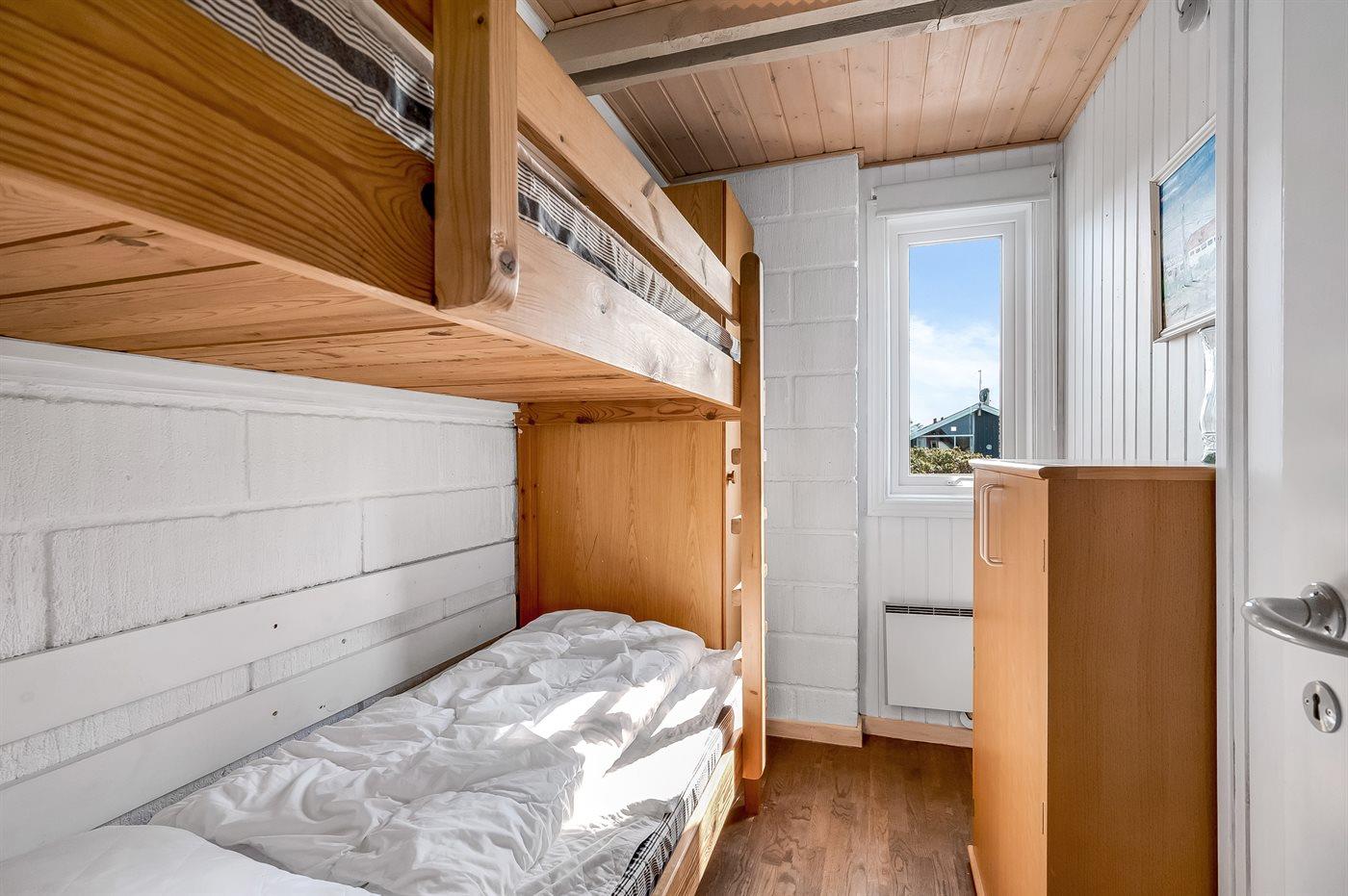 Der er i alt 3 soveværelser. Sovepladserne fordeler sig på: 4 sovepladser i dobbeltsenge. 2 sovepladser i køjeseng. Derudover er der 1 stk. barneseng.