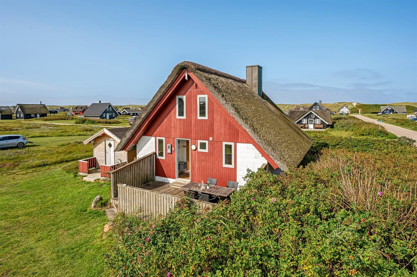 Charmerende sommerhus med stråtag tæt på havet og natur, perfekt til en afslappende ferie.