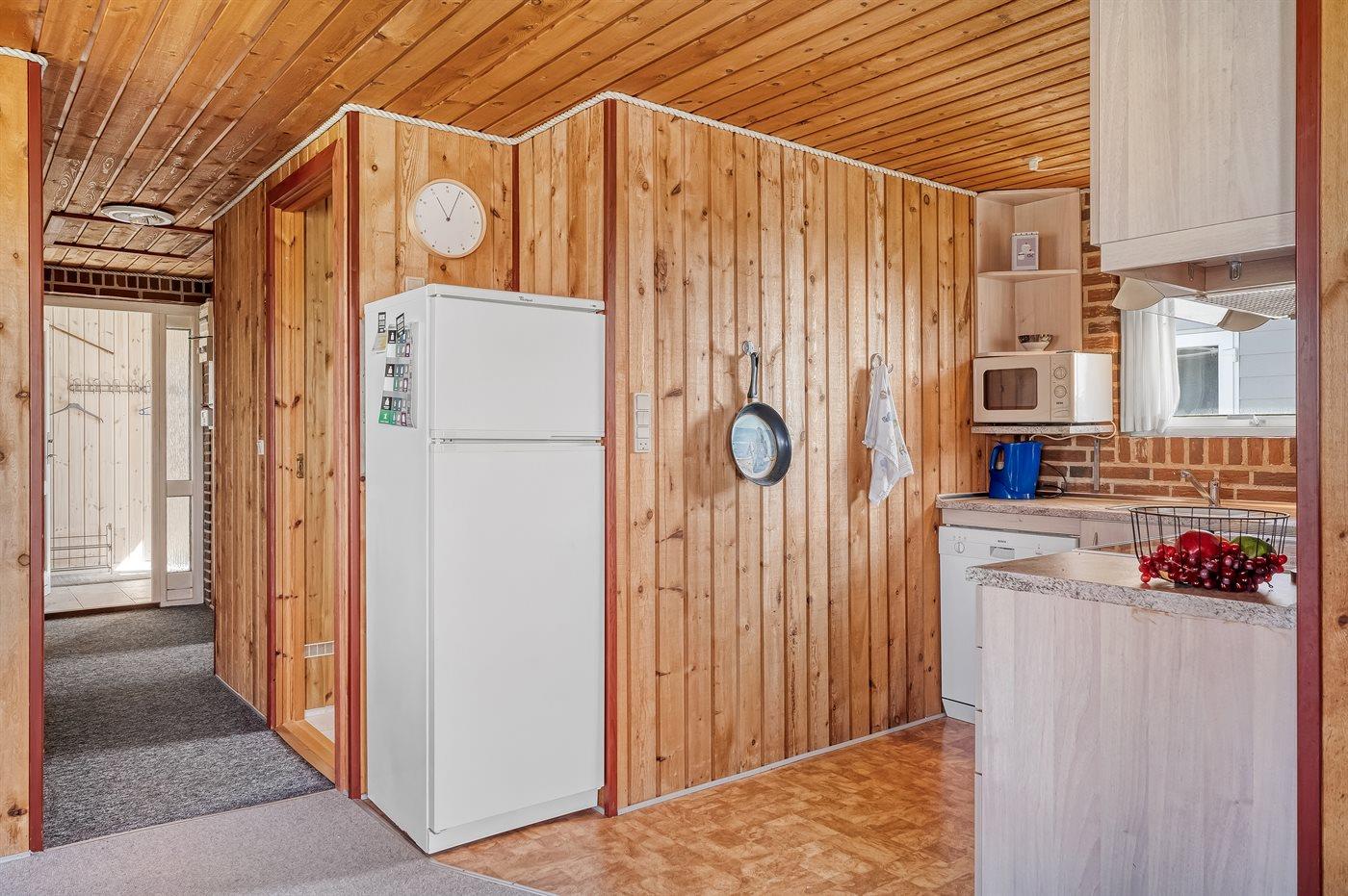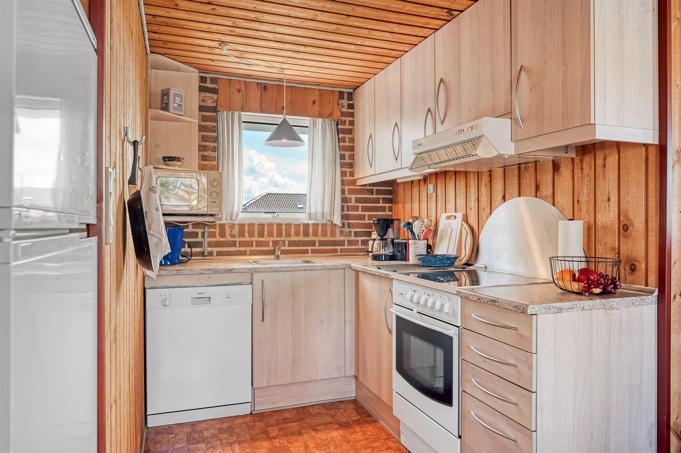 Køkkenet er udstyret med 1 køleskab. Der er 4 keramiske kogeplader, varmluftovn, mikrobølgeovn samt opvaskemaskine.