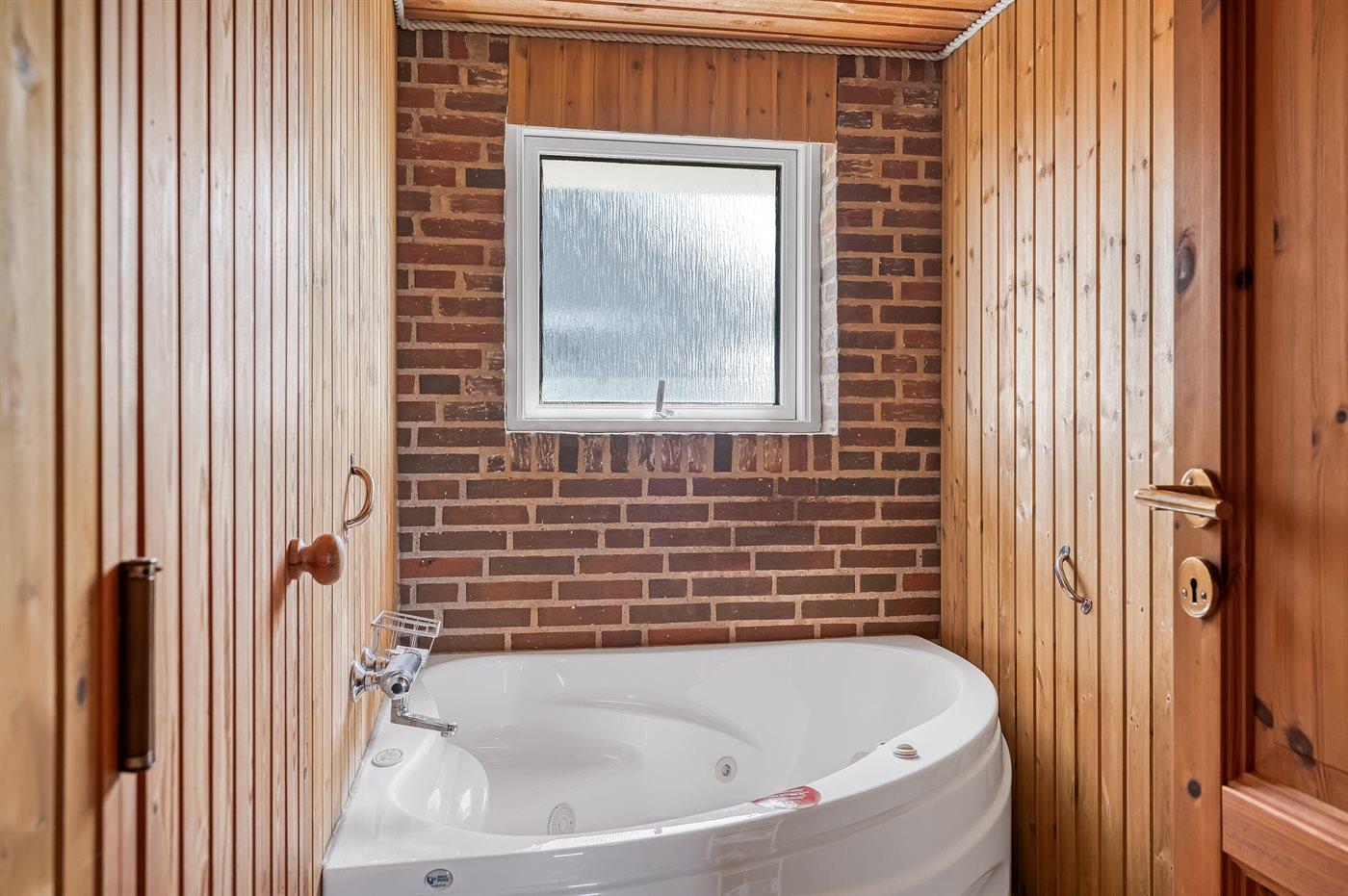 Der er 1 badeværelse med bruser og 1 toilet.. Der er gulvvarme på 1 badeværelse. I saunaen er der mulighed for afslapning.