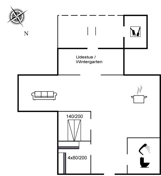 Der er 1 badeværelse med bruseniche og 1 toilet. I saunaen er der mulighed for afslapning.