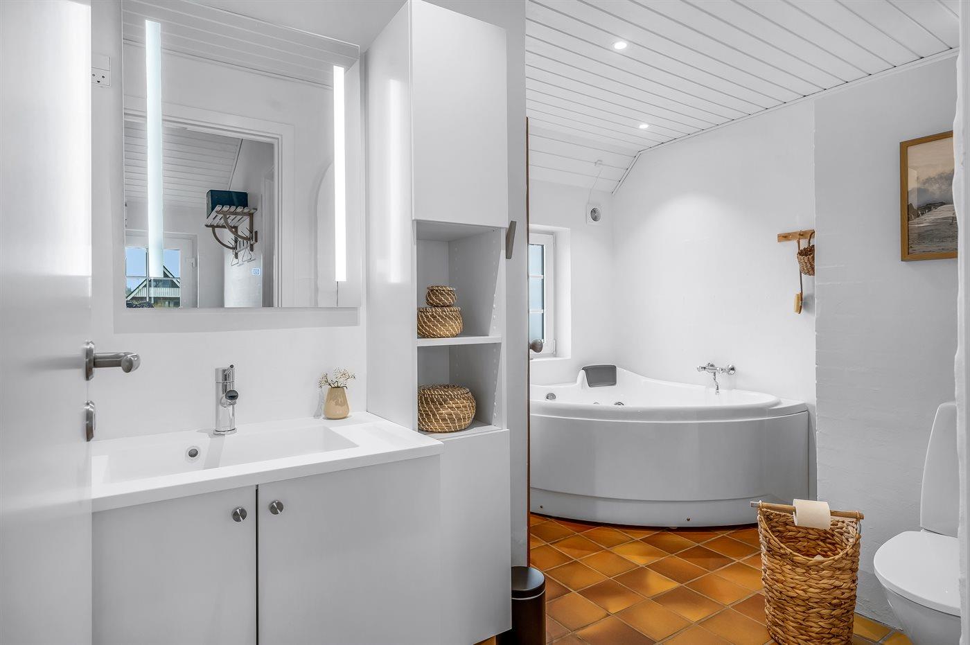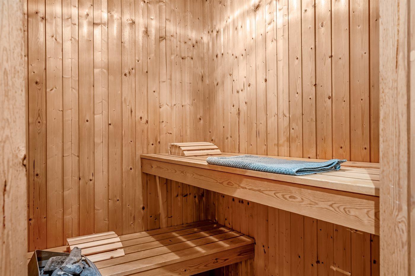 Der er 2 badeværelser med bruseniche og 2 toiletter, heraf 1 gæstetoilet. Der er gulvvarme på 1 badeværelse. Der er gulvvarme på gæstetoilettet. I saunaen er der mulighed for afslapning.