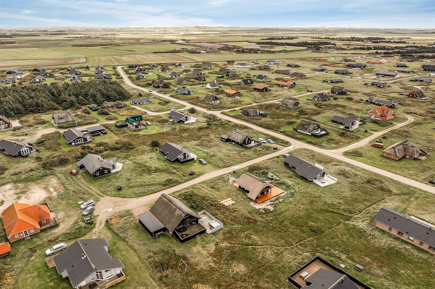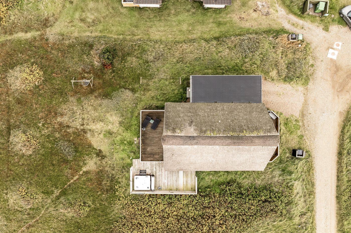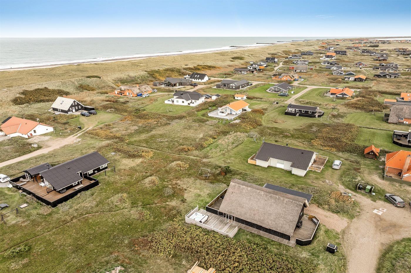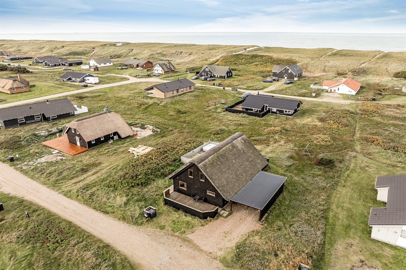 Ferieboligen er beliggende på en 1200 m² stor klitgrund. Der er 150 m til havet. Nærmeste forretning er beliggende i en afstand af 900 m. Til ferieboligen hører åbent og overdækket terrasseareal. Heraf i alt 25 m² lukket terrasse. Udgang til altan. Der er redskabsrum. Gynge. Udendørs bruser. Der er garage til rådighed. Der er installeret stik til opladning af elbil. Parkering ved ferieboligen.