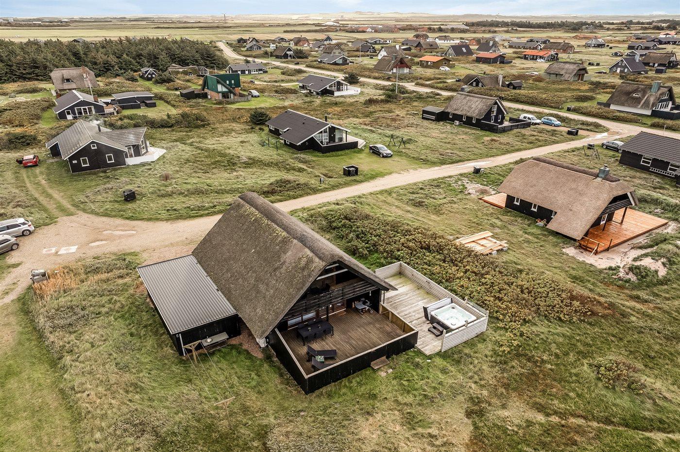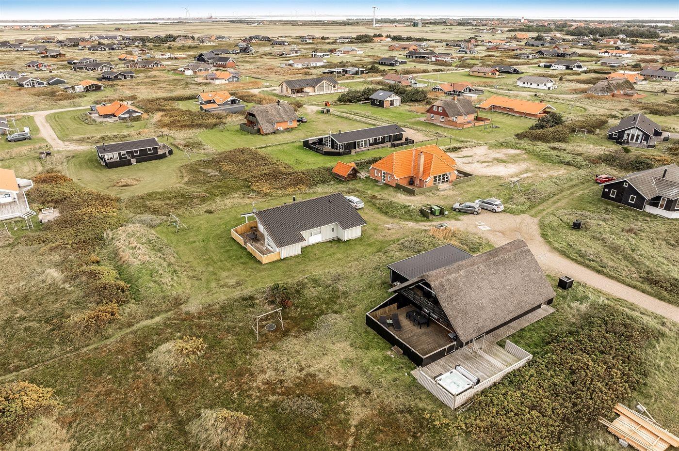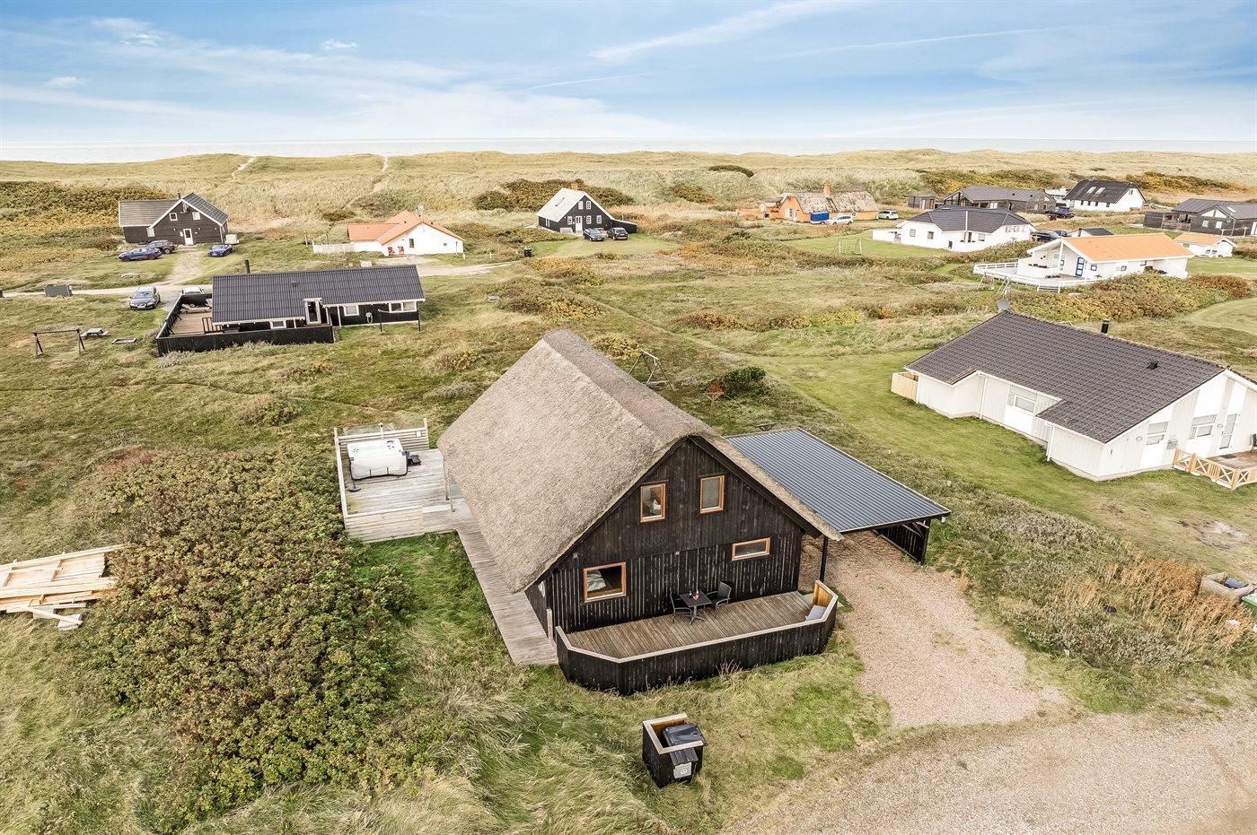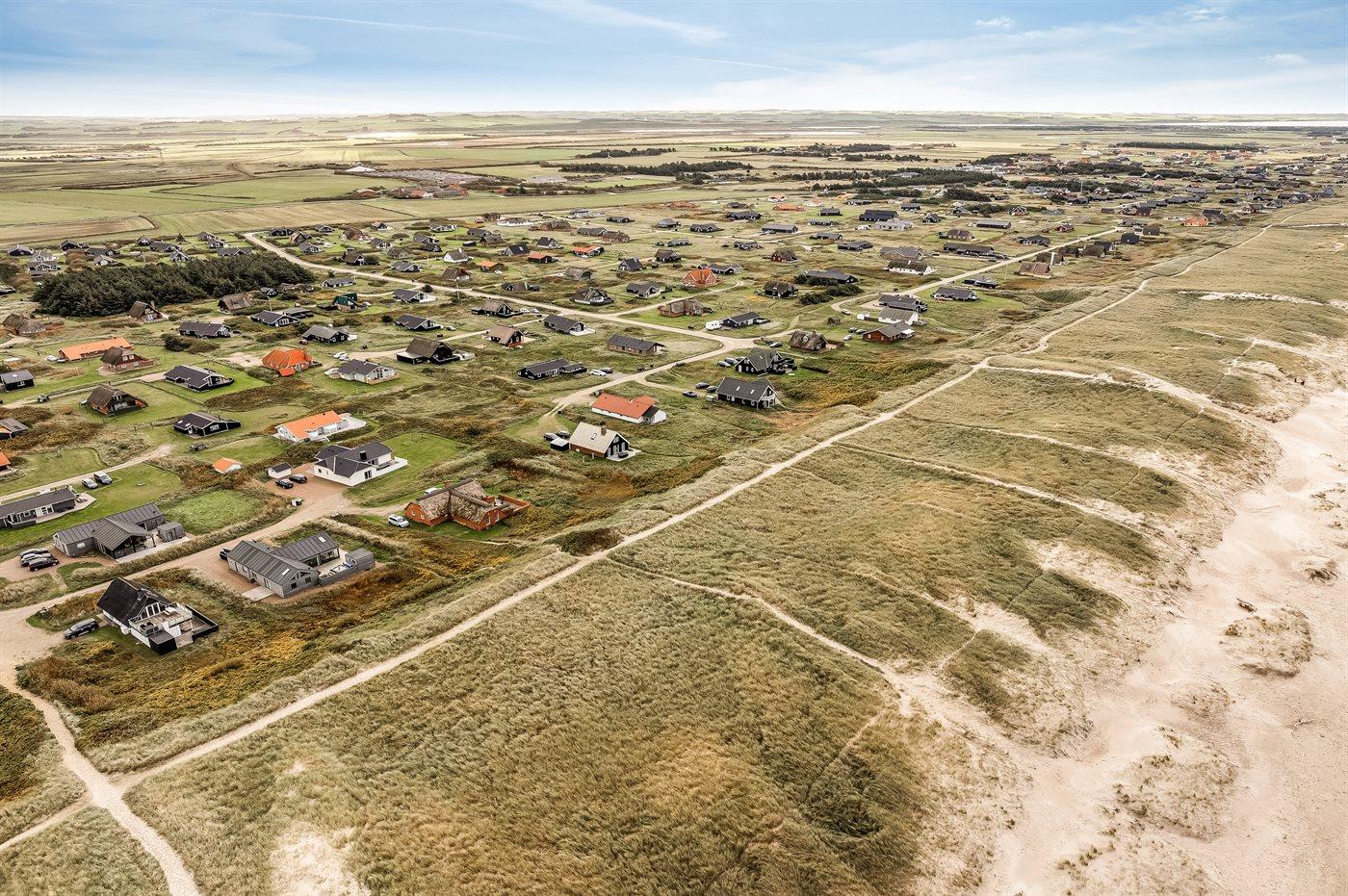 Ferieboligen er beliggende på en 1200 m² stor klitgrund. Der er 150 m til havet. Nærmeste forretning er beliggende i en afstand af 900 m. Til ferieboligen hører åbent og overdækket terrasseareal. Heraf i alt 25 m² lukket terrasse. Udgang til altan. Der er redskabsrum. Gynge. Udendørs bruser. Der er garage til rådighed. Der er installeret stik til opladning af elbil. Parkering ved ferieboligen.