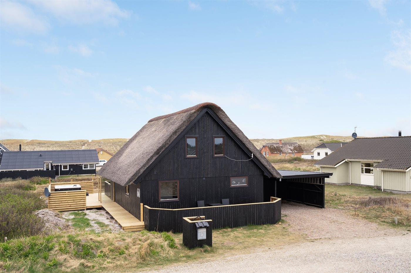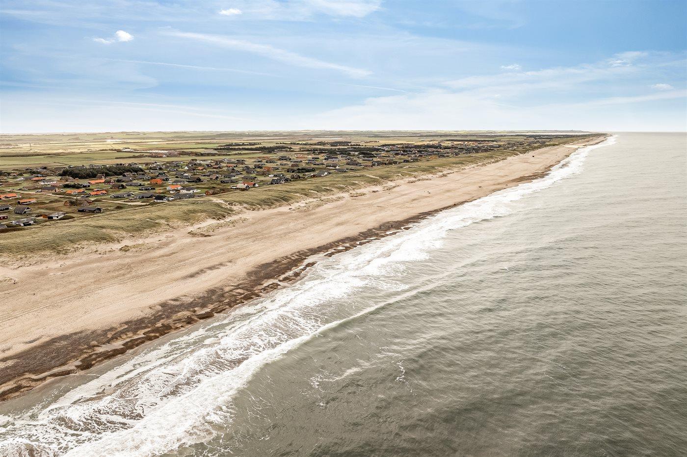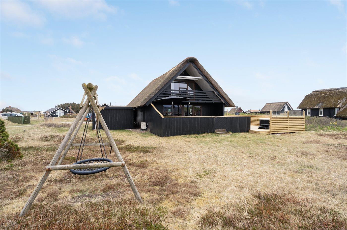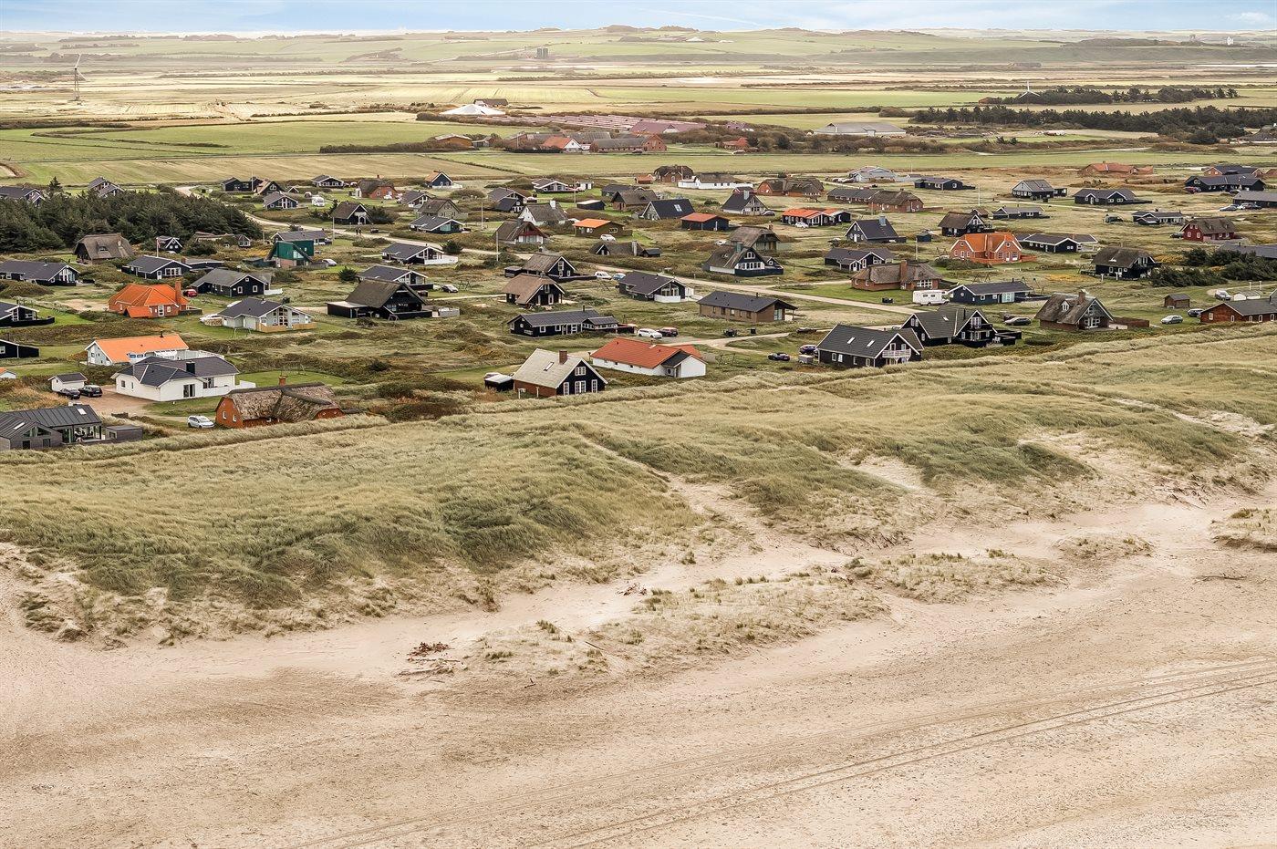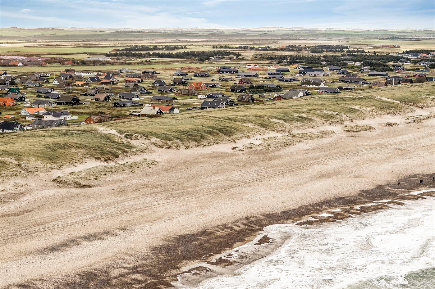 Ferieboligen er beliggende på en 1200 m² stor klitgrund. Der er 150 m til havet. Nærmeste forretning er beliggende i en afstand af 900 m. Til ferieboligen hører åbent og overdækket terrasseareal. Heraf i alt 25 m² lukket terrasse. Udgang til altan. Der er redskabsrum. Gynge. Udendørs bruser. Der er garage til rådighed. Der er installeret stik til opladning af elbil. Parkering ved ferieboligen.