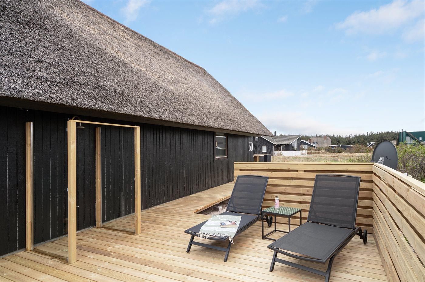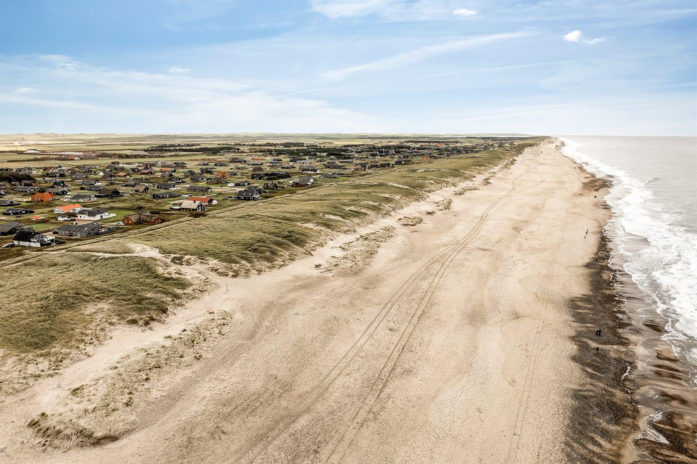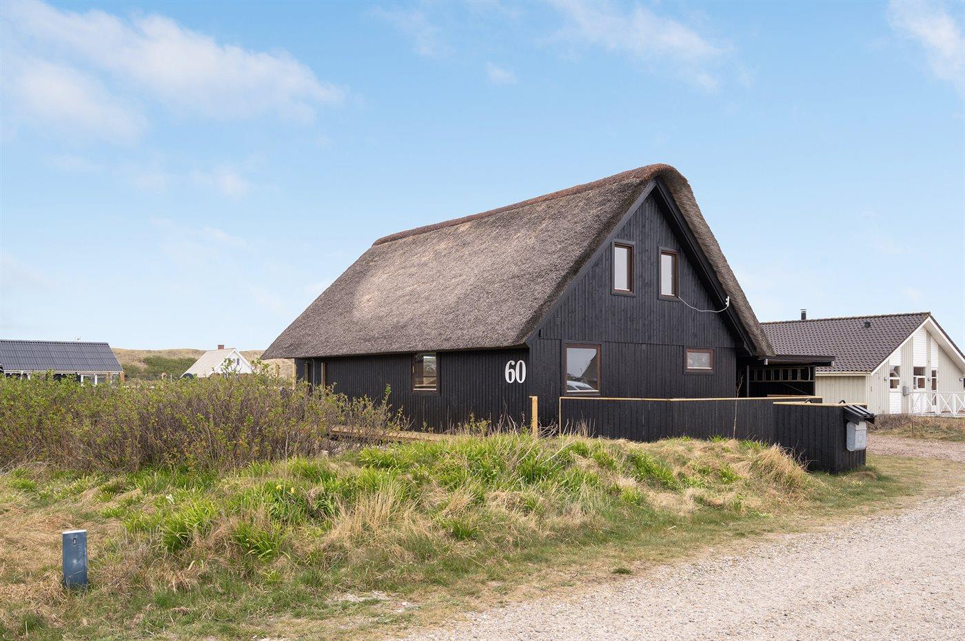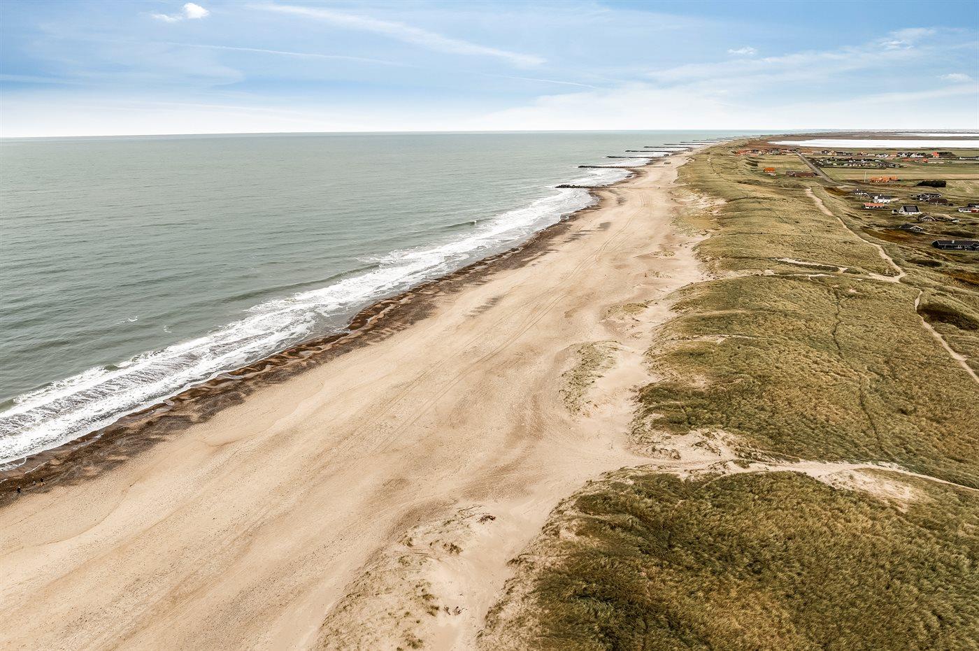 Ferieboligen er beliggende på en 1200 m² stor klitgrund. Der er 150 m til havet. Nærmeste forretning er beliggende i en afstand af 900 m. Til ferieboligen hører åbent og overdækket terrasseareal. Heraf i alt 25 m² lukket terrasse. Udgang til altan. Der er redskabsrum. Gynge. Udendørs bruser. Der er garage til rådighed. Der er installeret stik til opladning af elbil. Parkering ved ferieboligen.