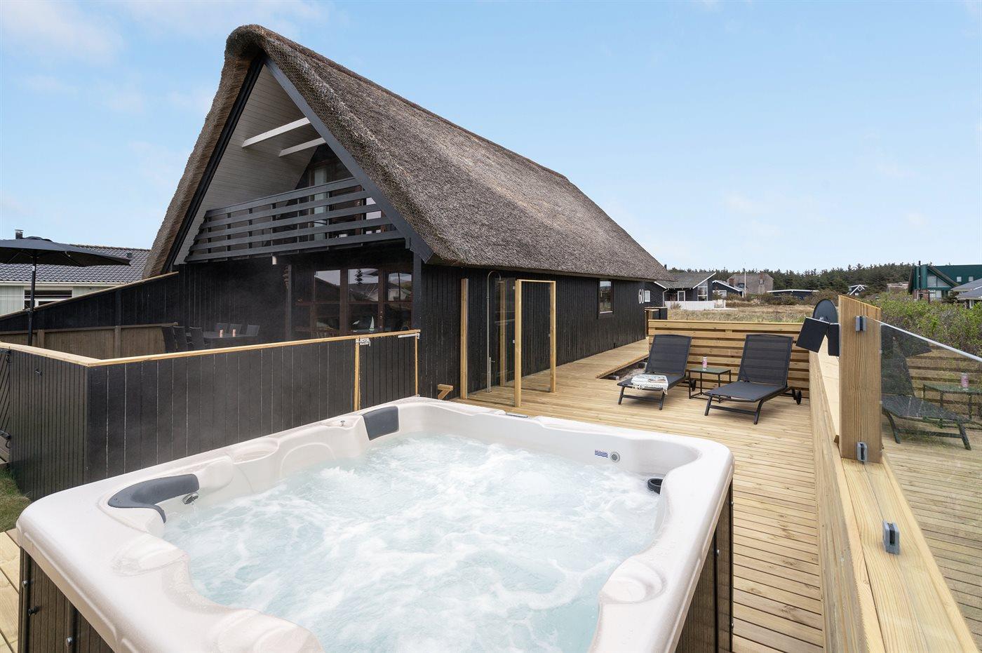 Velholdt sommerhus tæt på Vesterhavet med spa, sauna og aktivitetsrum i rolige omgivelser.