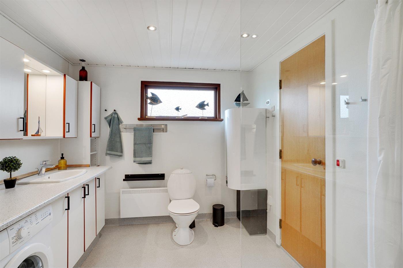Der er 1 badeværelse med bruseniche og 1 toilet.. Der er gulvvarme på 1 badeværelse. I saunaen er der mulighed for afslapning.
