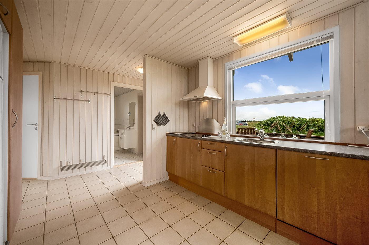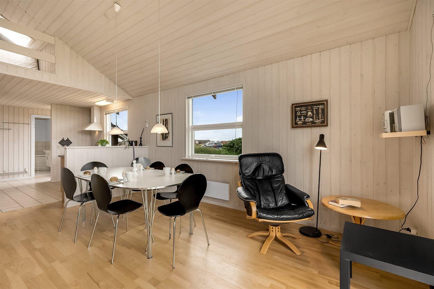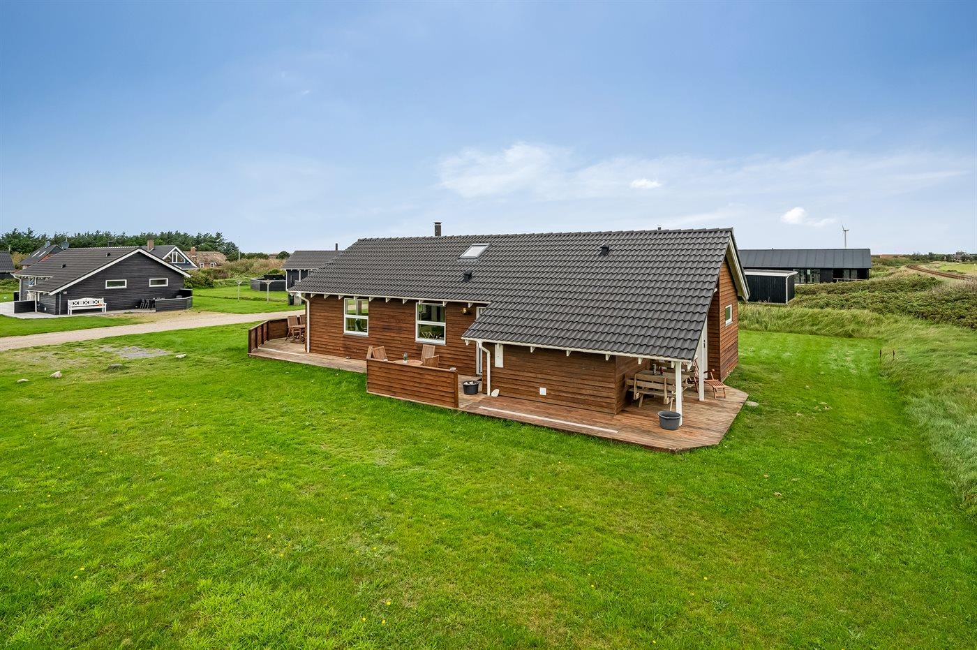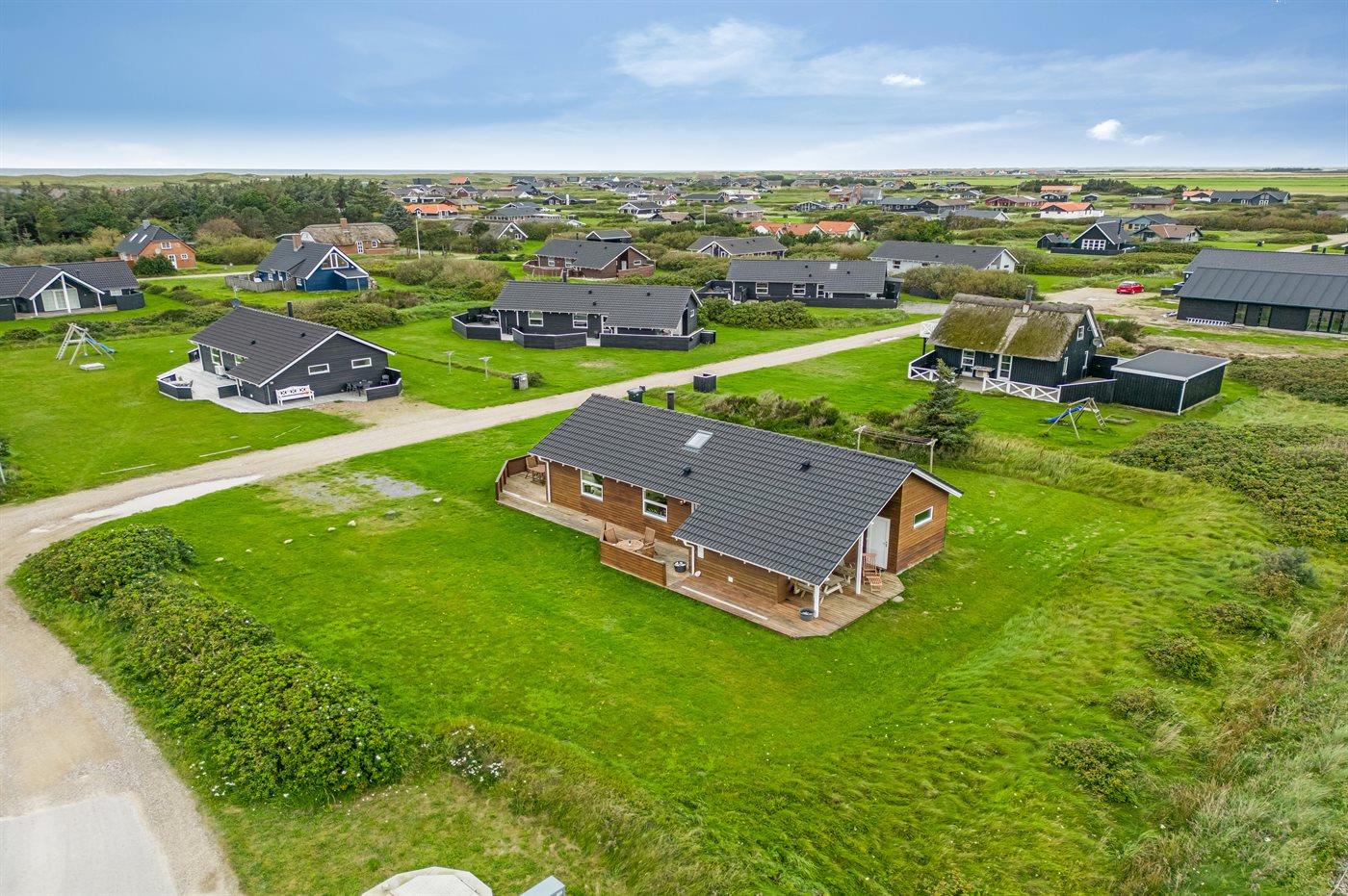 Yderst velholdt spahus kun 10 min. gang fra Vesterhavet, der uanset årstiden er en oplevelse i sig selv. Huset er funktionelt og moderne indrettet med dejligt stort køkken/alrum. Over køkkenet er der hems, der for børnene vil være en hyggelig hule, hvor man kan sove og være sig selv. I det store badeværelse med gulvvarme er der 2-pers. spabad og direkte adgang til saunaen. Køkkenet er velfungerende med bl.a. opvaskemaskine, varmluftovn og komfur med keramiske kogeplader. I stuen er der TV med parabol (digital), DVD-afspiller, CD-afspiller, brændeovn samt udgang til en stor træterrasse. Husets sovepladser fordeler sig på 2 soveværelser med dobbeltseng og 1 værelse med 2 enkeltsenge. Desuden hems med 2 sovepladser. Værelserne har gode senge og rummelige skabe til opbevaring af tøj, etc. Gratis, trådløs internetforbindelse (egen computer skal medbringes). I umiddelbar nærhed af huset findes gode indkøbsmuligheder, lysestøbere, hvor man selv kan fremstille sine stearinlys. Alt i alt en god base for en vellykket ferie, hvor afslapning og oplevelser er sat i højsædet.