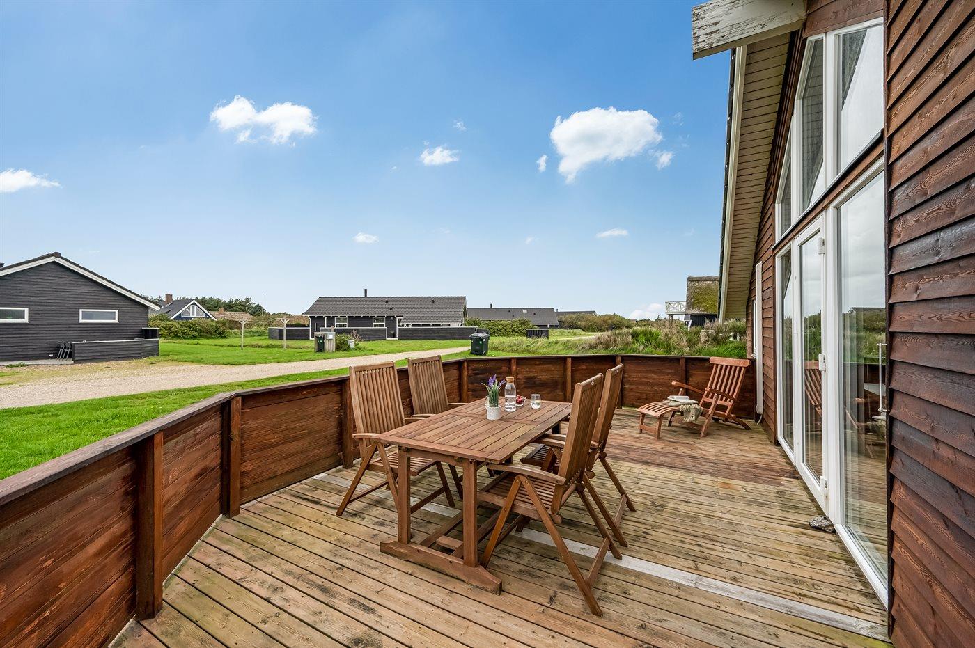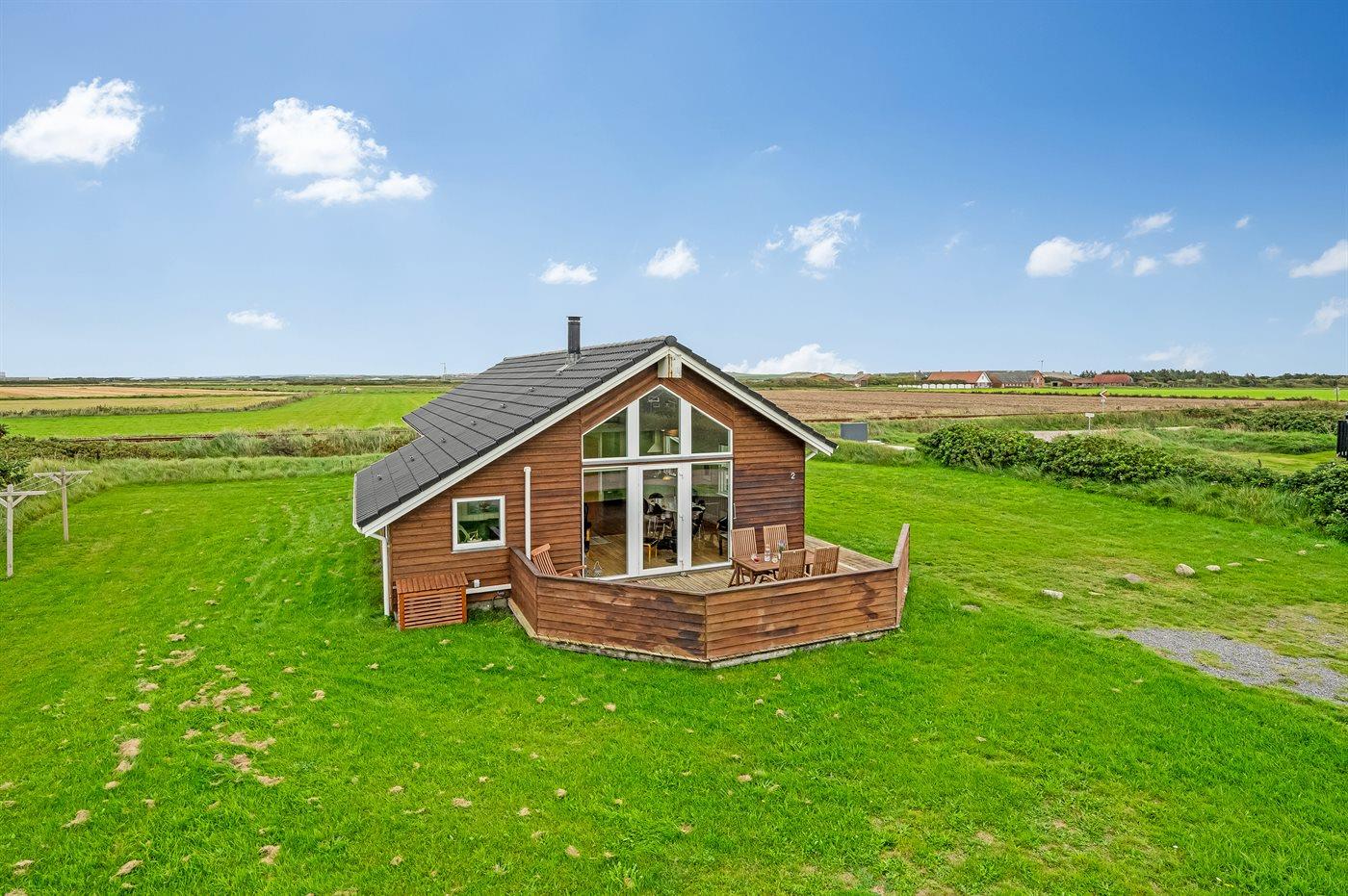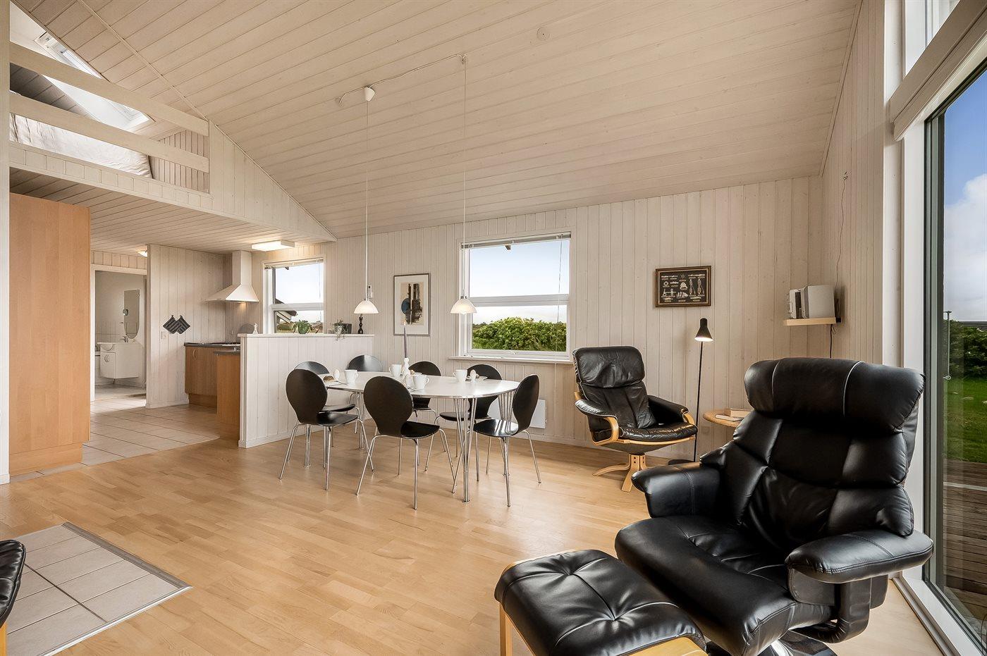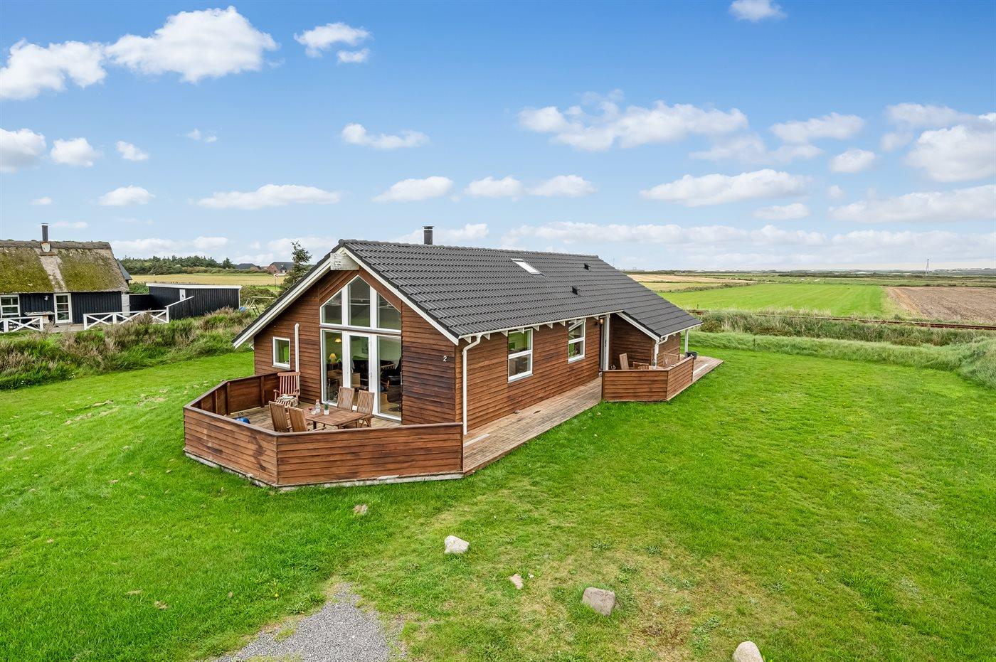 Yderst velholdt spahus kun 10 min. gang fra Vesterhavet, der uanset årstiden er en oplevelse i sig selv. Huset er funktionelt og moderne indrettet med dejligt stort køkken/alrum. Over køkkenet er der hems, der for børnene vil være en hyggelig hule, hvor man kan sove og være sig selv. I det store badeværelse med gulvvarme er der 2-pers. spabad og direkte adgang til saunaen. Køkkenet er velfungerende med bl.a. opvaskemaskine, varmluftovn og komfur med keramiske kogeplader. I stuen er der TV med parabol (digital), DVD-afspiller, CD-afspiller, brændeovn samt udgang til en stor træterrasse. Husets sovepladser fordeler sig på 2 soveværelser med dobbeltseng og 1 værelse med 2 enkeltsenge. Desuden hems med 2 sovepladser. Værelserne har gode senge og rummelige skabe til opbevaring af tøj, etc. Gratis, trådløs internetforbindelse (egen computer skal medbringes). I umiddelbar nærhed af huset findes gode indkøbsmuligheder, lysestøbere, hvor man selv kan fremstille sine stearinlys. Alt i alt en god base for en vellykket ferie, hvor afslapning og oplevelser er sat i højsædet.