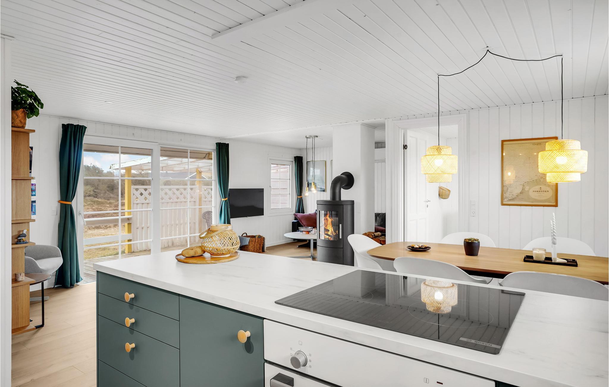 Kun en lille gåtur fra Vesterhavet ligger dette hyggelige sommerhus, hvor I kan holde en ferie, der både byder på afslapning og naturoplevelser. Nyd den vide udsigt over klitlandskabet gennem vinduerne. Slå jer ned i den hyggelige opholdsstue og slap af foran den knitrende ild i brændeovnen efter en lang dag på farten. Det lyse, åbne køkken lægger op til at lave maden sammen. I kommer til at fylde ferien med skønne wellness-øjeblikke. Læn jer tilbage i det indendørs spabad og saunaen eller nyd en afslappende stund med vand- og luftmassage i vildmarksbadet.