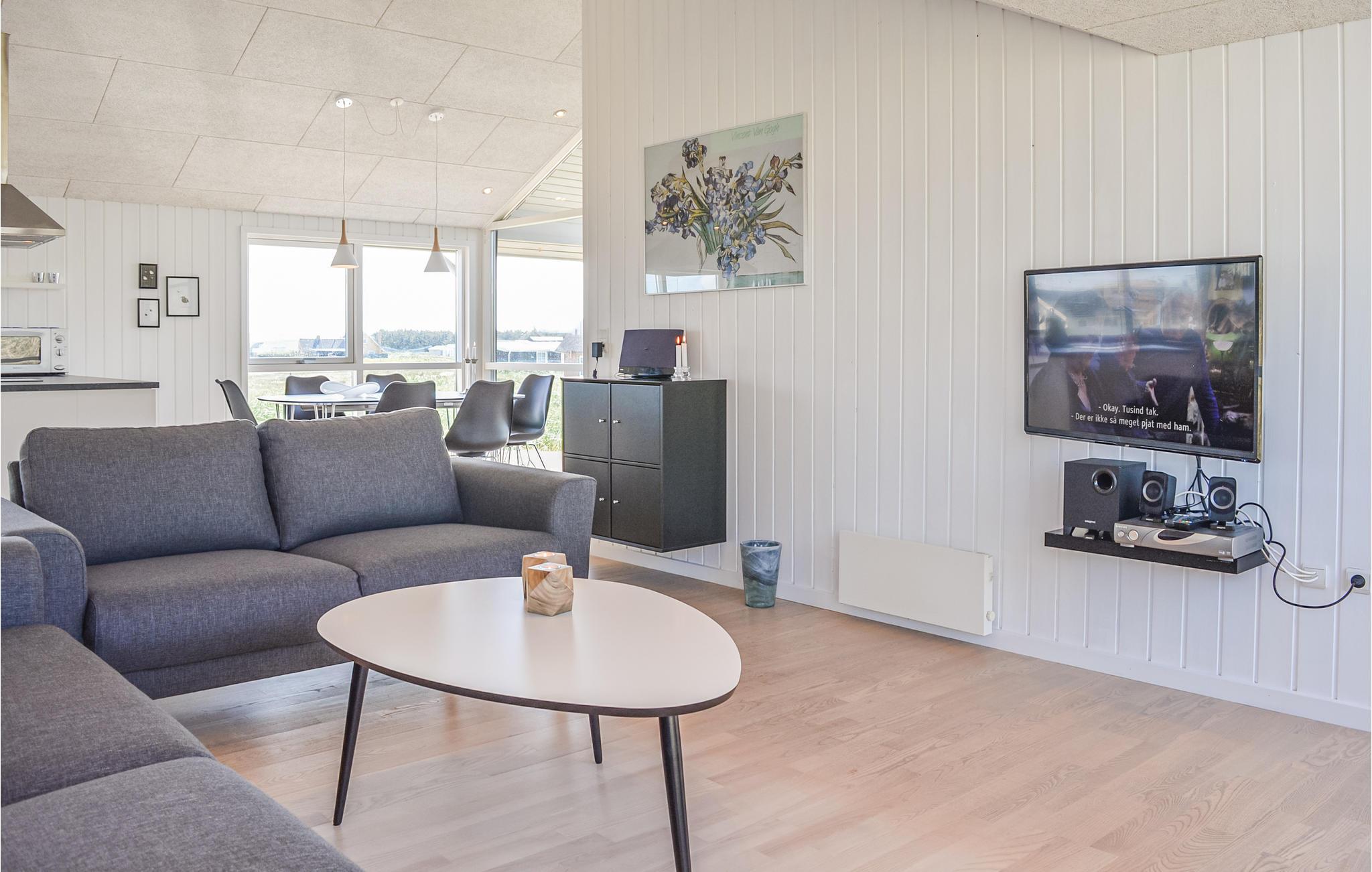Dette flotte sommerhus har en helt perfekt beliggenhed i første klitrække, blot 50 meter fra det smukke Vesterhav med de hvide sandstrande. Huset har et godt lysindfald og er pænt indrettet med et godt køkken/alrum samt en stue med brændeovn og fladskærms-tv. Her findes desuden et stort badeværelse med spabad og sauna. Tre gode soveværelser med dobbeltsenge og enkeltsenge. Stranden ved Vrist er helt perfekt, og her kan mange timer gå med solbadning, svømning eller gåture.
