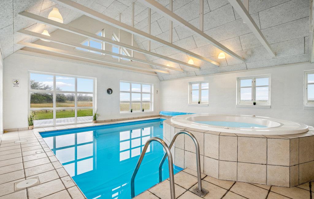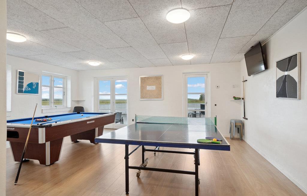 Stort aktivitetshus ved Vesterhavet med pool, spabad, sportsfaciliteter og smuk udsigt til klitter og natur.