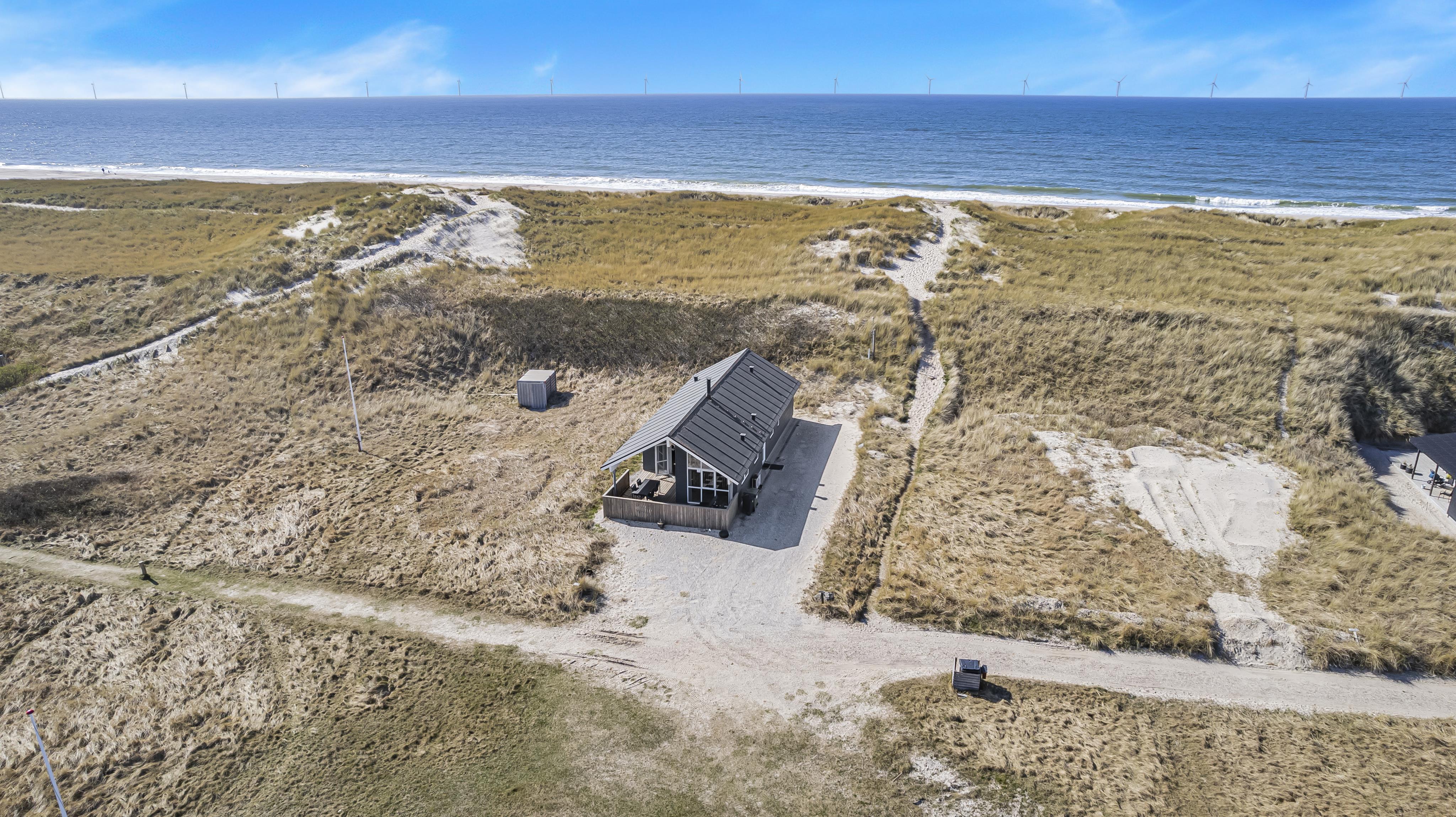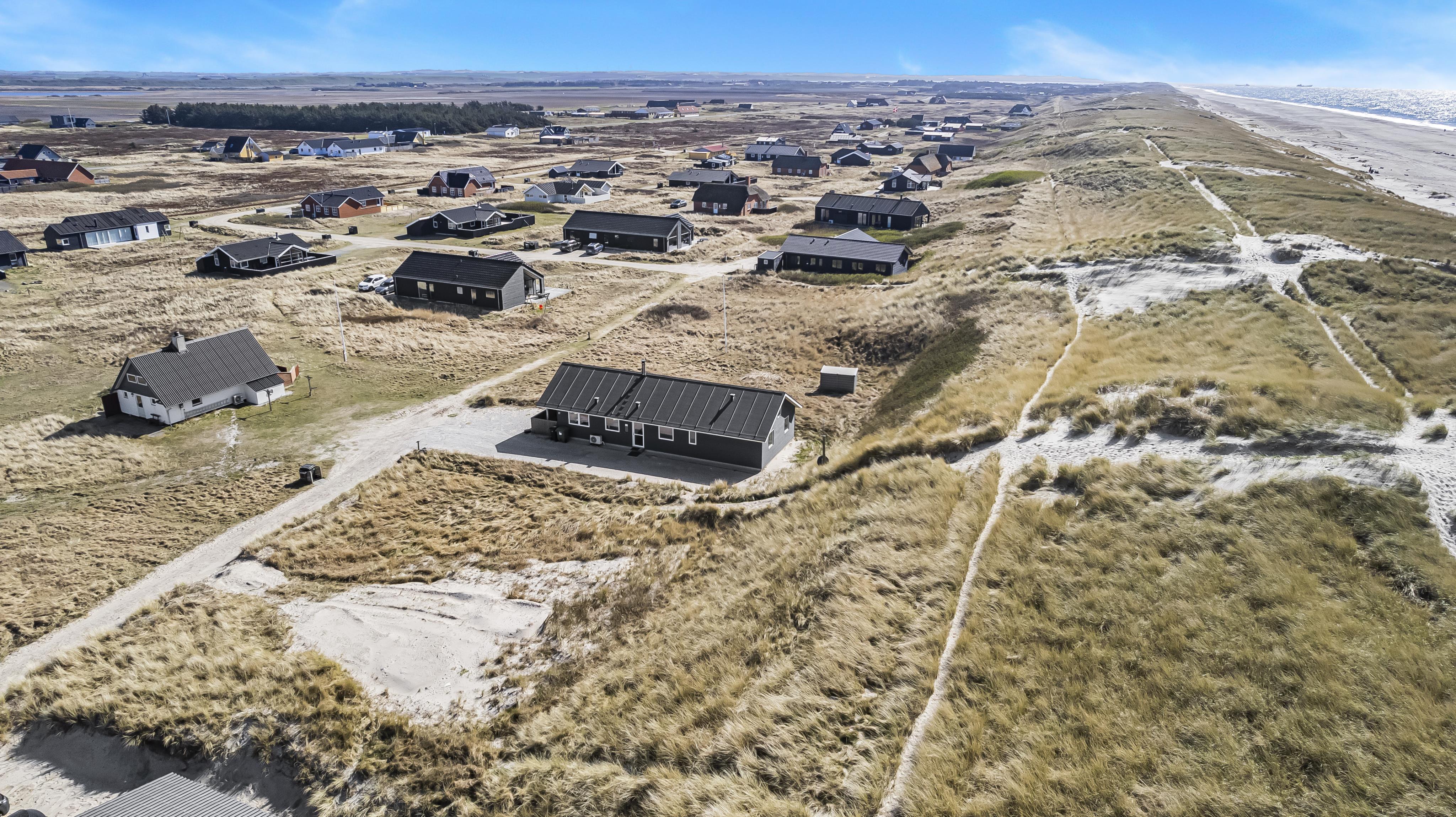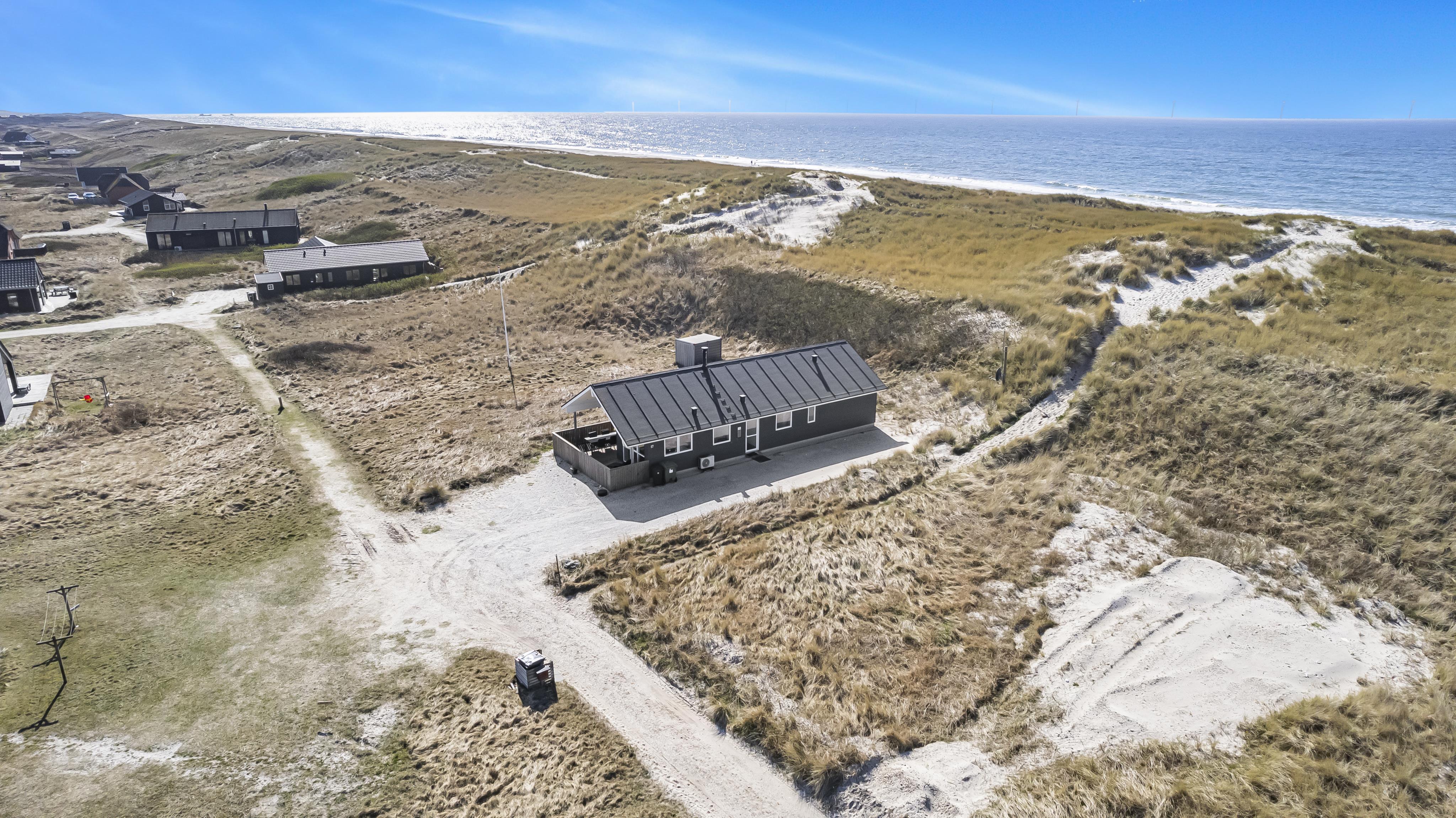 Udgang til delvis overdækket morgenterrasse samt yderligere terrasse med havemøbler og liggestole. Beliggende for enden af en blind vej, kun ca. 50m fra Vesterhavet på en ca. 1.000 m2 grund bag Vesterhavets høje klitter.
