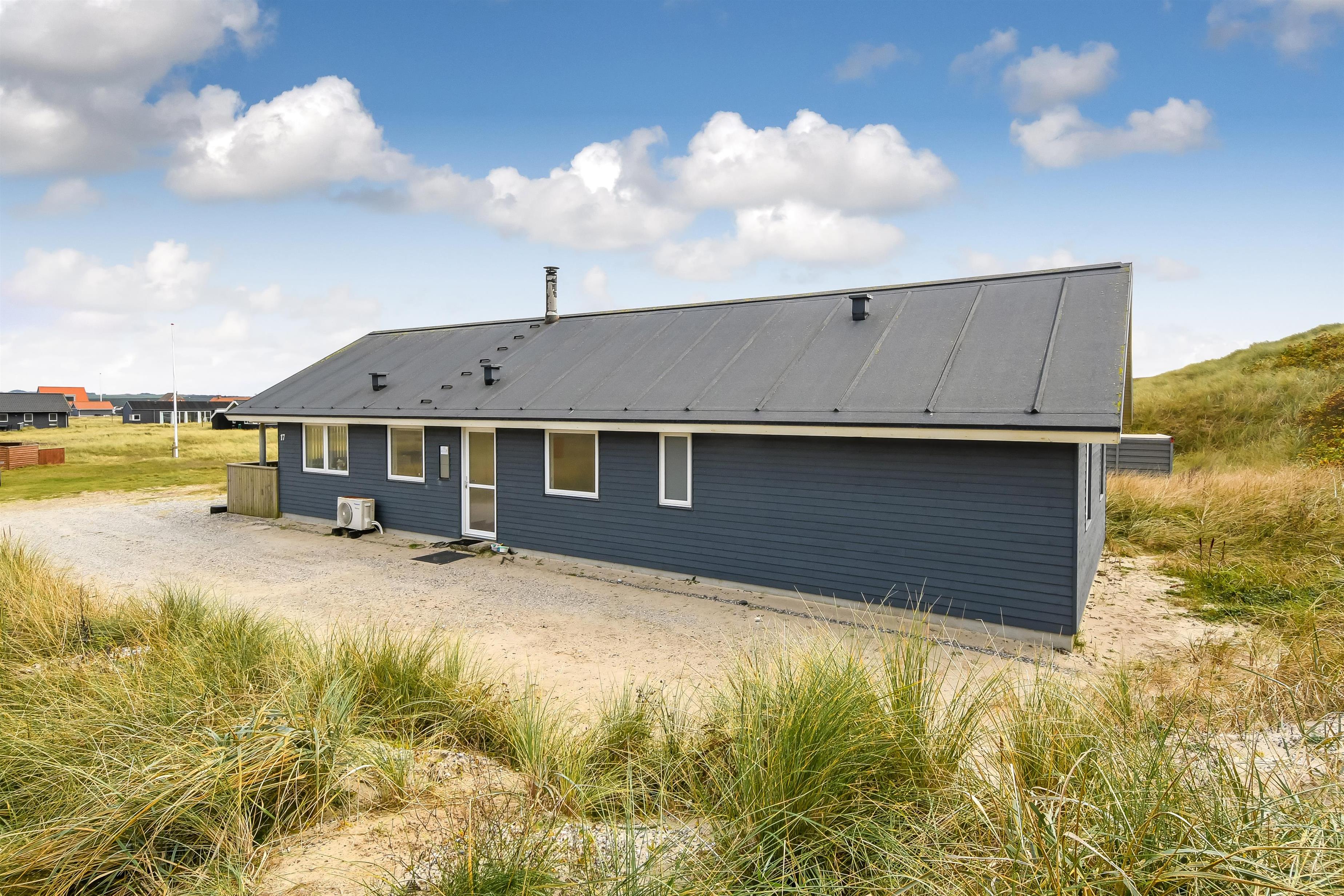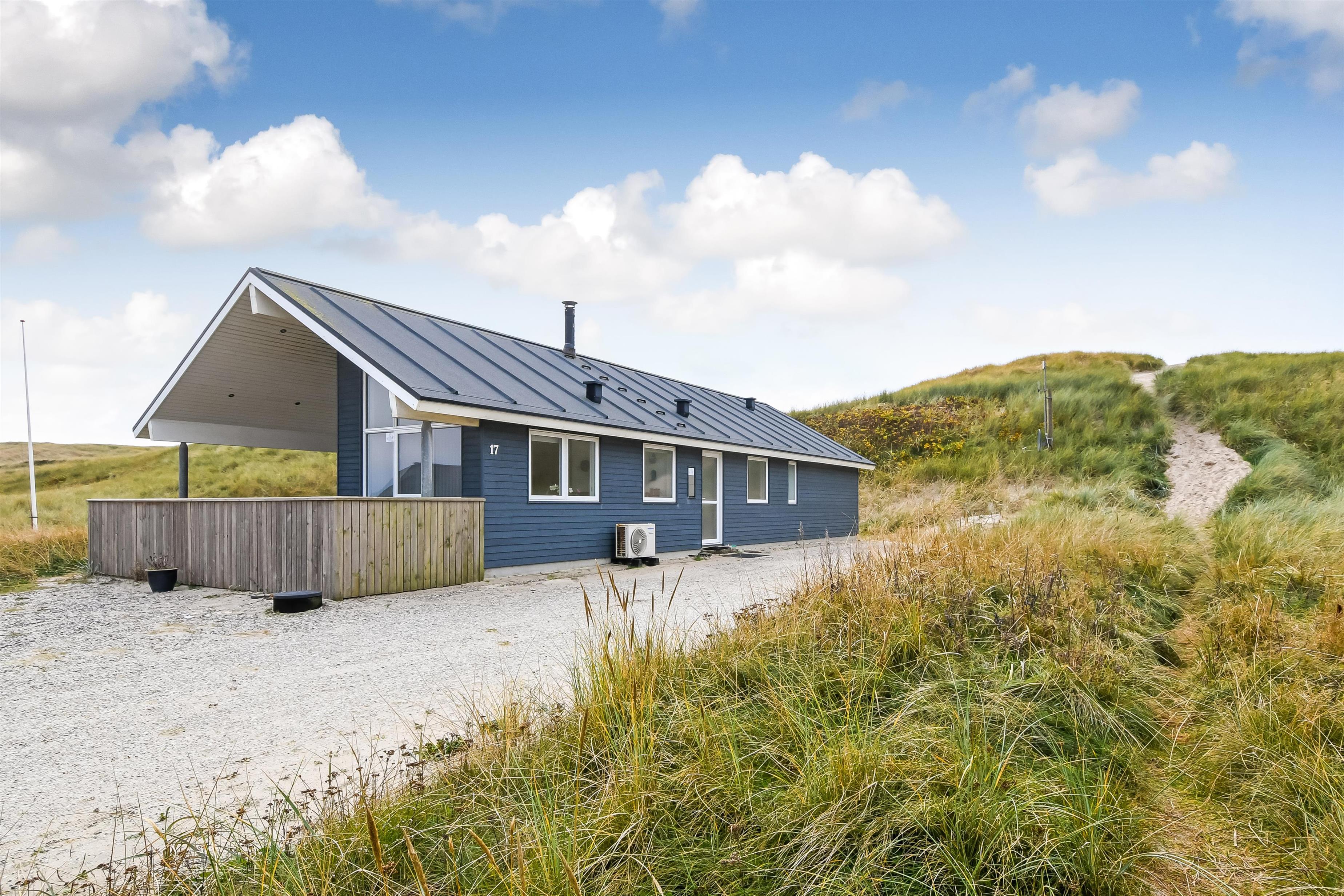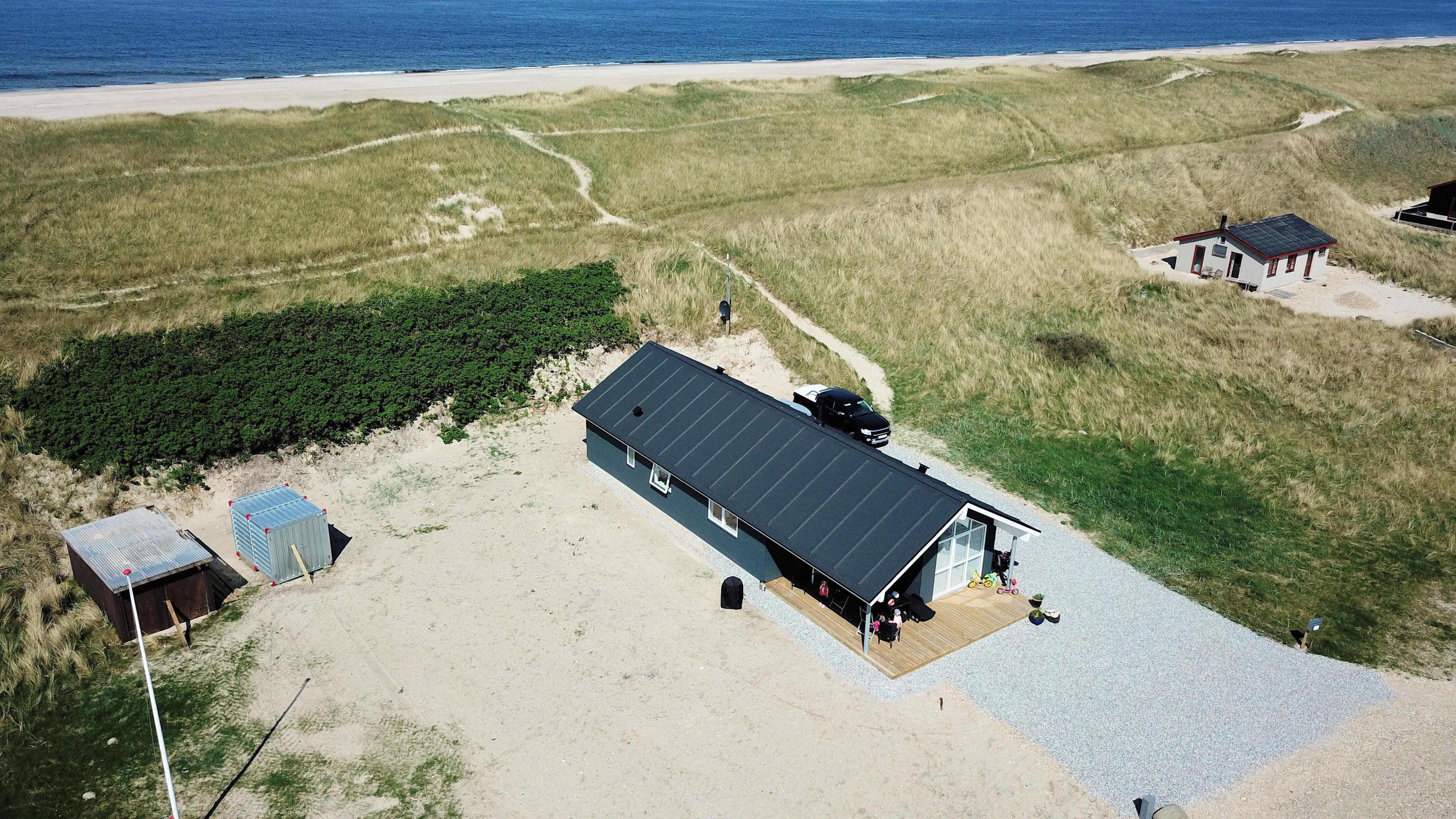 Udgang til delvis overdækket morgenterrasse samt yderligere terrasse med havemøbler og liggestole. Beliggende for enden af en blind vej, kun ca. 50m fra Vesterhavet på en ca. 1.000 m2 grund bag Vesterhavets høje klitter.