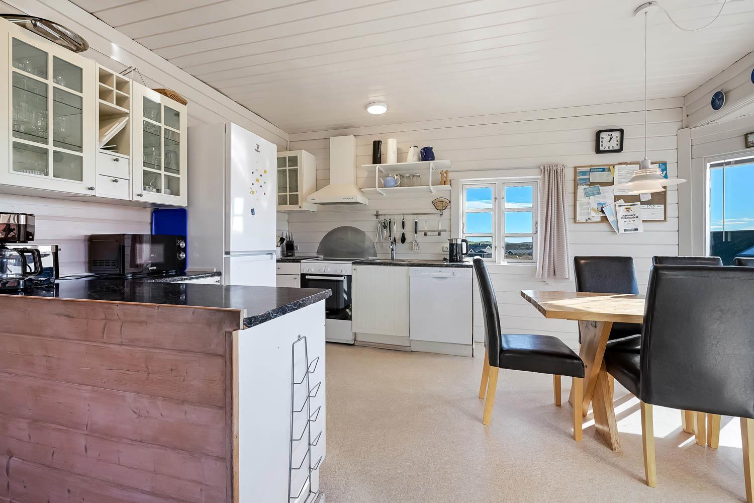 Huset er smagfuldt møbleret og indrettet med fokus på komfort og afslapning. I stuen finder du en hyggelig brændeovn, F-TV med parabol, DVD og stereoanlæg med CD, perfekt til hyggelige aftener. Det veludstyrede køkken har el-komfur, køle-/fryseskab, mikroovn og opvaskemaskine, så madlavningen bliver en leg.