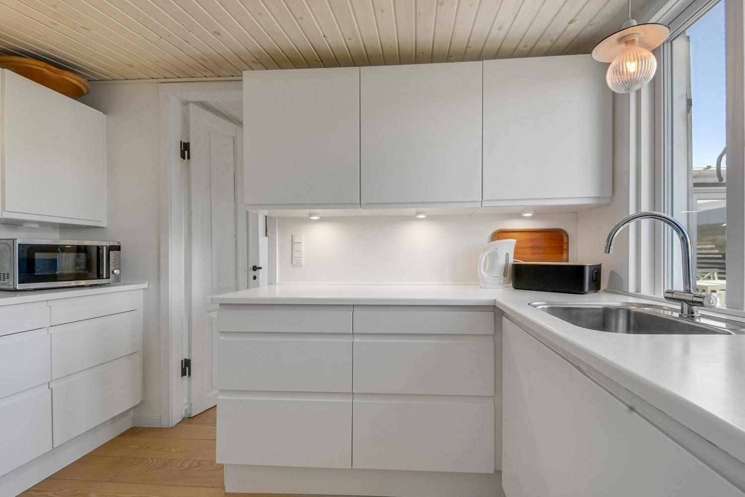 Charmerende træsommerhus på 110m2 som er meget personligt og hyggeligt indrettet. Huset er i 2 etager og renoveret i 2009. Dejlig stor stue som er indrettet med polstermøbler, TV med danske og tyske kanaler samt mulighed for at streame TV / Radio / Apps som I selv har et abonnement til, og en dejlig brændeovn og varmepumpe som begge giver en dejlig varme og er medvirkende til en lavere forbrugsafregning. Pænt nyere køkken med opvaskemaskine, glaskeramisk komfur, emhætte, mikroovn, køle-/fryseskab. 3 soverum: 1DS + 2S og på 1. sal er der et soverum med 1DS – der er håndvask i alle soverum. Badeværelse med toilet, håndvask og bruser samt klinkegulv. Ekstra rum med vaskemaskine, tørretumbler og 1 sovesofa. Ikke rygerhus. Gratis internetadgang.