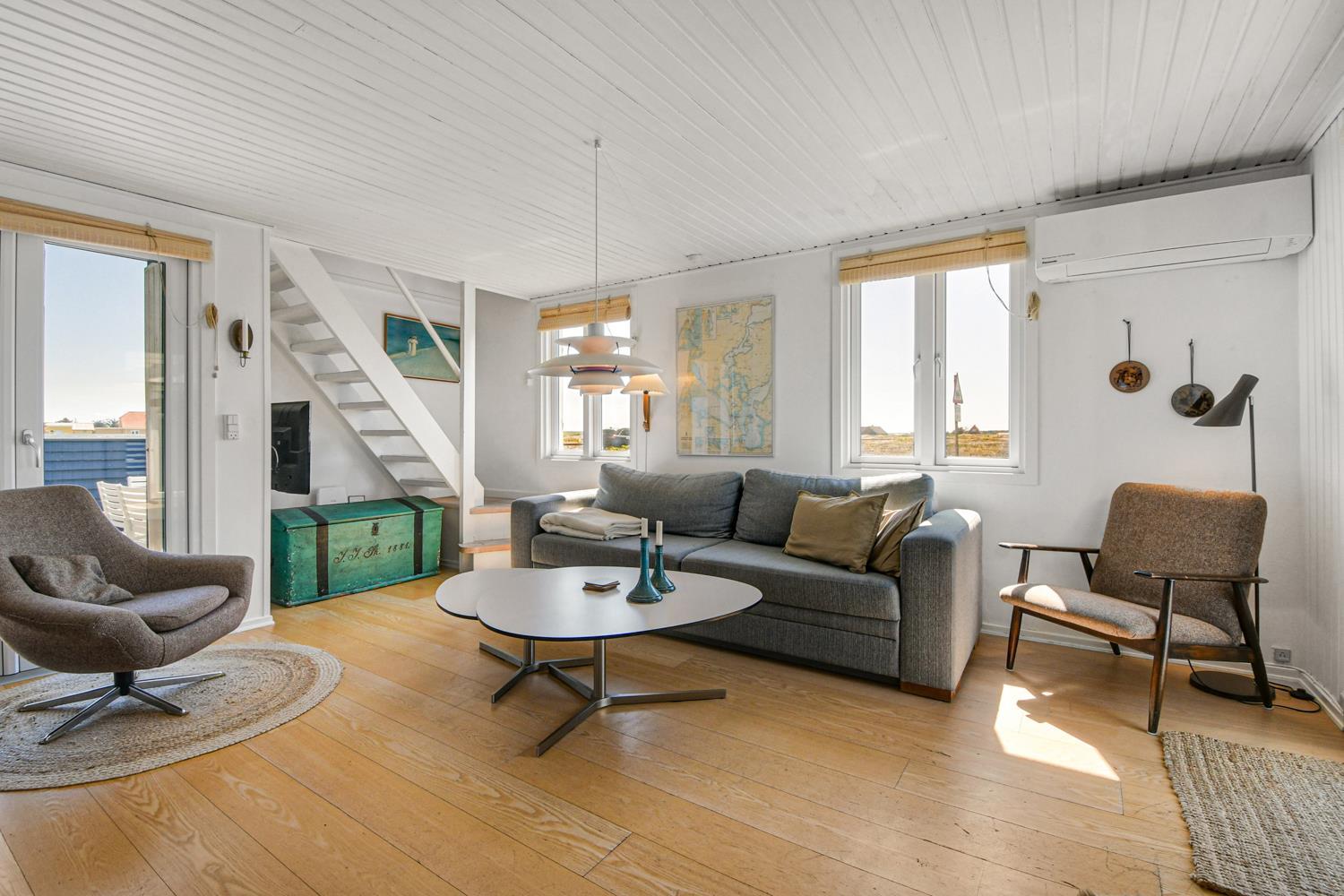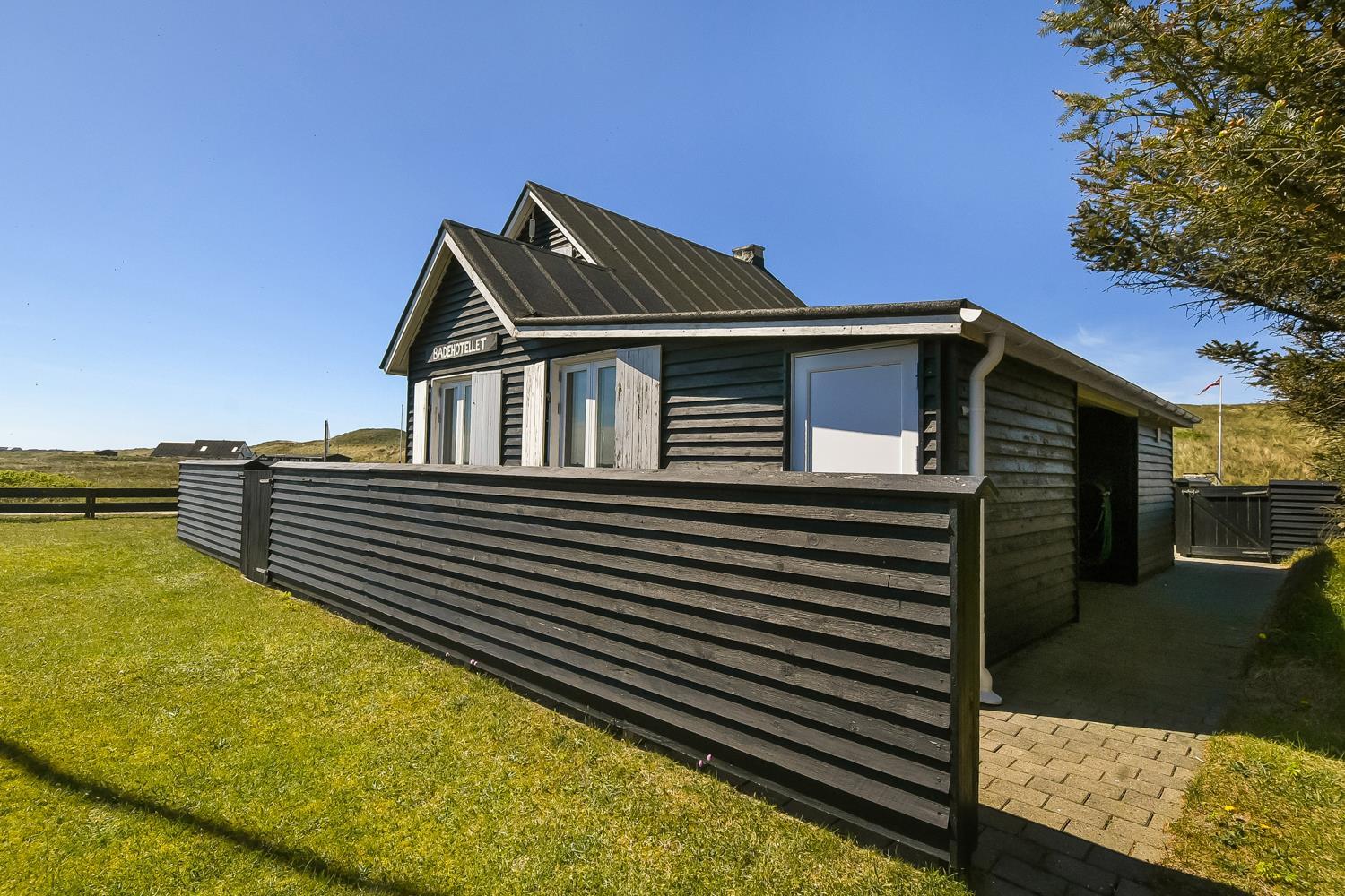 Tæt på Vesterhavet – kun 100 meter fra stranden – ligger dette smukke og velindrettede feriehus i 2 etager på en 1042 m2 klitgrund. Et rigtig charmerende sommerhus i bedste ”badehotel-stil”.