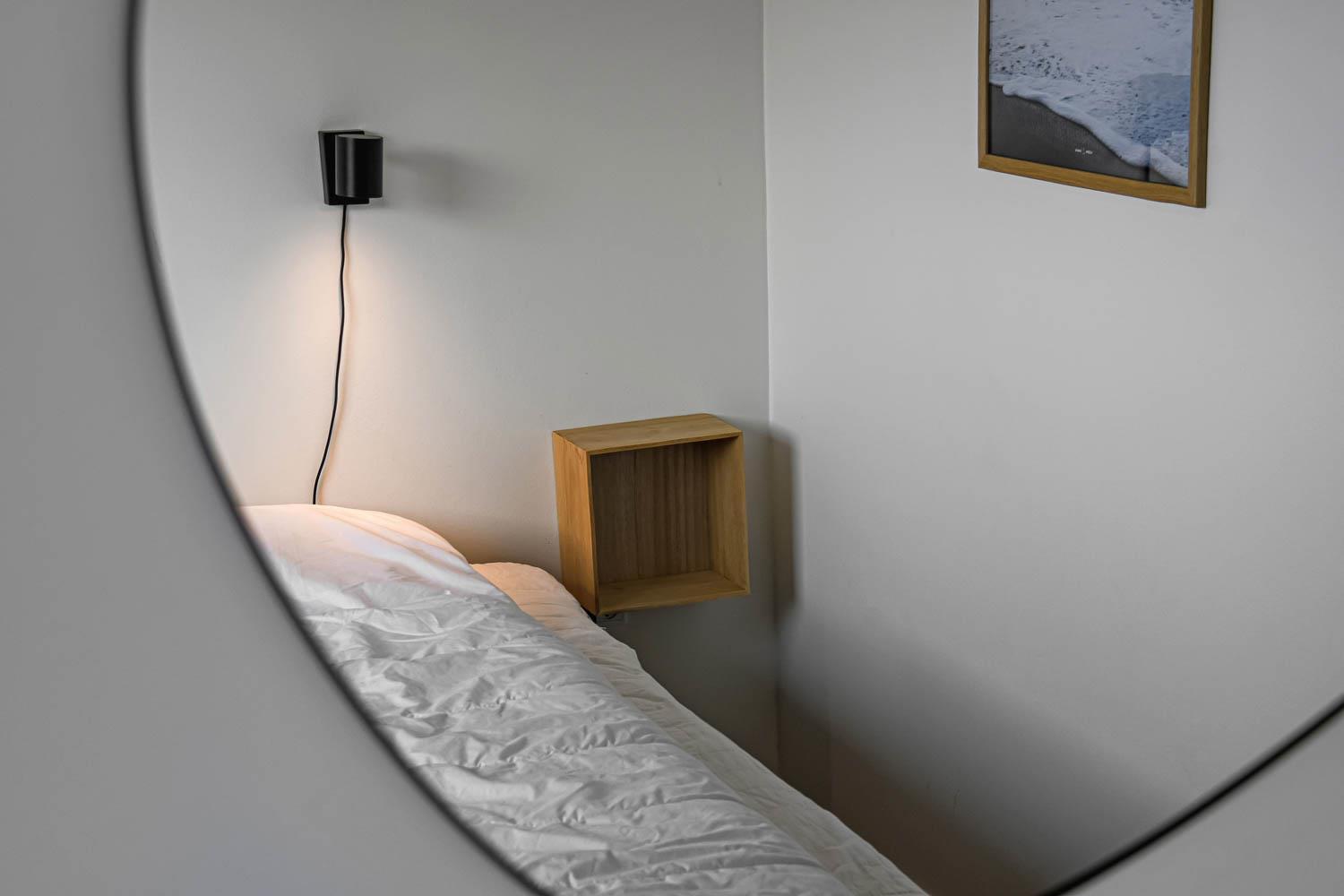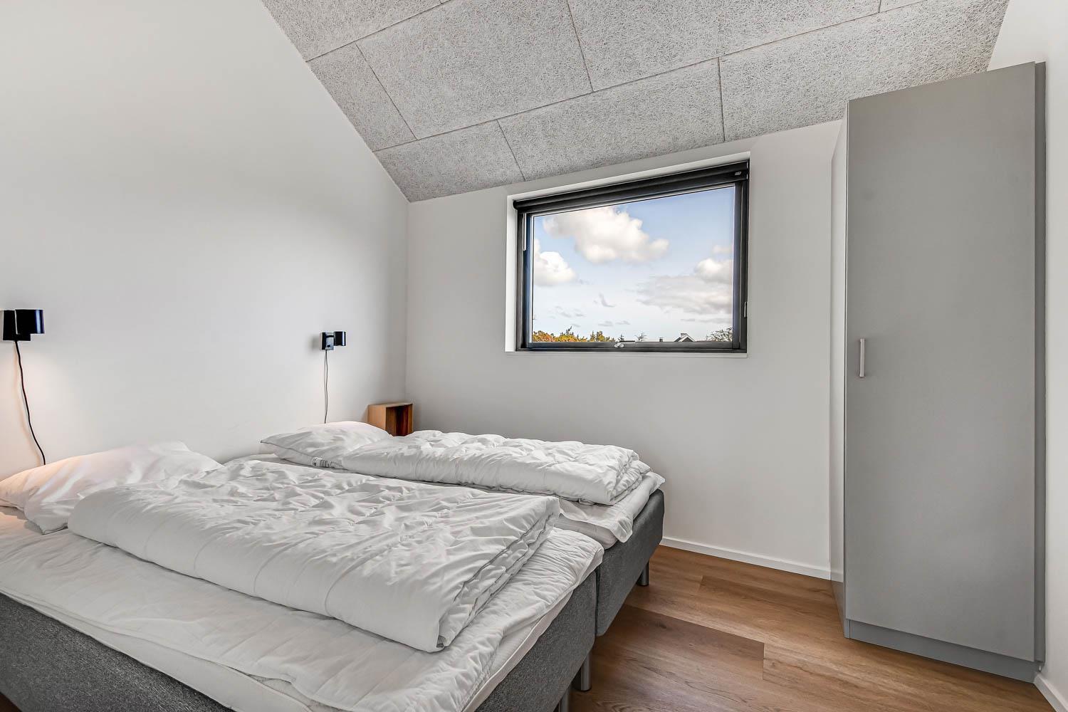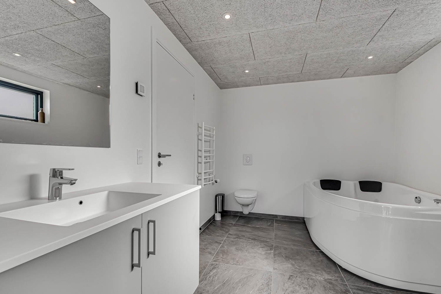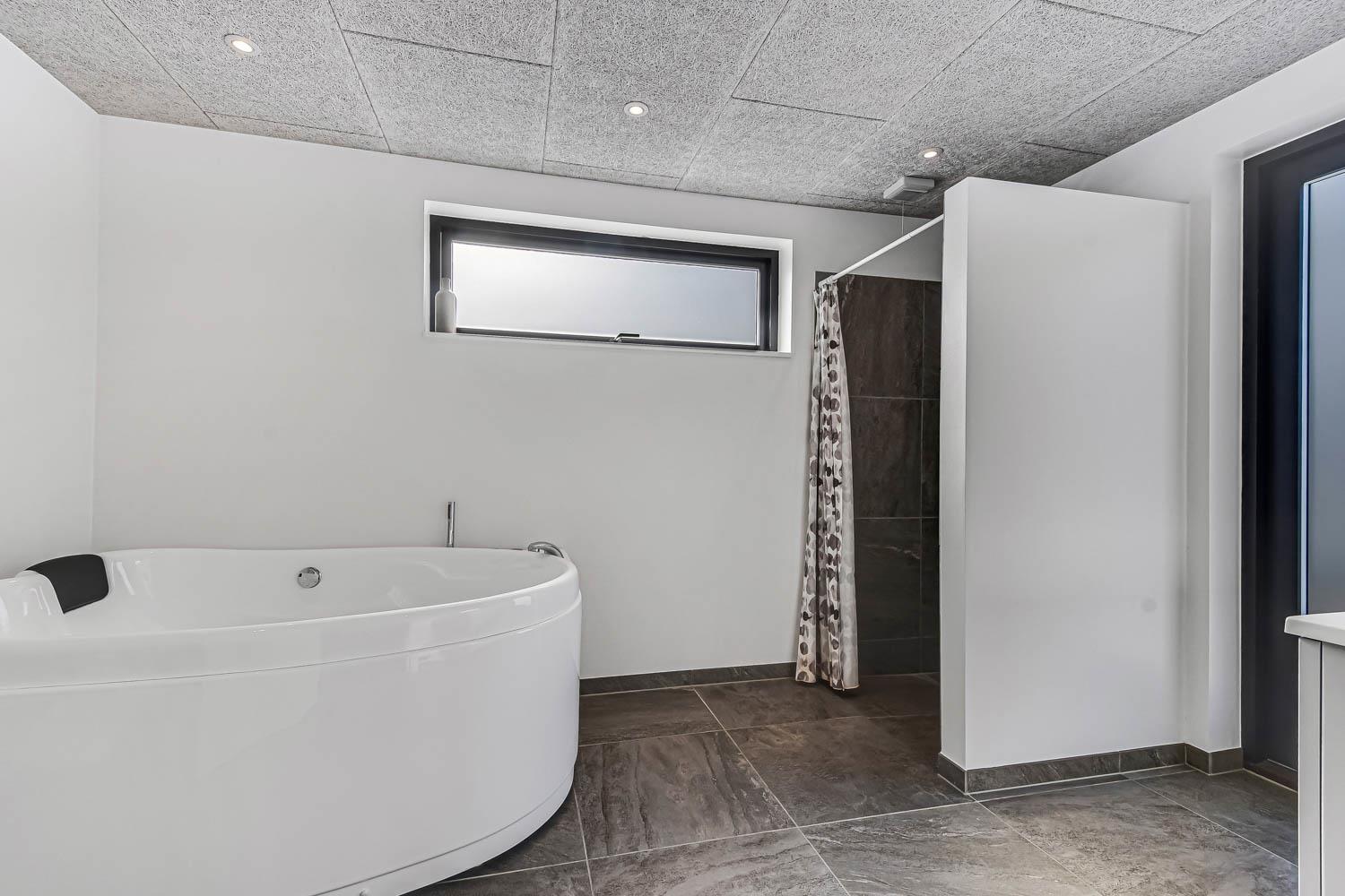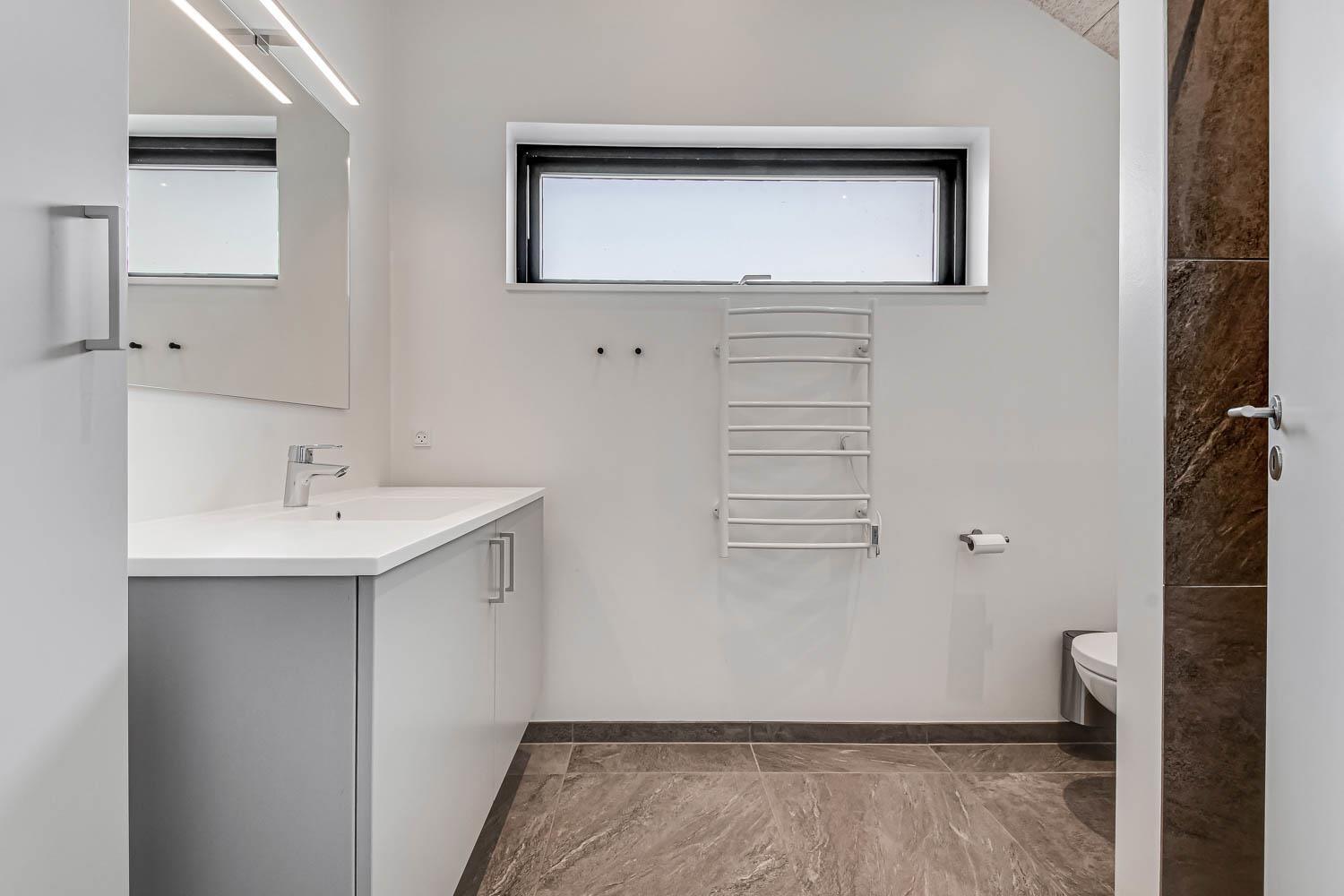 Huset råder over to badeværelser, som begge er indrettet med toilet, håndvask, bruser og gulvvarme. I det ene badeværelse findes også et spabad. Huset har fire gode soverum: 2S + 1DS + 1DS + 1DS desuden er der fra gangen via en stige adgang til en hems med to sovepladser. I entreen er vaskemaskine og tørretumbleren placeret, og her er der også god plads til at hænge overtøjet.