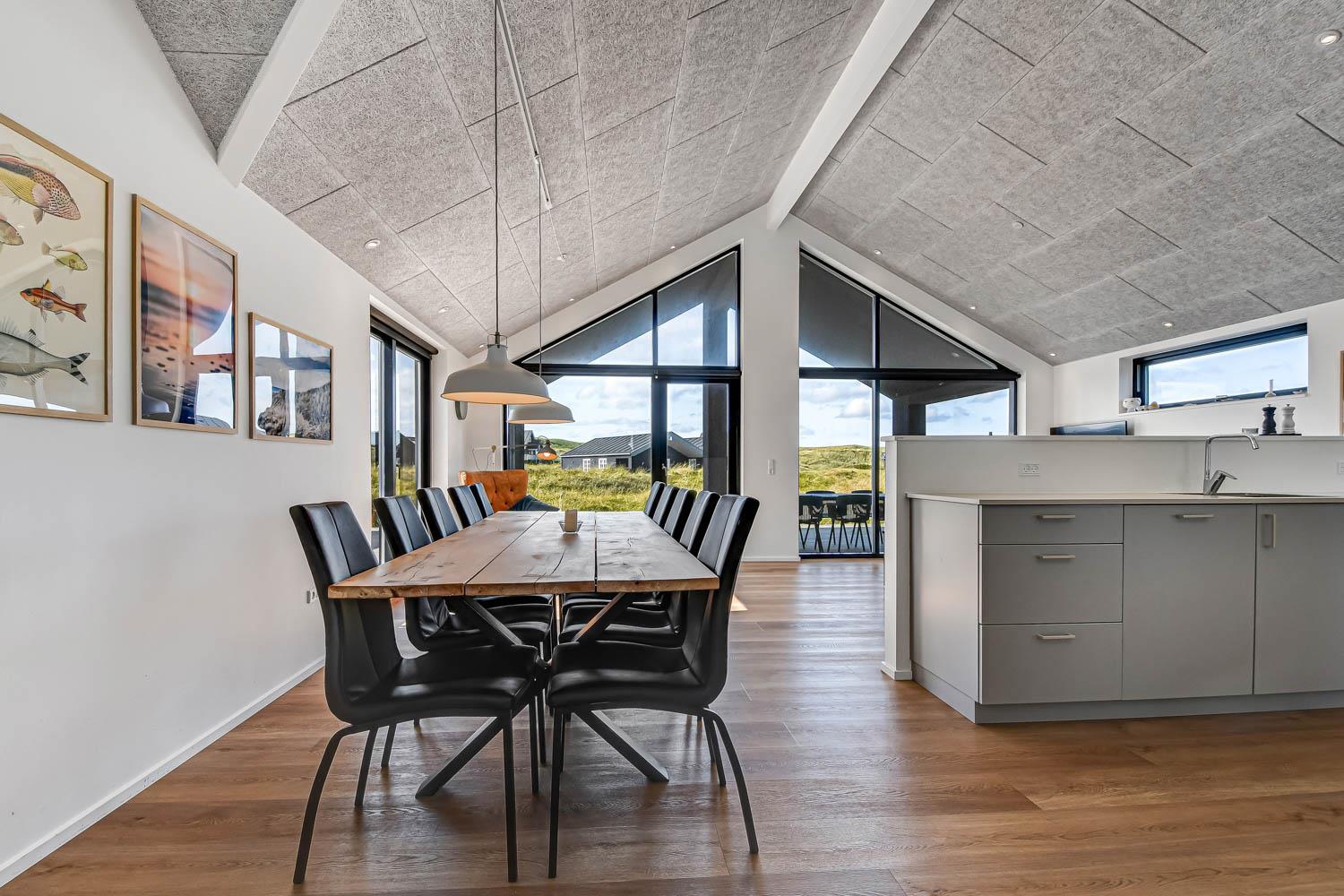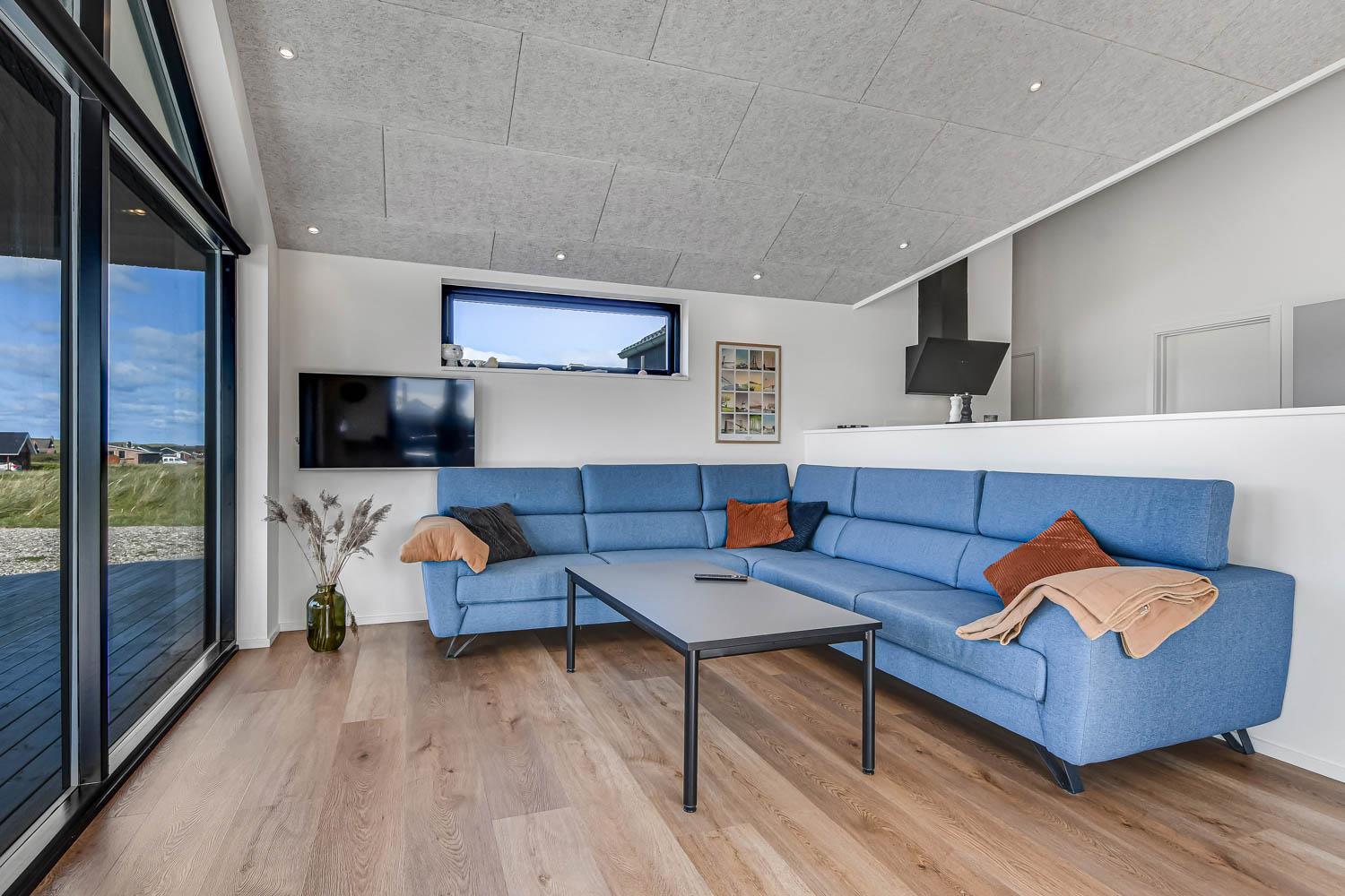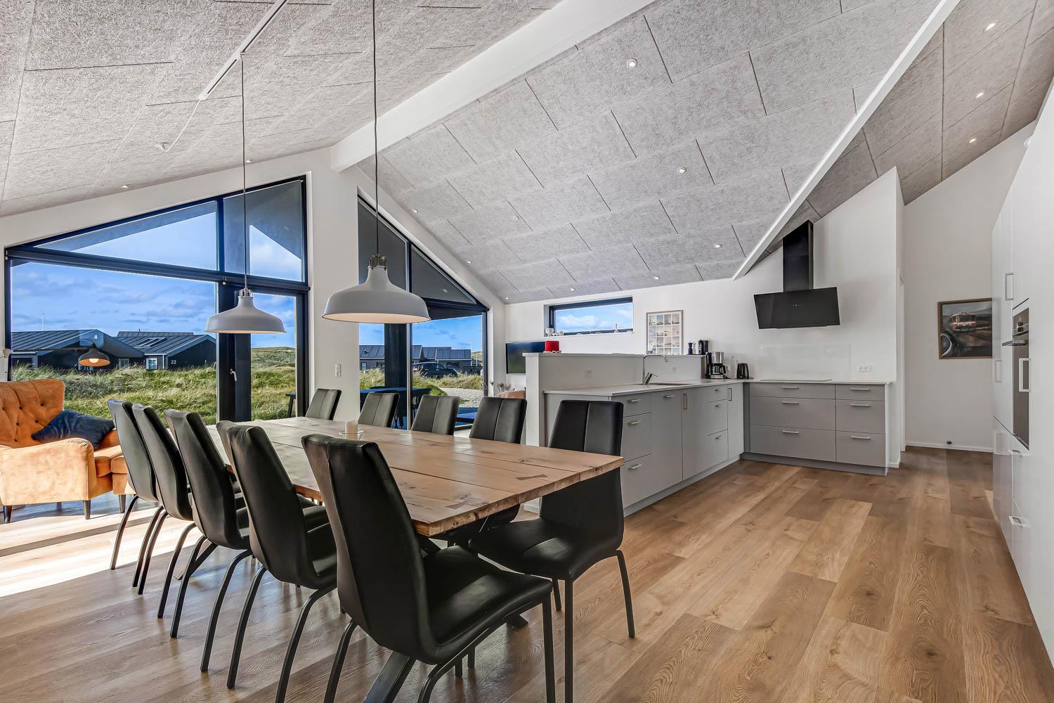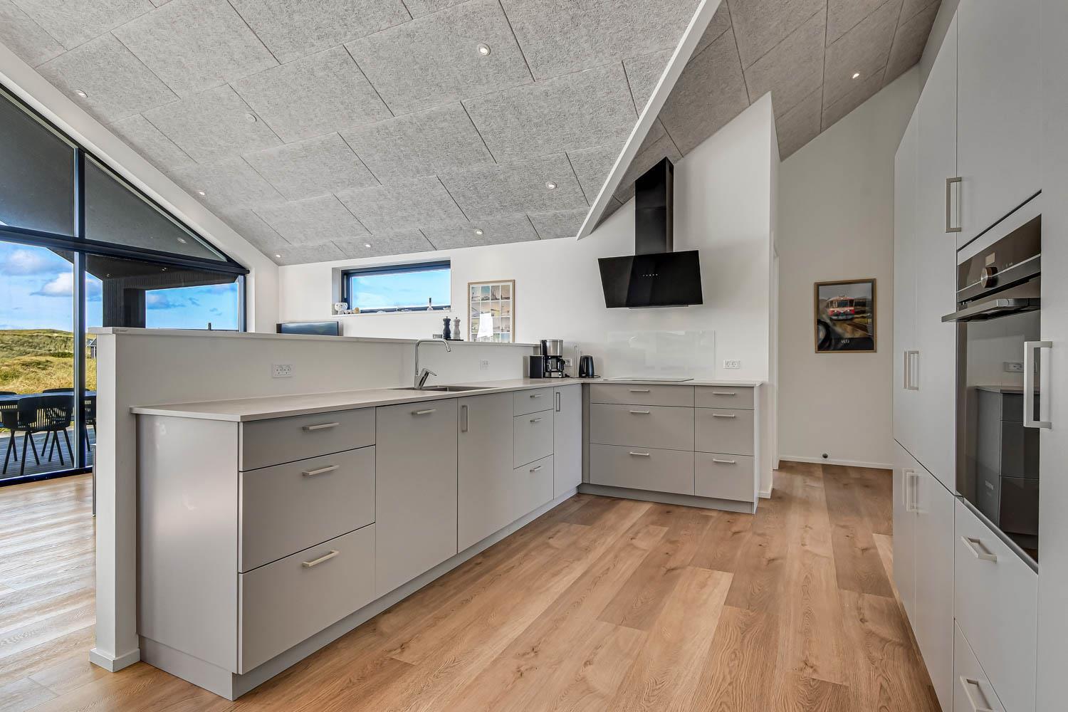 Dette flotte feriehus på 120m2 er indrettet med kombineret køkken og stue, hvor loftet er åbent til kip, og de store vinduespartier giver et godt lysindfald, der gør rummet lyst og venligt. Det flotte køkken er indrettet med alt i service og køkkengrej. Der er el-keramisk kogeplade, emhætte, indbygget ovn, mikroovn, dobbelt køle-/fryseskab og opvaskemaskine. Spisebordet er placeret i forbindelse med køkkenet. Stuen er indrettet, så man fx kan nyde udsigten til klitterne eller se TV. Der er smart-TV med fibernet, TV med tyske og danske programmer. Der er fra stuen to udgange til den store terrasse.