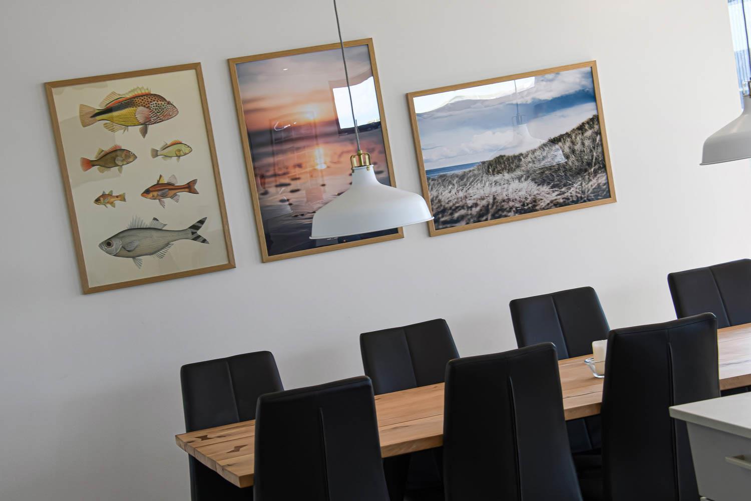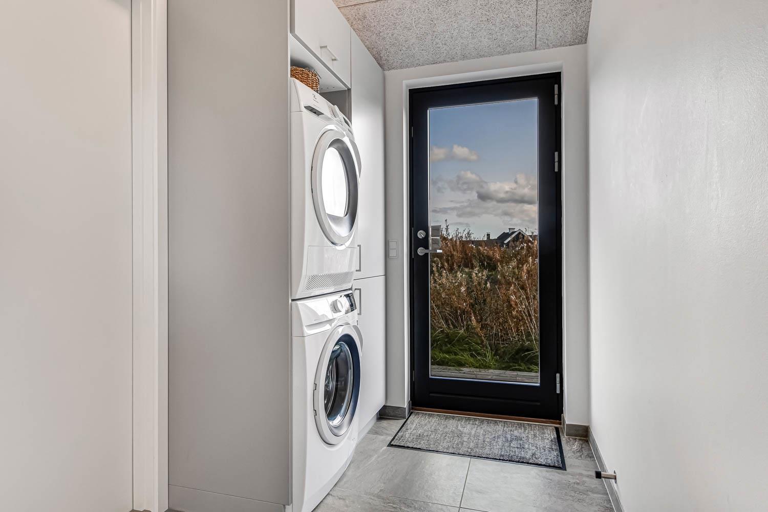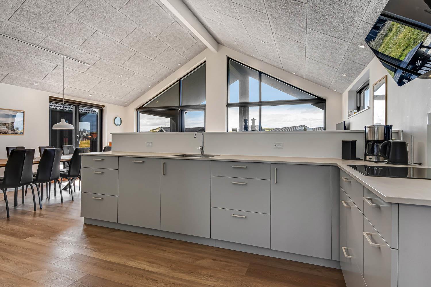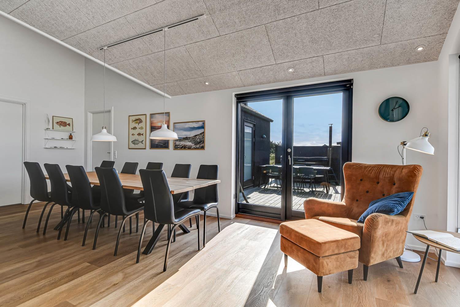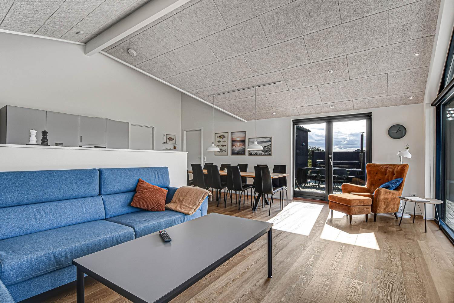 Dette flotte feriehus på 120m2 er indrettet med kombineret køkken og stue, hvor loftet er åbent til kip, og de store vinduespartier giver et godt lysindfald, der gør rummet lyst og venligt. Det flotte køkken er indrettet med alt i service og køkkengrej. Der er el-keramisk kogeplade, emhætte, indbygget ovn, mikroovn, dobbelt køle-/fryseskab og opvaskemaskine. Spisebordet er placeret i forbindelse med køkkenet. Stuen er indrettet, så man fx kan nyde udsigten til klitterne eller se TV. Der er smart-TV med fibernet, TV med tyske og danske programmer. Der er fra stuen to udgange til den store terrasse.
