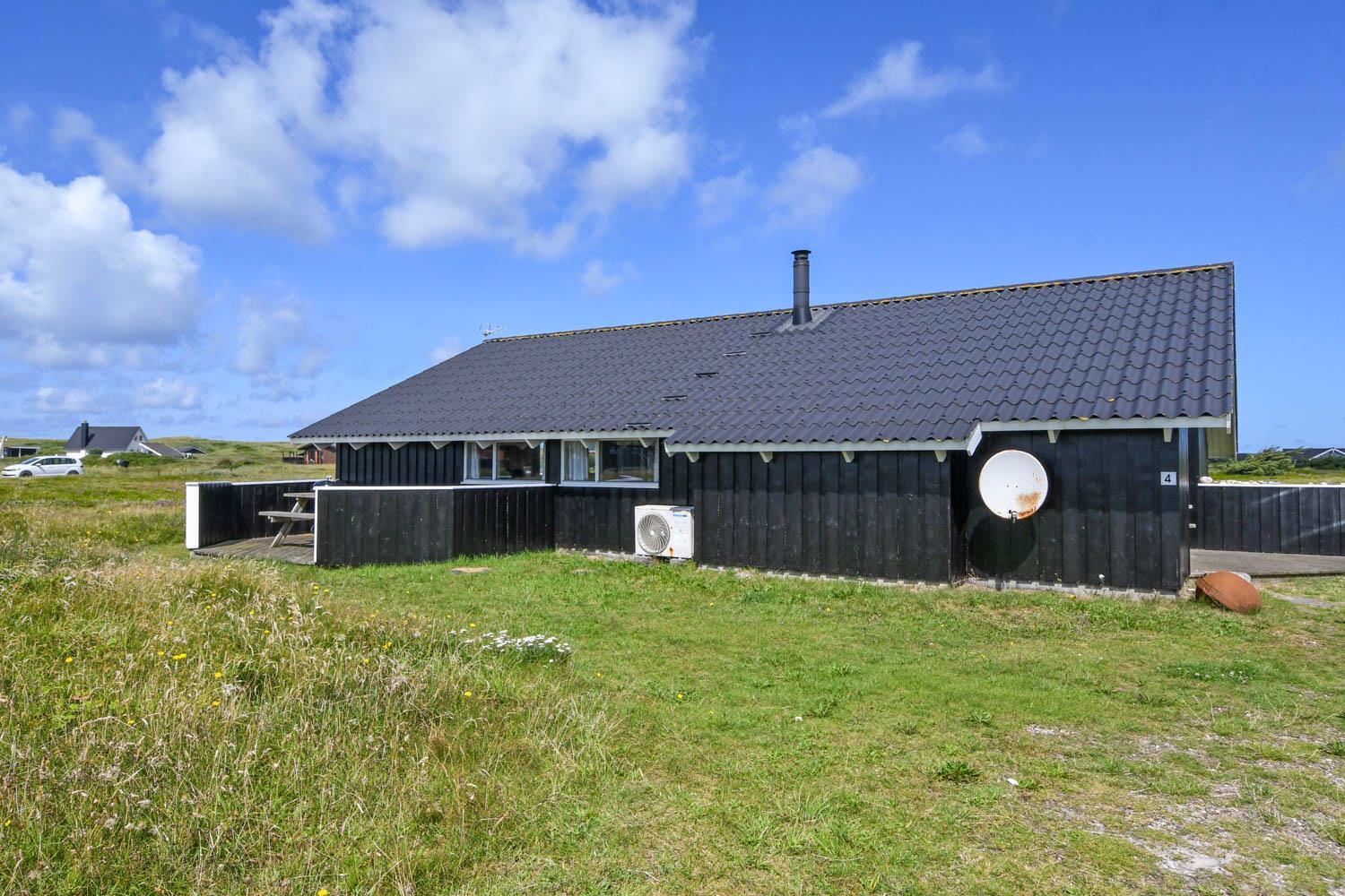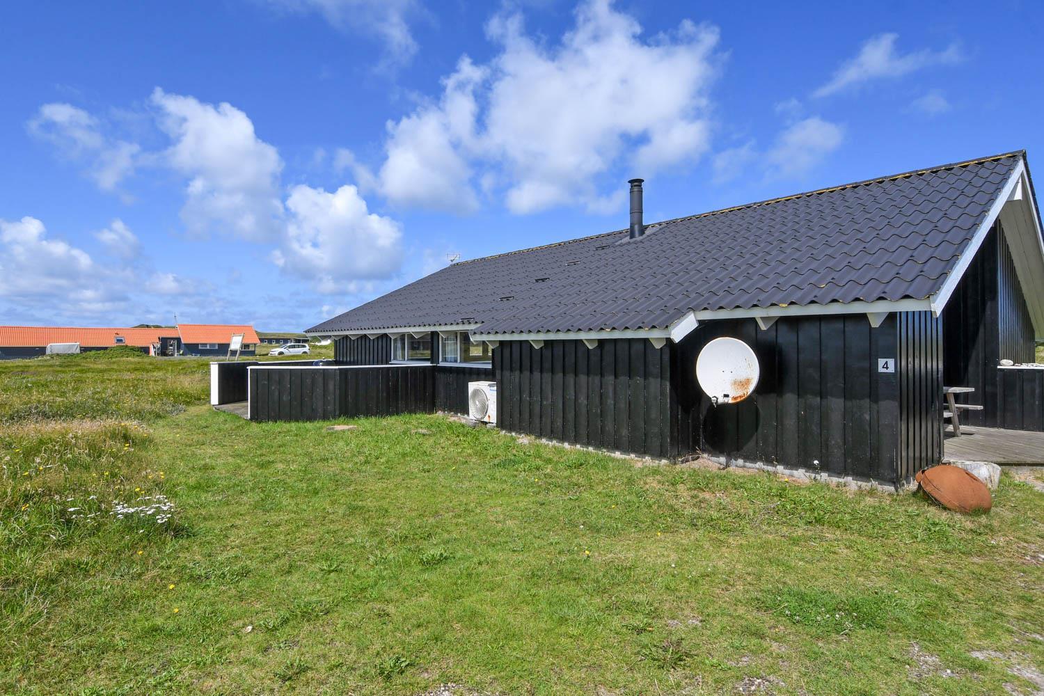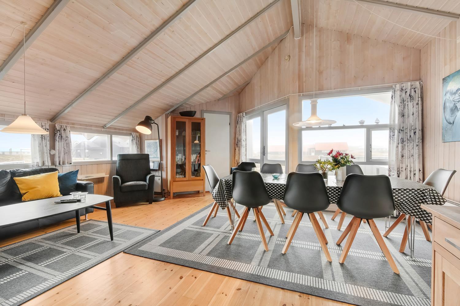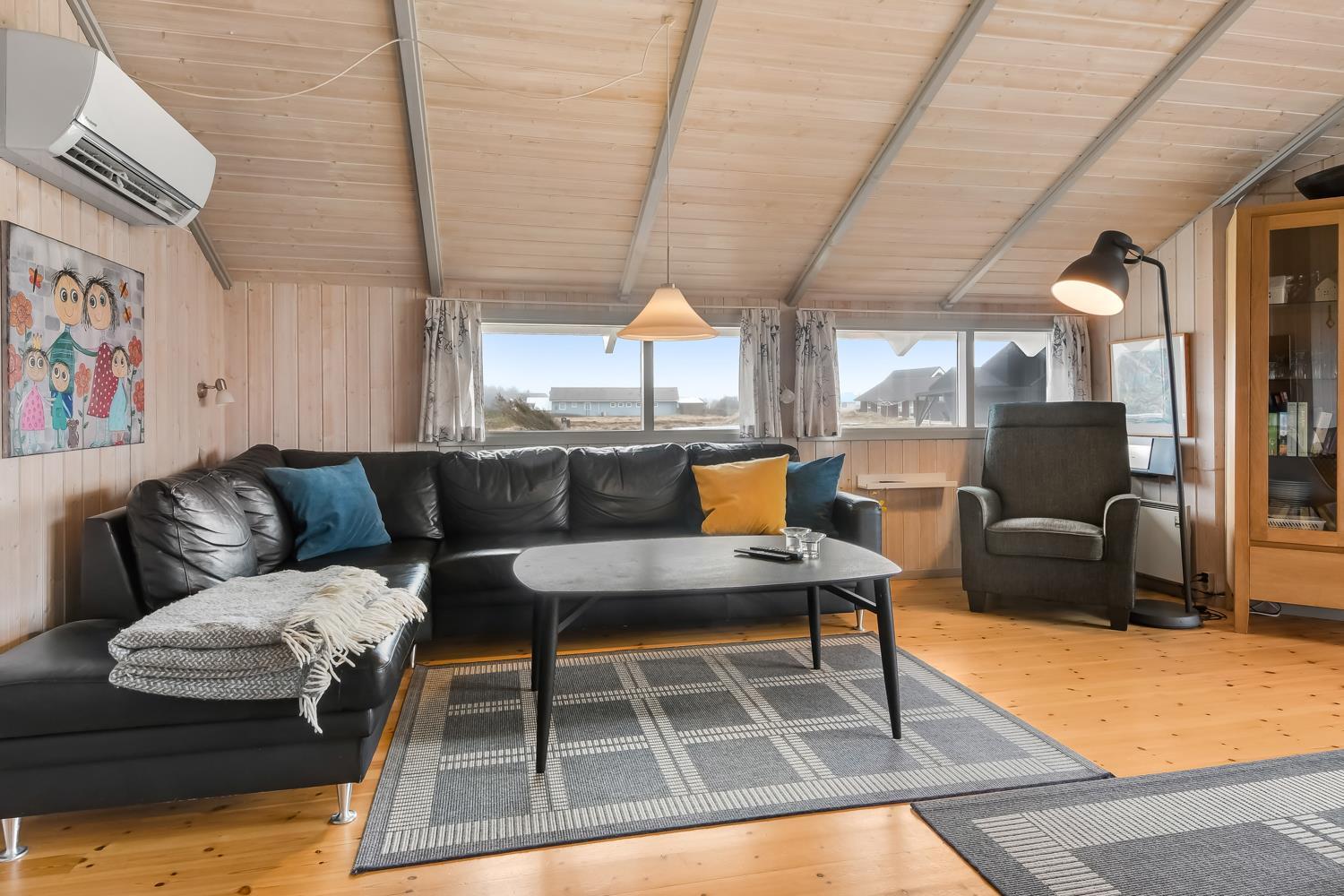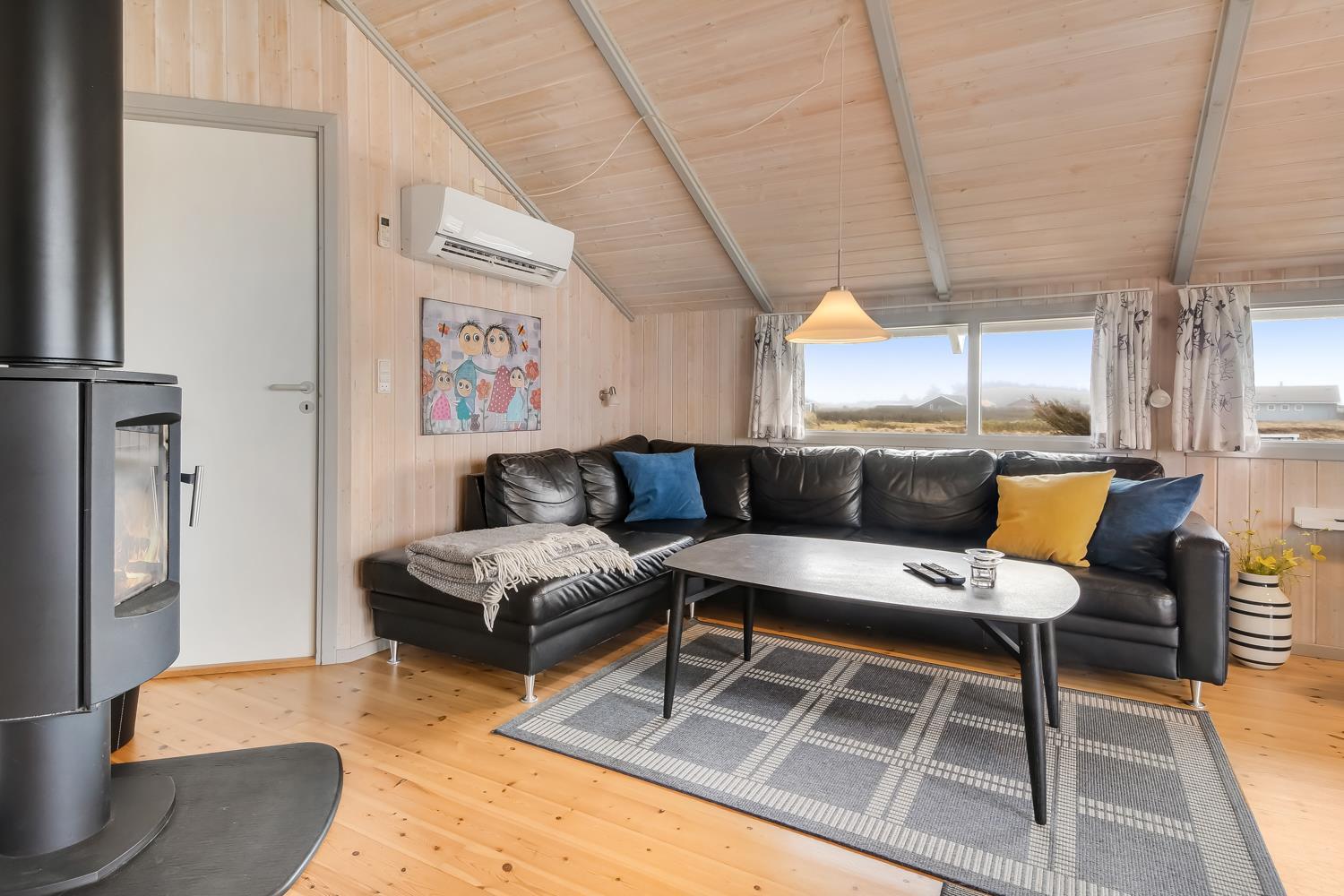 Rummeligt og komfortabelt indrettet feriehus på 86 m2. Opholdsstuen er åben til kip og store vinduespartier, giver et rigtig godt lys inde i huset. Opholdsstuen er opdelt i spisestue, som er kombineret med det åbne køkkenhjørne. Opholdsstuen med lædermøbler, spisebord, radio / CD , Smart-TV med chromecast og med tyske programmer samt mulighed for streaming af TV / radio / Apps. Nyd udsigten til de høje klitter ved Vesterhavet, over området og slap af foran den knitrende brændeovn, som sammen med varmepumpen hjælper med at reducere udgiften til varmeregningen. Praktiske gulve i opholdsrum, køkkenhjørne og soverum. 4 gode soverum (2ES, 1DS, 1DS, 1DS) – huset må dog max beboes af 6 personer. Køkkenhjørne med alt i service / køkkengrej samt komfur med glaskeramiske kogeplader, emhætte, opvaskemaskine, køleskab med fryseboks og mikroovn. Dejligt badeværelse toilet, håndvask, bruser, vaskemaskine, spabad, direkte adgang til saunaen og klinkegulv med gulvvarme. Ekstra toilet med toilet og håndvask. Ikke ryger hus. Max. 1 husdyr er tilladt.