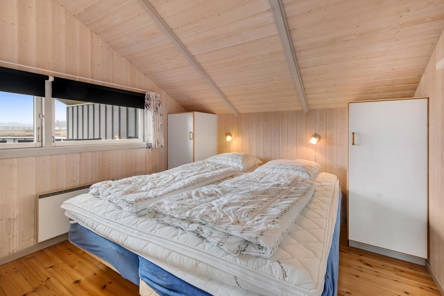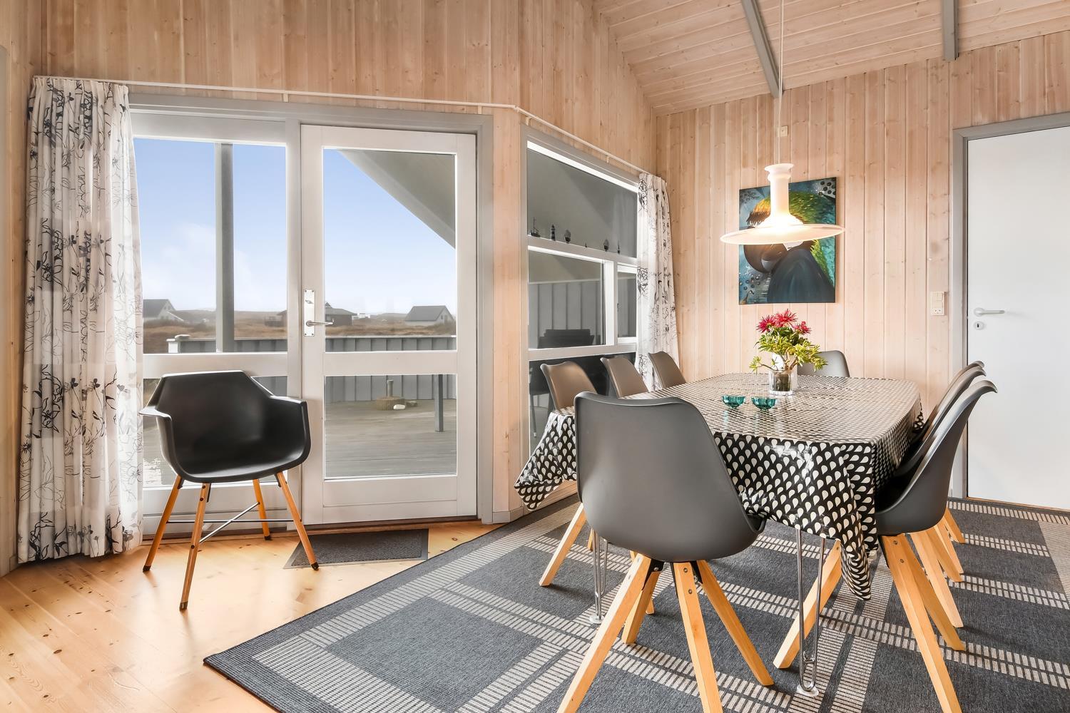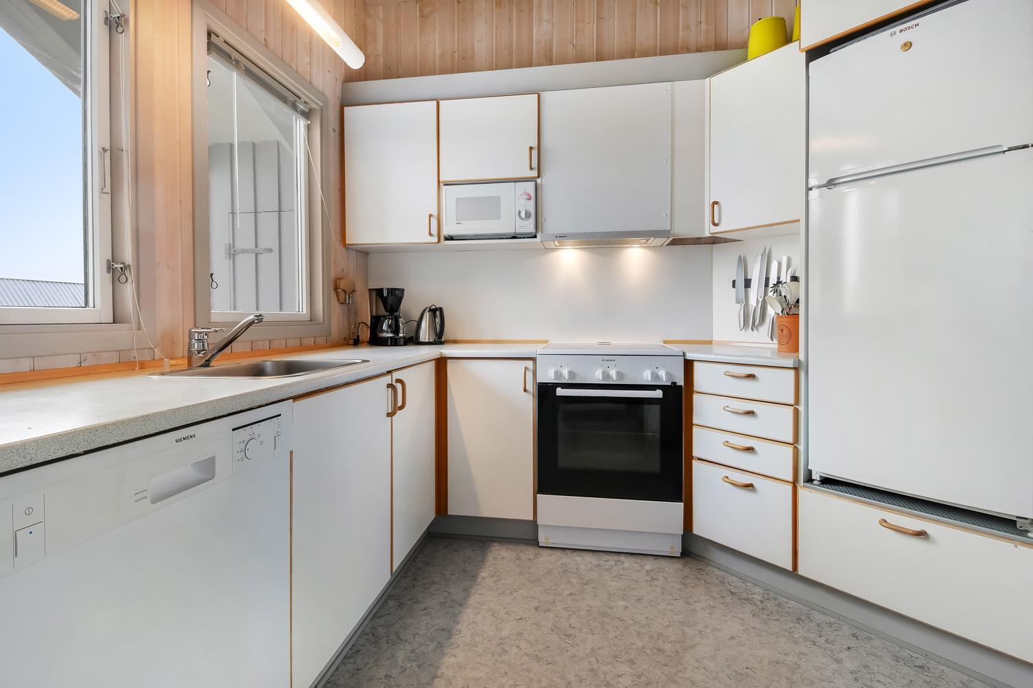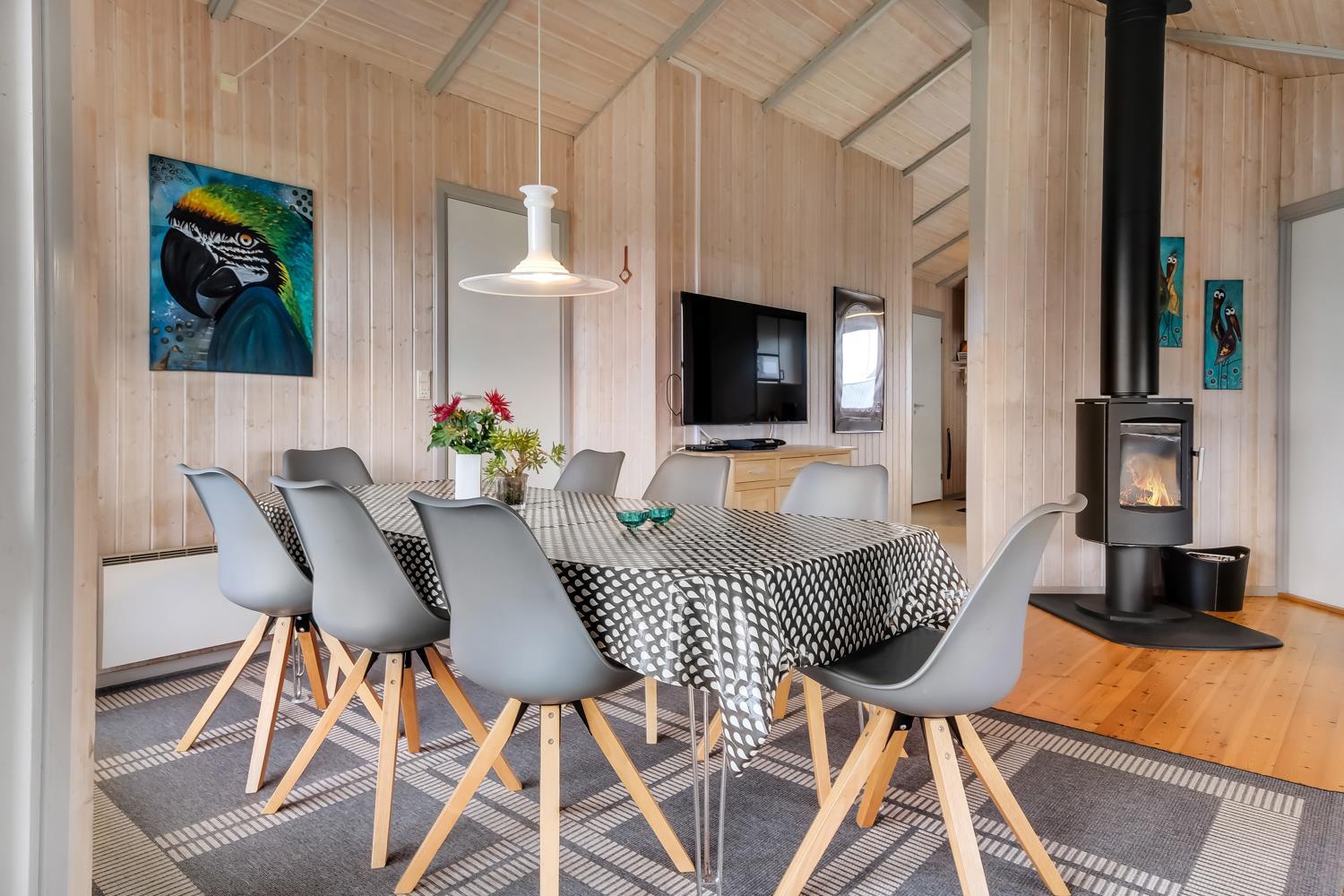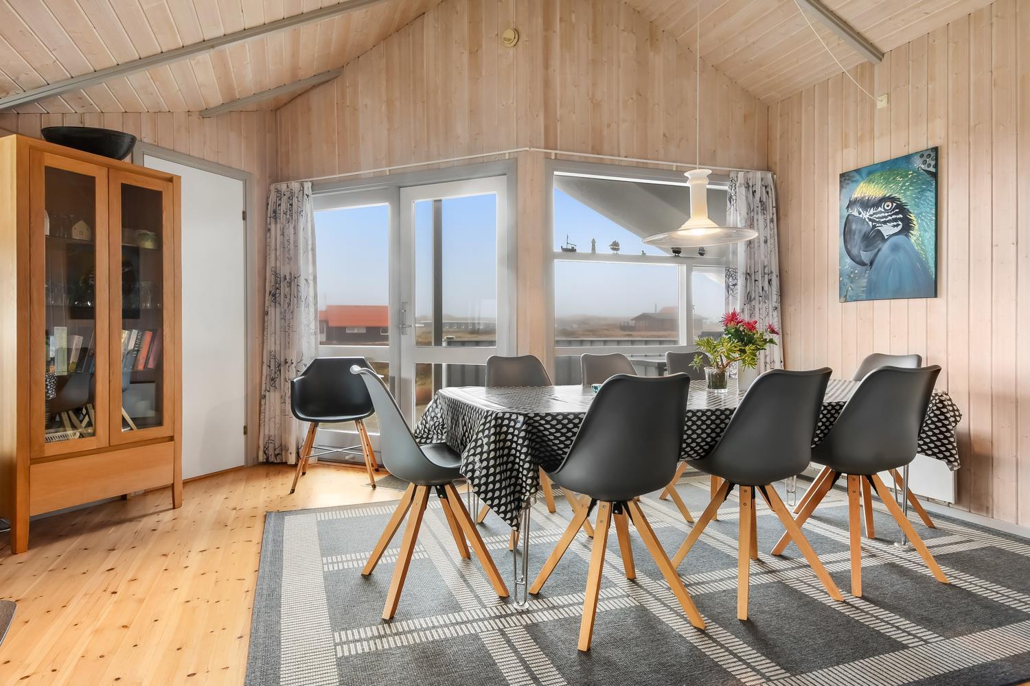 Rummeligt og komfortabelt indrettet feriehus på 86 m2. Opholdsstuen er åben til kip og store vinduespartier, giver et rigtig godt lys inde i huset. Opholdsstuen er opdelt i spisestue, som er kombineret med det åbne køkkenhjørne. Opholdsstuen med lædermøbler, spisebord, radio / CD , Smart-TV med chromecast og med tyske programmer samt mulighed for streaming af TV / radio / Apps. Nyd udsigten til de høje klitter ved Vesterhavet, over området og slap af foran den knitrende brændeovn, som sammen med varmepumpen hjælper med at reducere udgiften til varmeregningen. Praktiske gulve i opholdsrum, køkkenhjørne og soverum. 4 gode soverum (2ES, 1DS, 1DS, 1DS) – huset må dog max beboes af 6 personer. Køkkenhjørne med alt i service / køkkengrej samt komfur med glaskeramiske kogeplader, emhætte, opvaskemaskine, køleskab med fryseboks og mikroovn. Dejligt badeværelse toilet, håndvask, bruser, vaskemaskine, spabad, direkte adgang til saunaen og klinkegulv med gulvvarme. Ekstra toilet med toilet og håndvask. Ikke ryger hus. Max. 1 husdyr er tilladt.