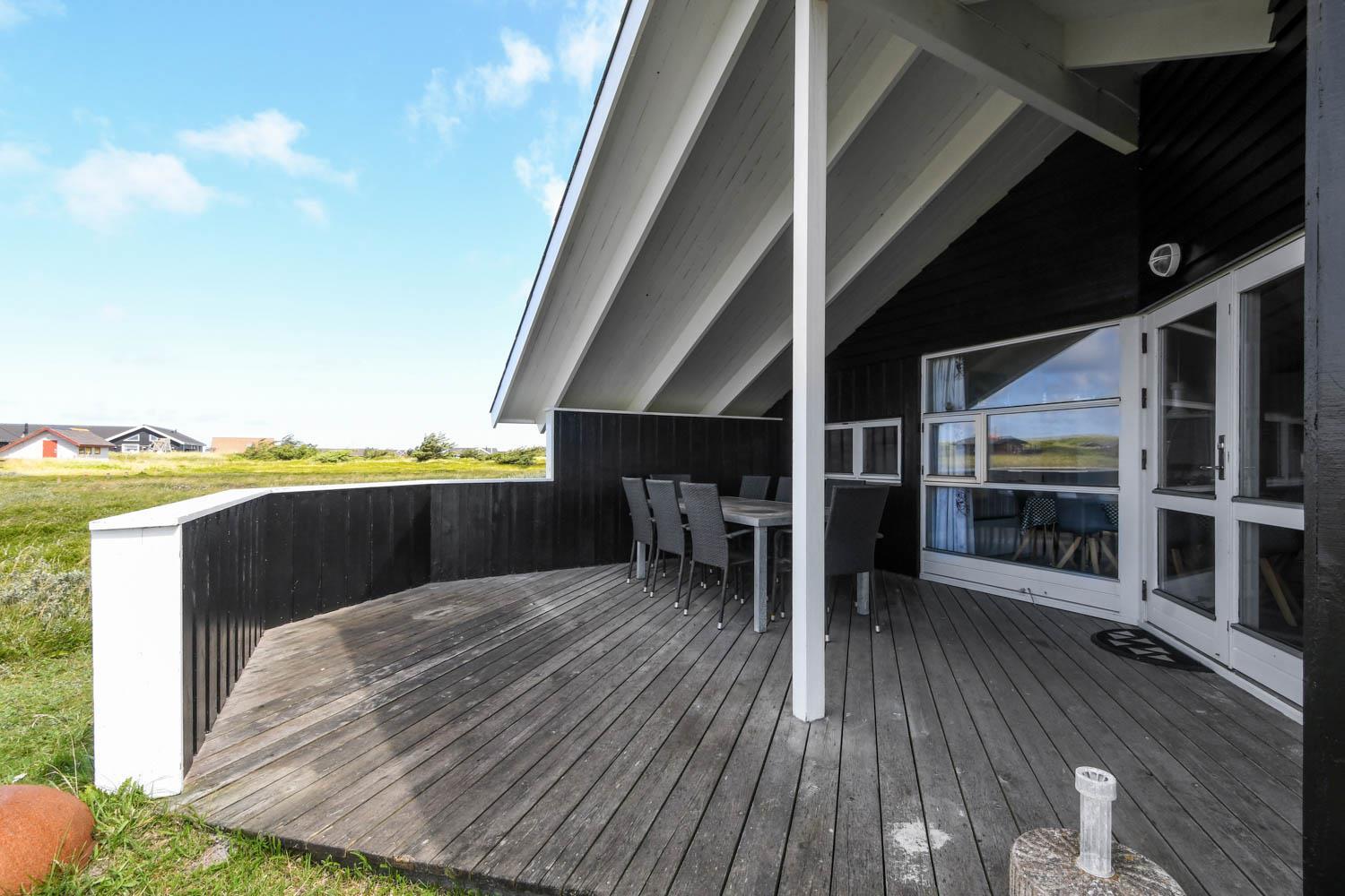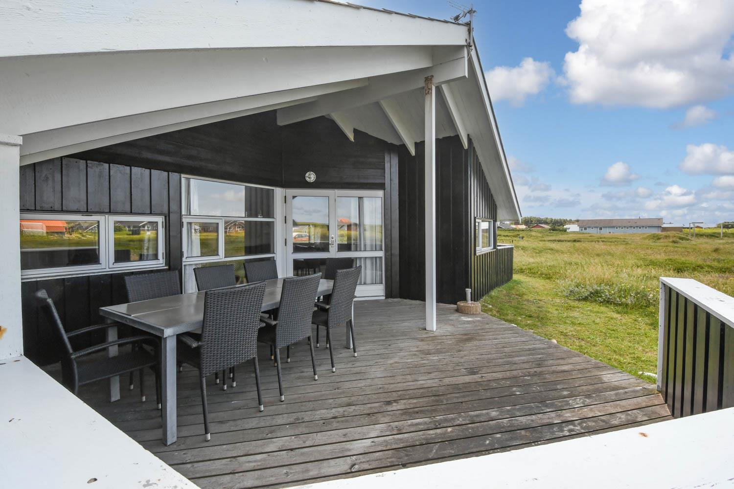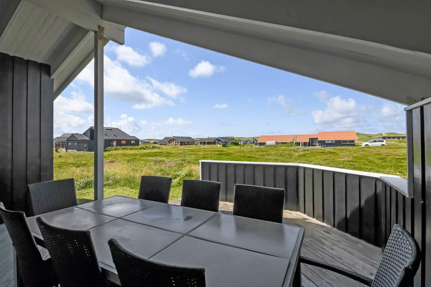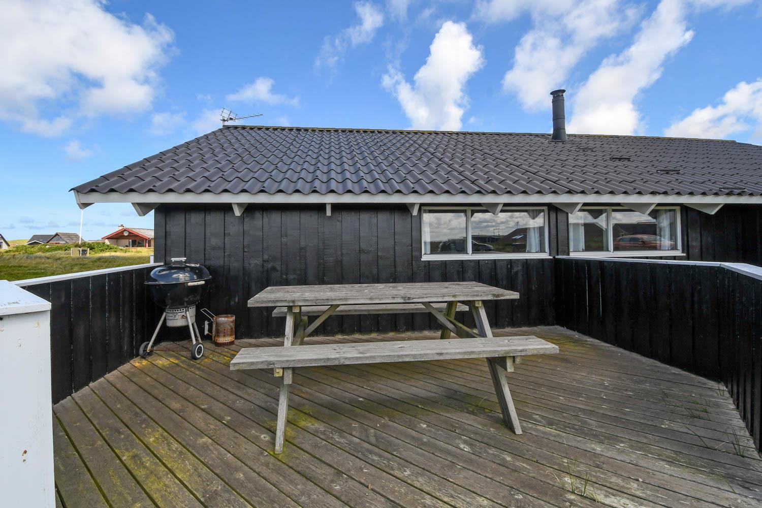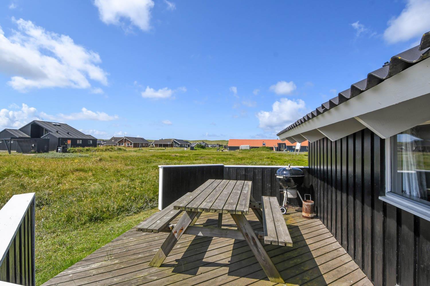 Huset er beliggende på en ca. 1.200 m2 stor naturgrund kun 250 m fra Vesterhavet. Der er udgang til 2 dejlige terrasser. Begge terrasser har læhegn og den ene er delvis overdækket. Liggestole, havemøbler og grill som kan flyttes rundt efter behag og efter en plads i solen. I Vrist og omegn er der rigtig gode muligheder for at cykle, vandre eller løbe en tur og kun ca. 250m fra huset ligger det brusende Vesterhav som hver dag byder på nye maleriske oplevelse. I sæsonen kan du hente morgenbrød, købmandsvarer eller måske invitere familien ud at spise, kun 1 km fra huset. Så hvad enten du er til aktiv ferie eller total afslapning danner dette dejlige feriehus den perfekte ramme både hvad angår hus, beliggenhed og omgivelser.