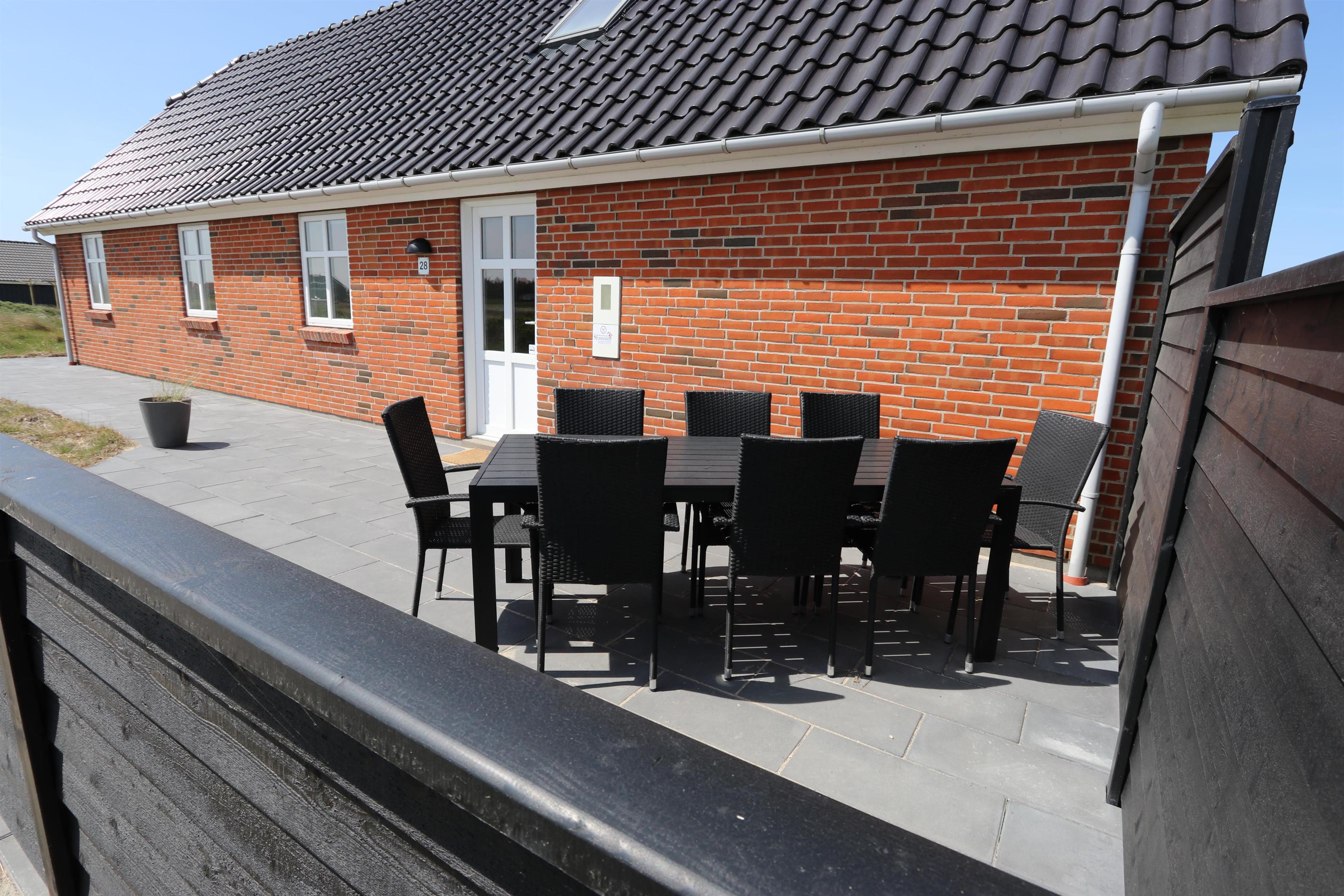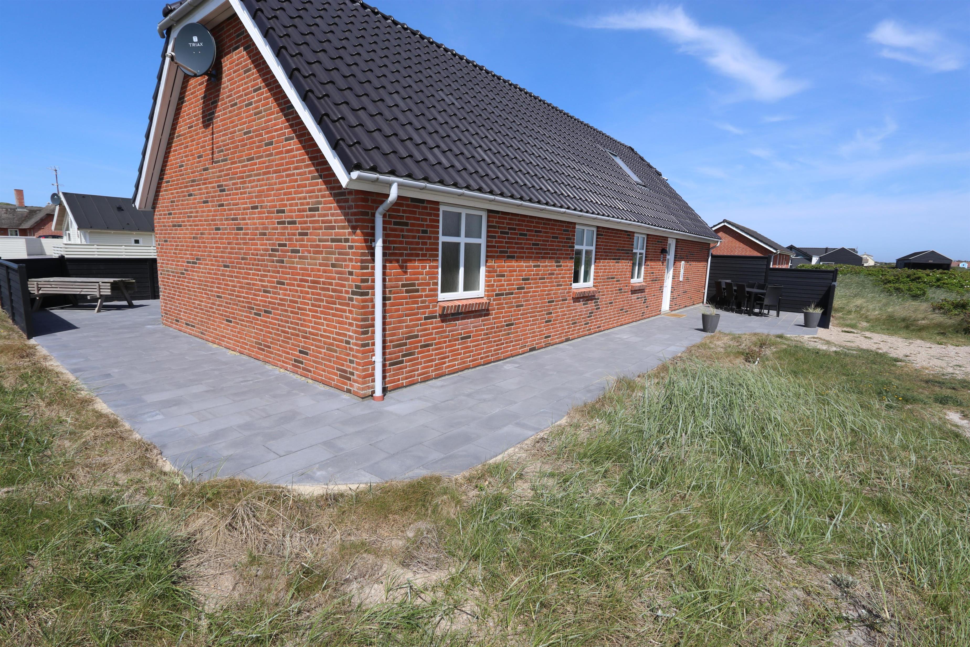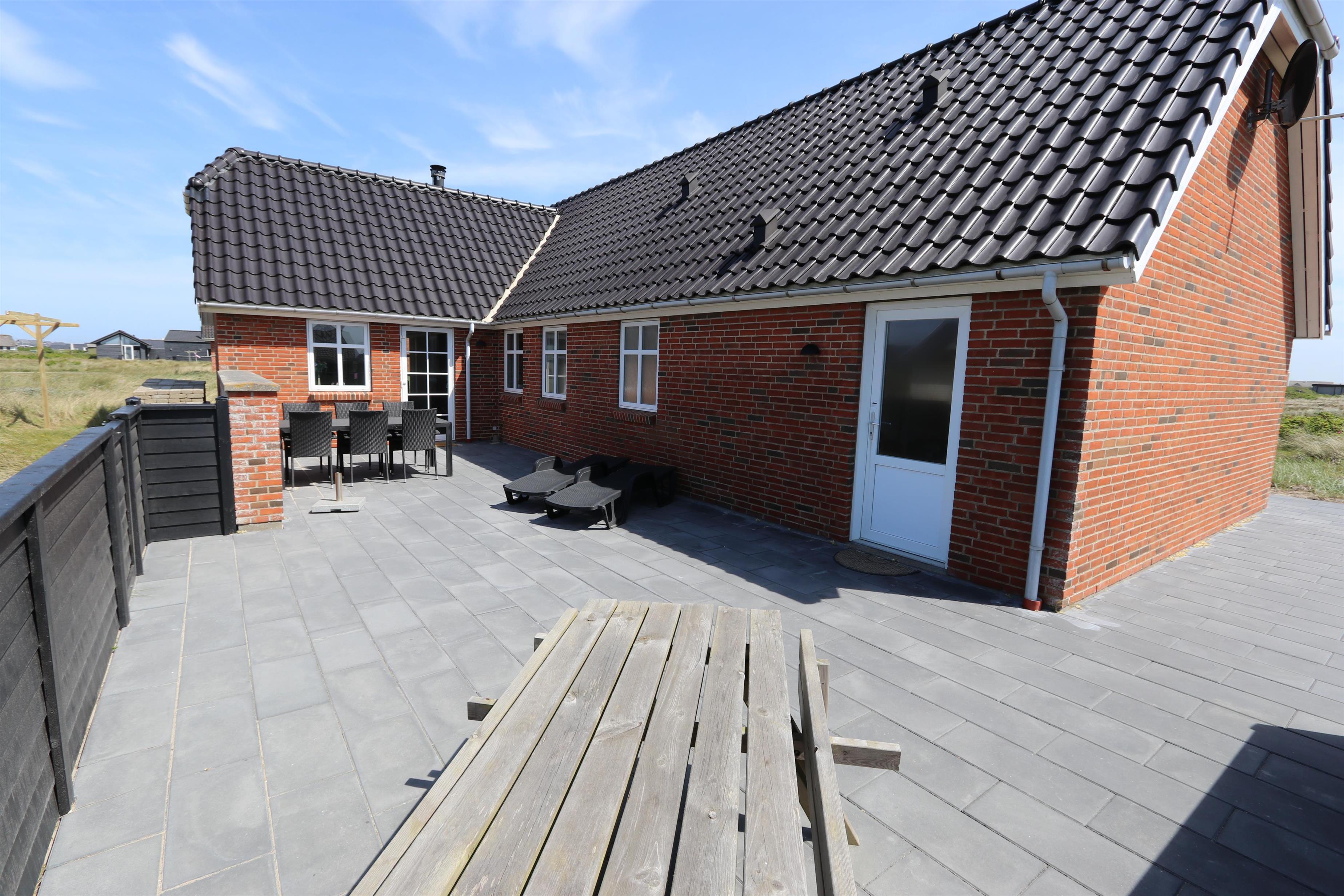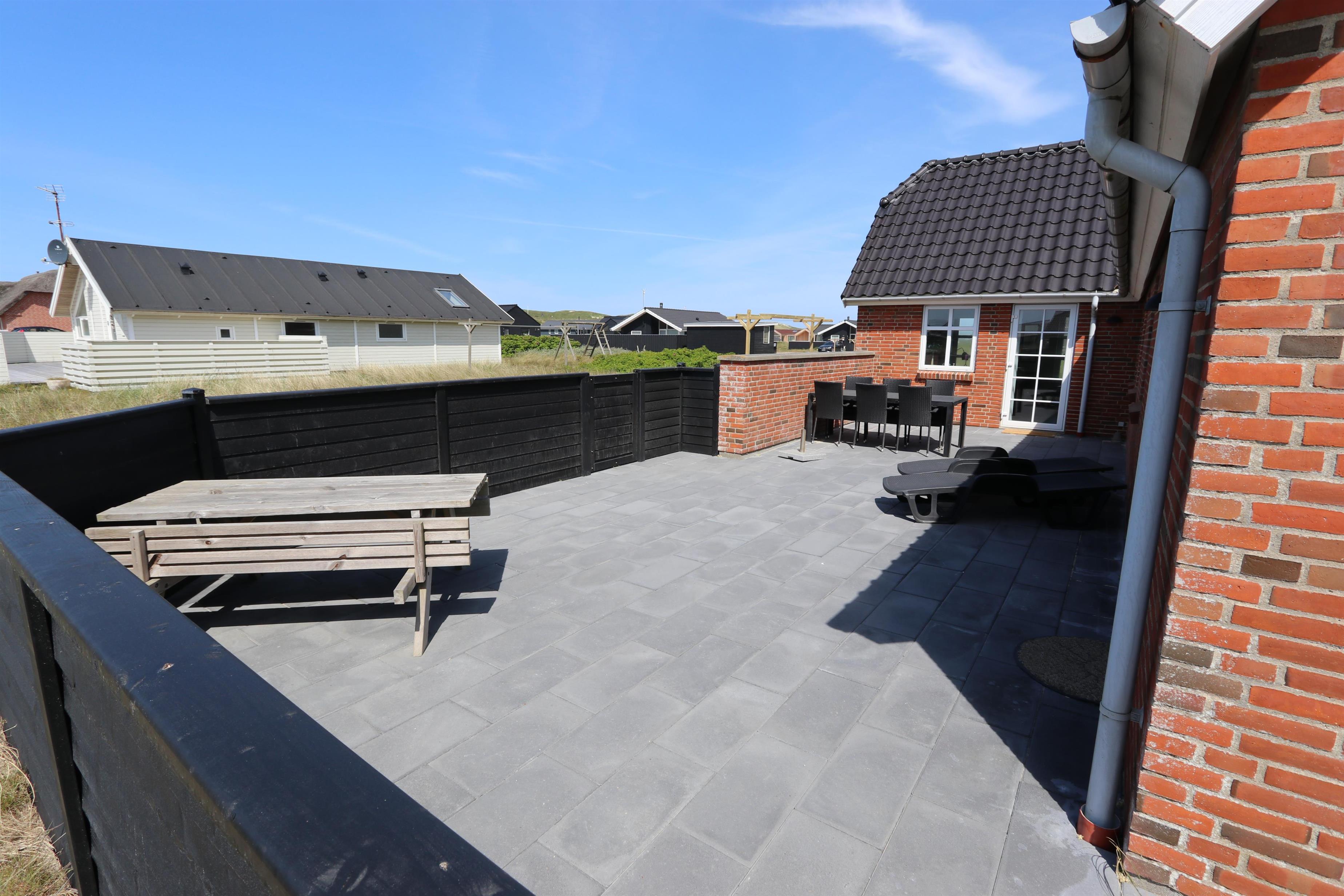 Fra stuen er der udgang til husets terrasse, som ligger mod vest og er indhegnet. Her er der havemøbler og liggestole med hynder. Fra terrassen er der udsigt til klitterne og med sin beliggenhed kun 150 m fra Vesterhavet, er der ikke langt at gå hverken for ung eller gammel. Et særdeles komfortabelt hus i dejlige omgivelser.
