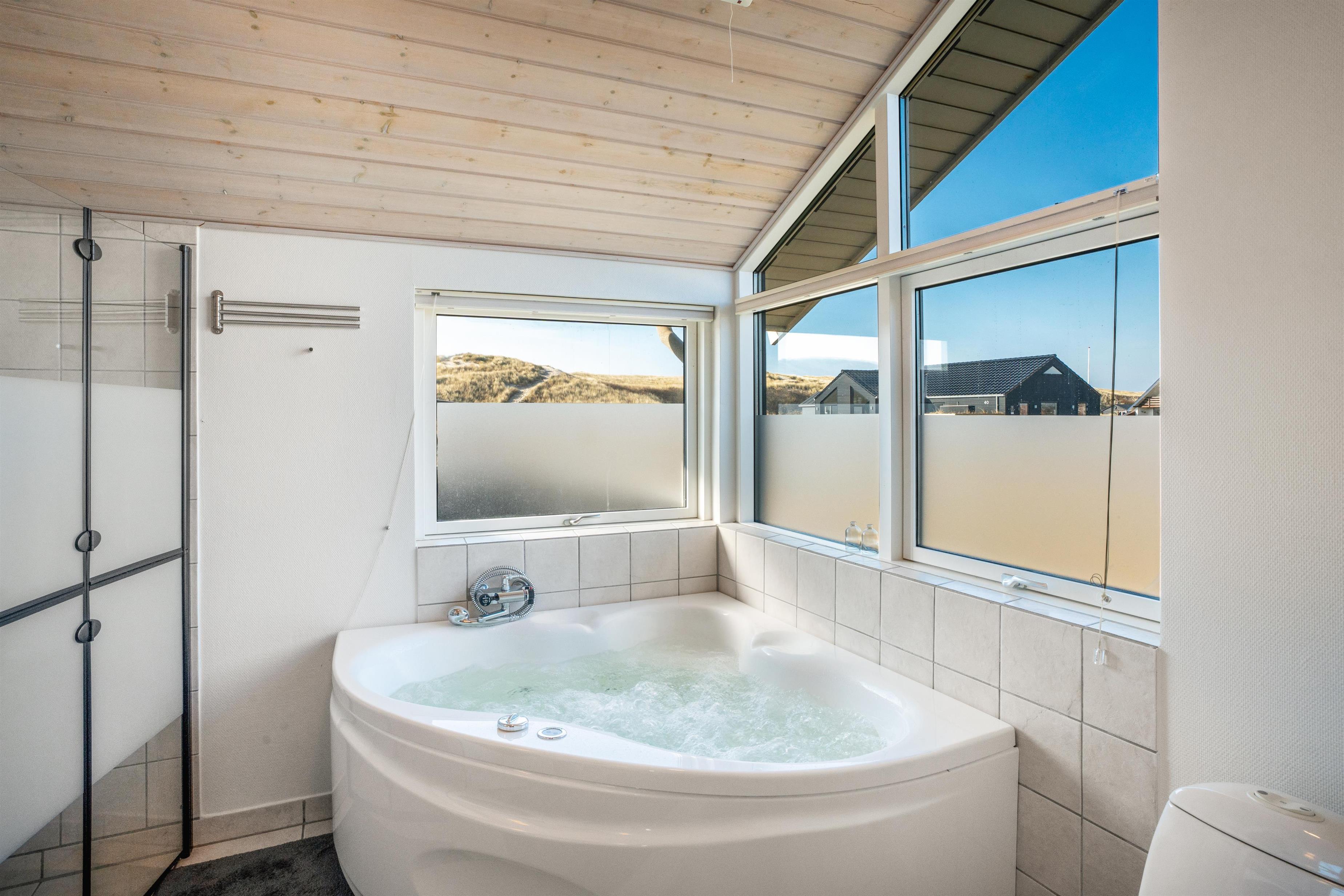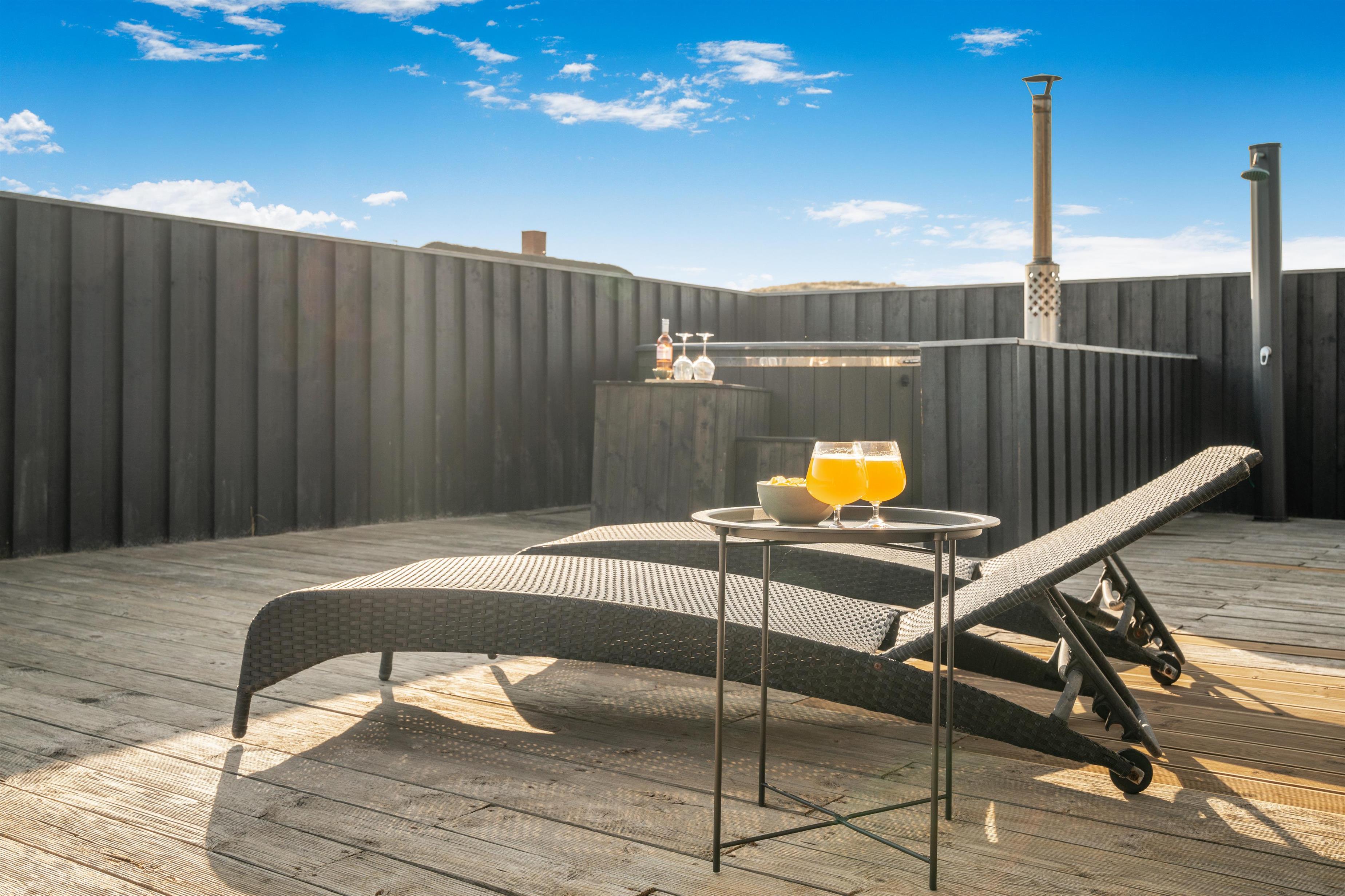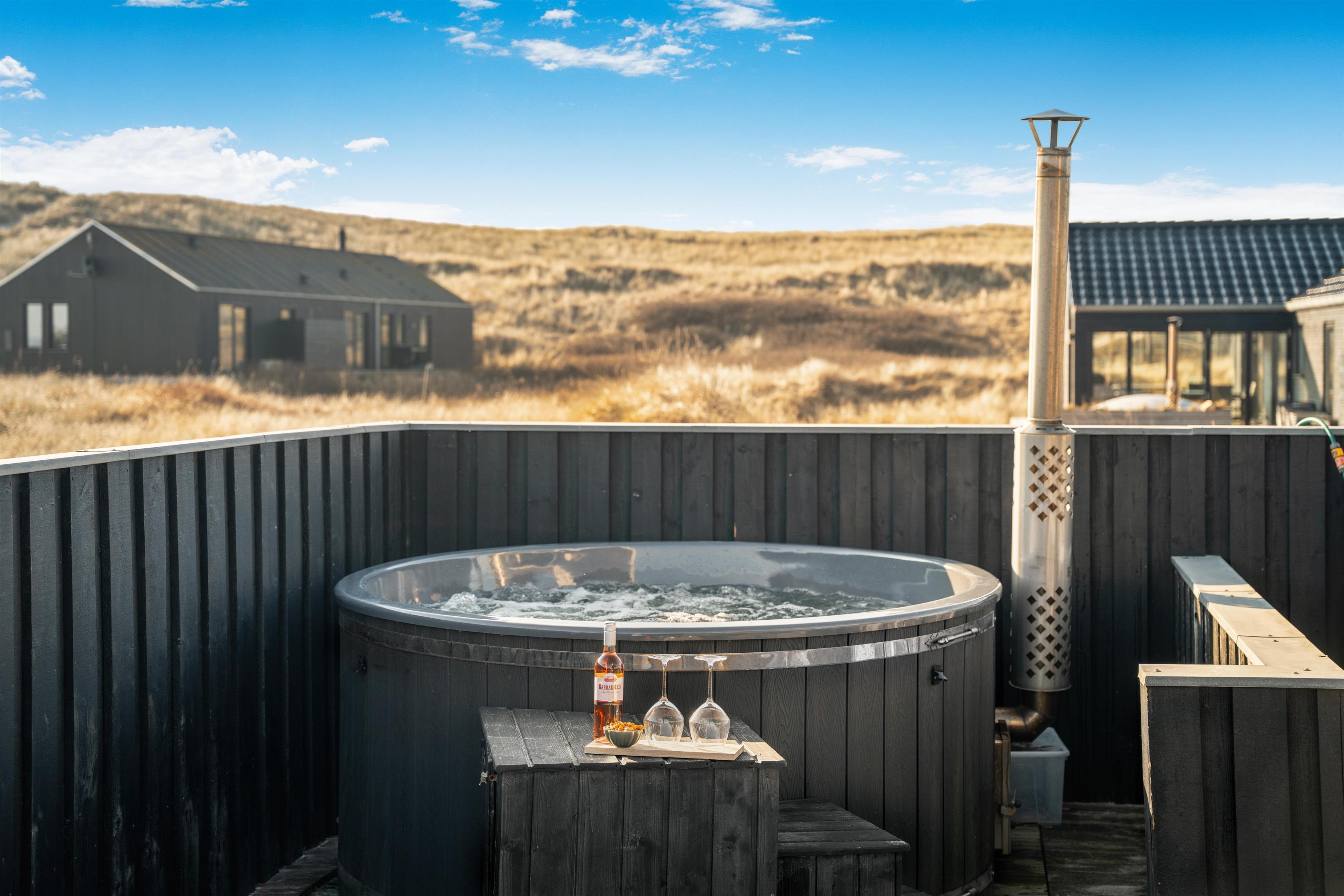 Efter en frisk gåtur i klitterne kan du vælge mellem den indendørs spa og sauna – eller hoppe i det udendørs vildmarksbad med bobler og udebruser, hvor udsigten over klitterne fuldender oplevelsen.