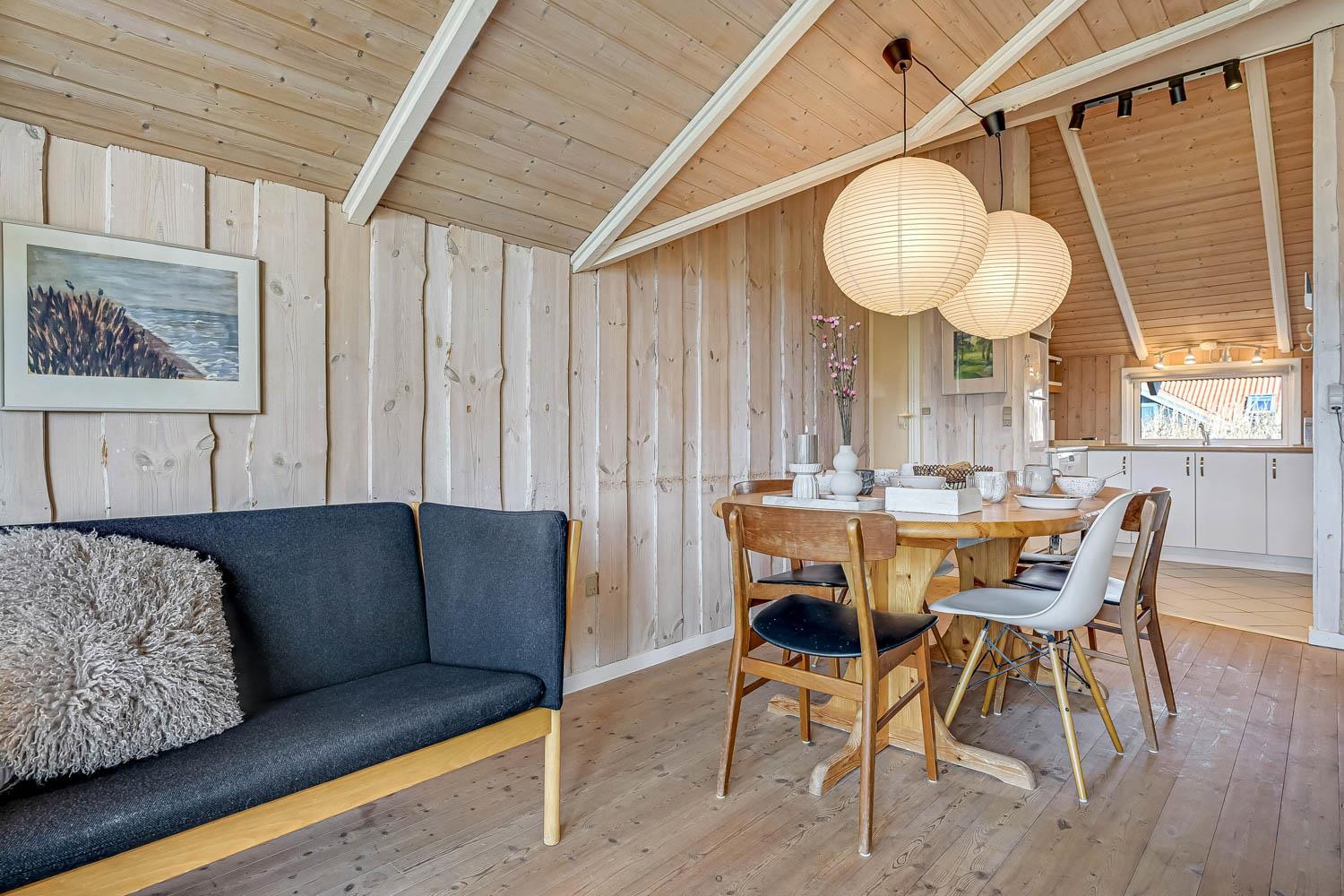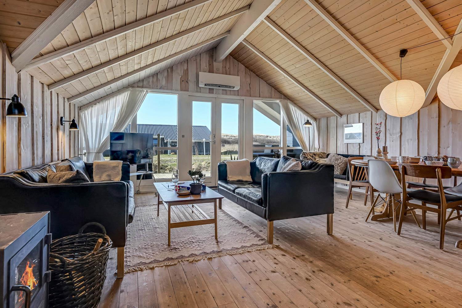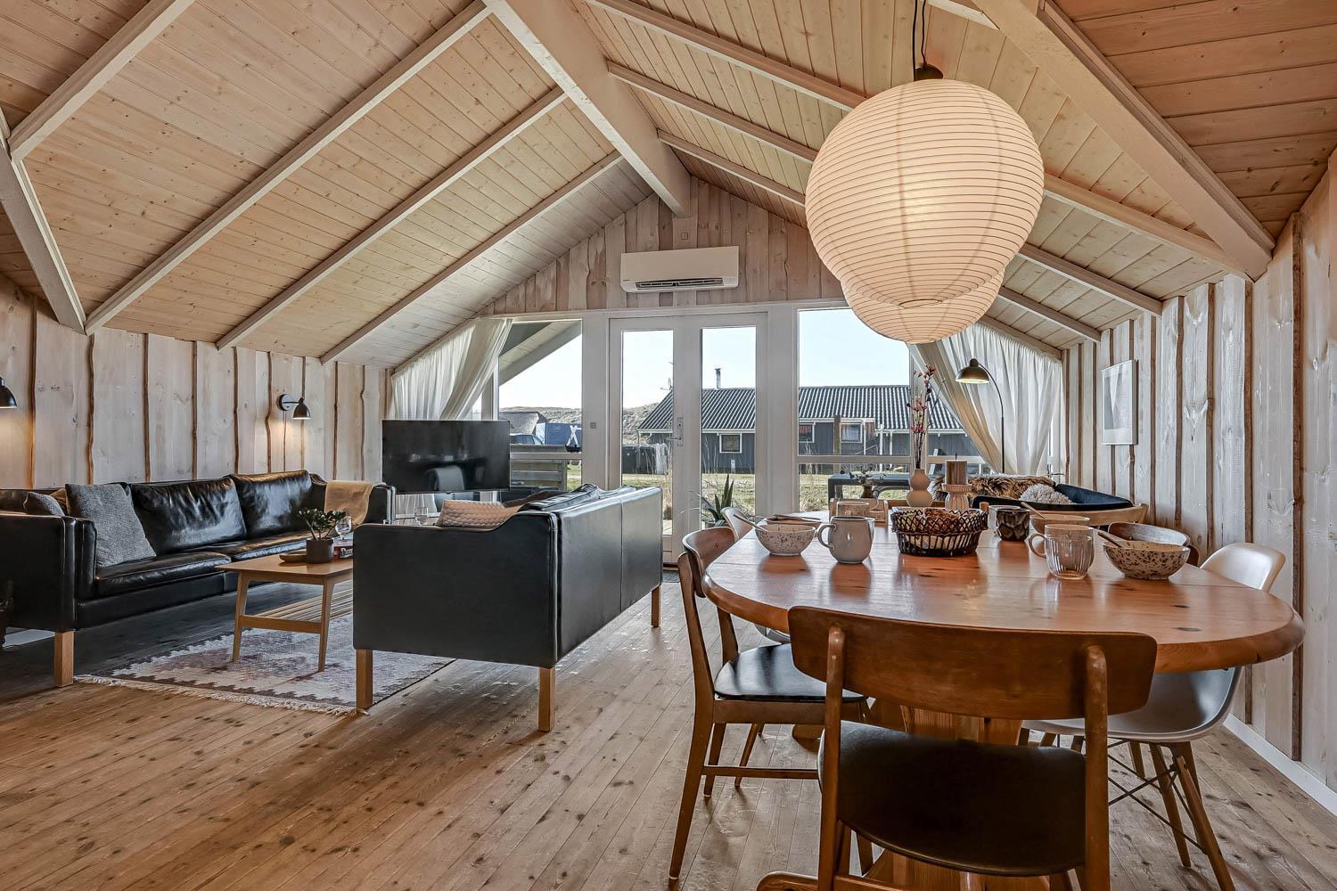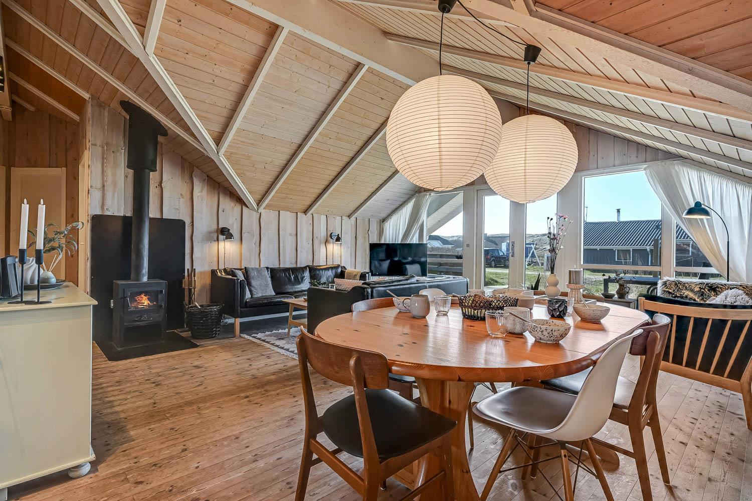 Huset er på 110 m² og byder på 4 gode soveværelser, hvilket gør det ideelt til både to familier eller den store familie. Den åbne kombination af stue og køkken skaber en hyggelig ramme for samvær, hvor brændeovnen og de komfortable møbler indbyder til afslapning efter en dag ved havet. Her er naturligvis også moderne faciliteter som Chromecast, varmepumpe og opvaskemaskine, der gør ferien nem og bekvem.