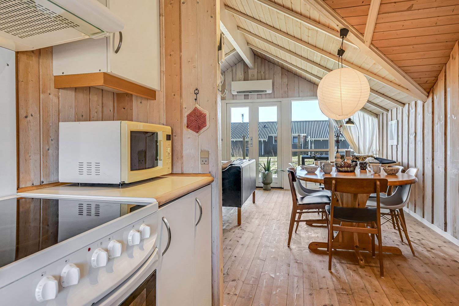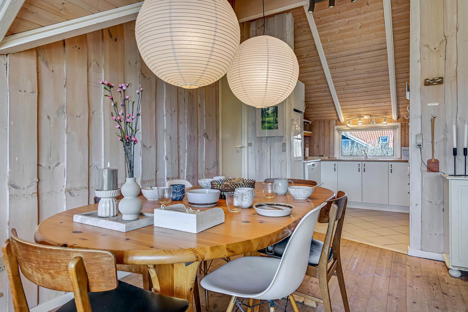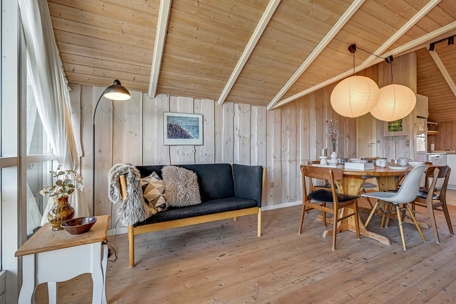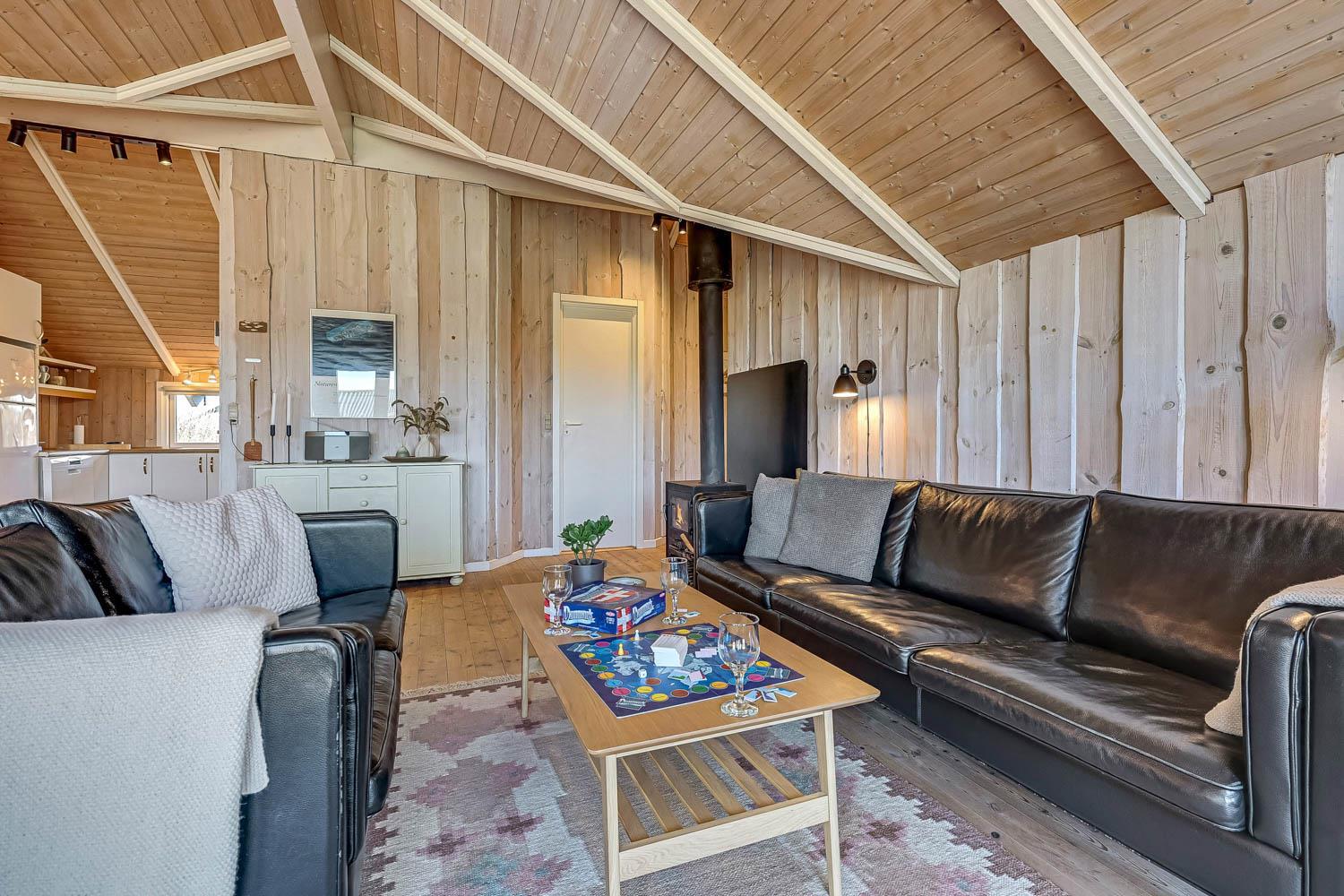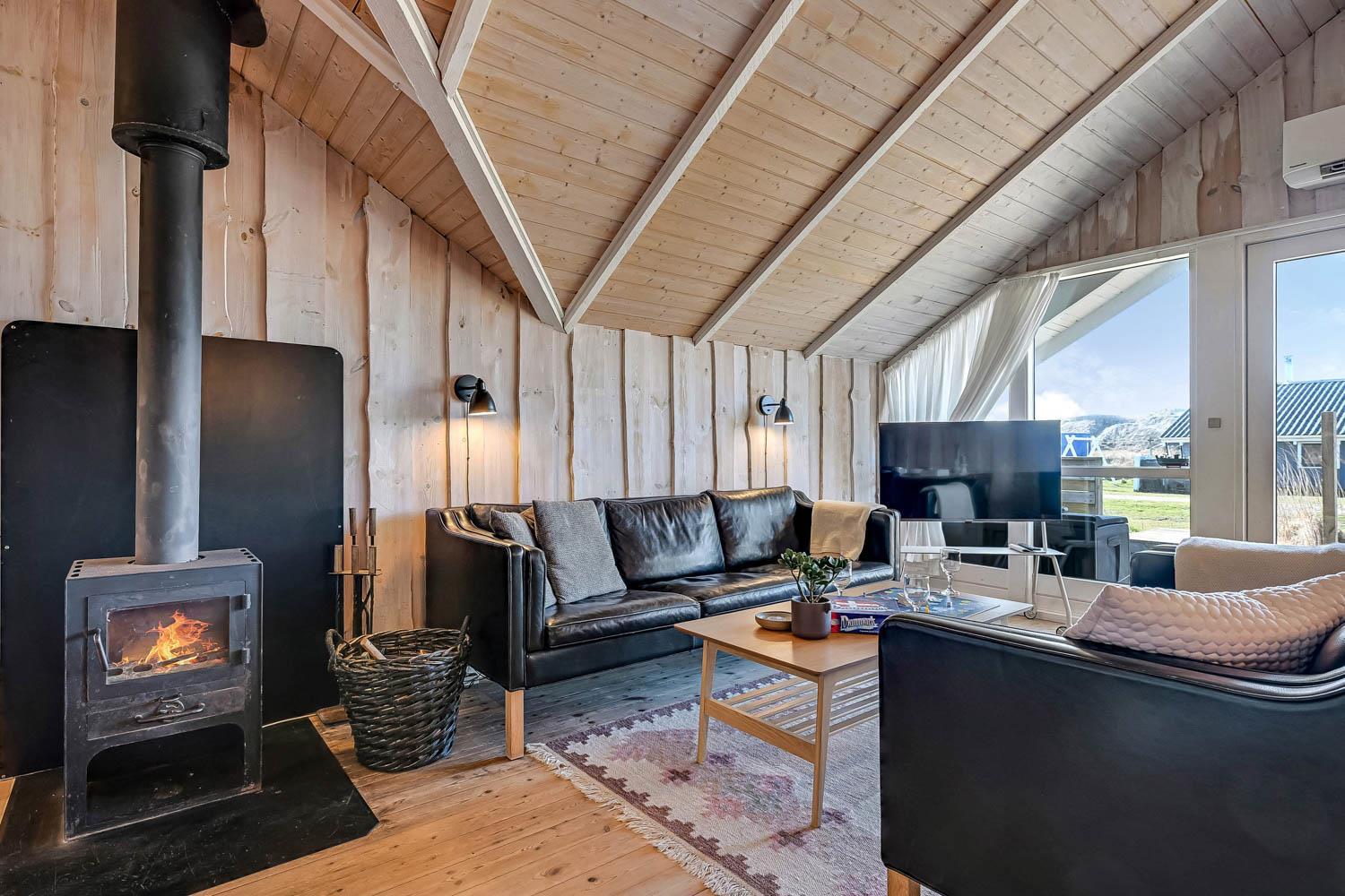 Huset er på 110 m² og byder på 4 gode soveværelser, hvilket gør det ideelt til både to familier eller den store familie. Den åbne kombination af stue og køkken skaber en hyggelig ramme for samvær, hvor brændeovnen og de komfortable møbler indbyder til afslapning efter en dag ved havet. Her er naturligvis også moderne faciliteter som Chromecast, varmepumpe og opvaskemaskine, der gør ferien nem og bekvem.