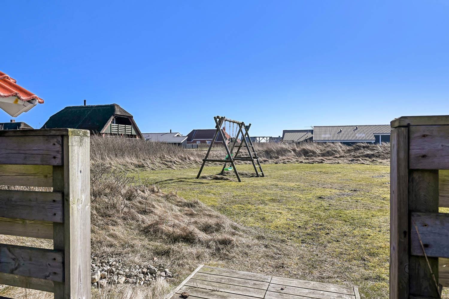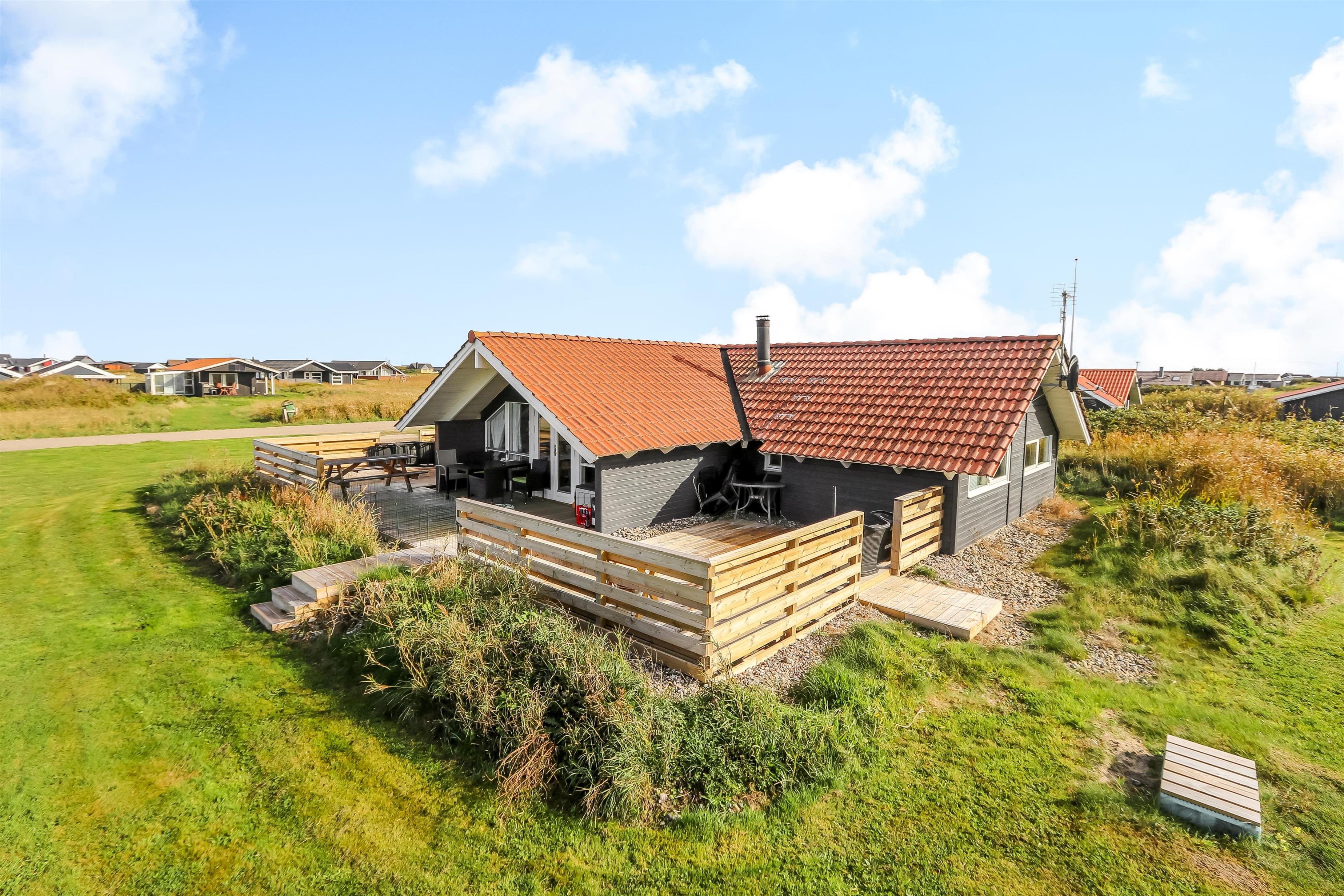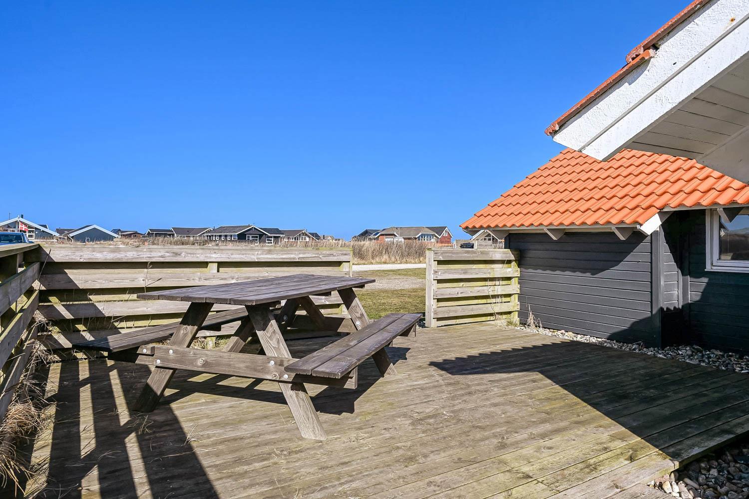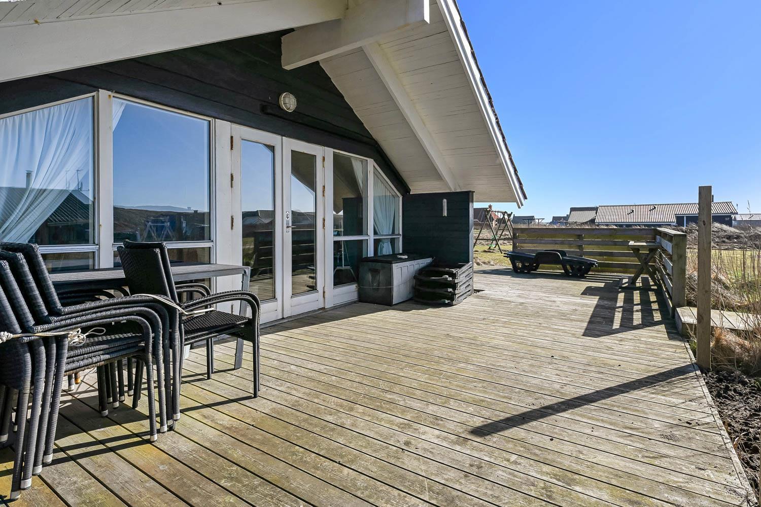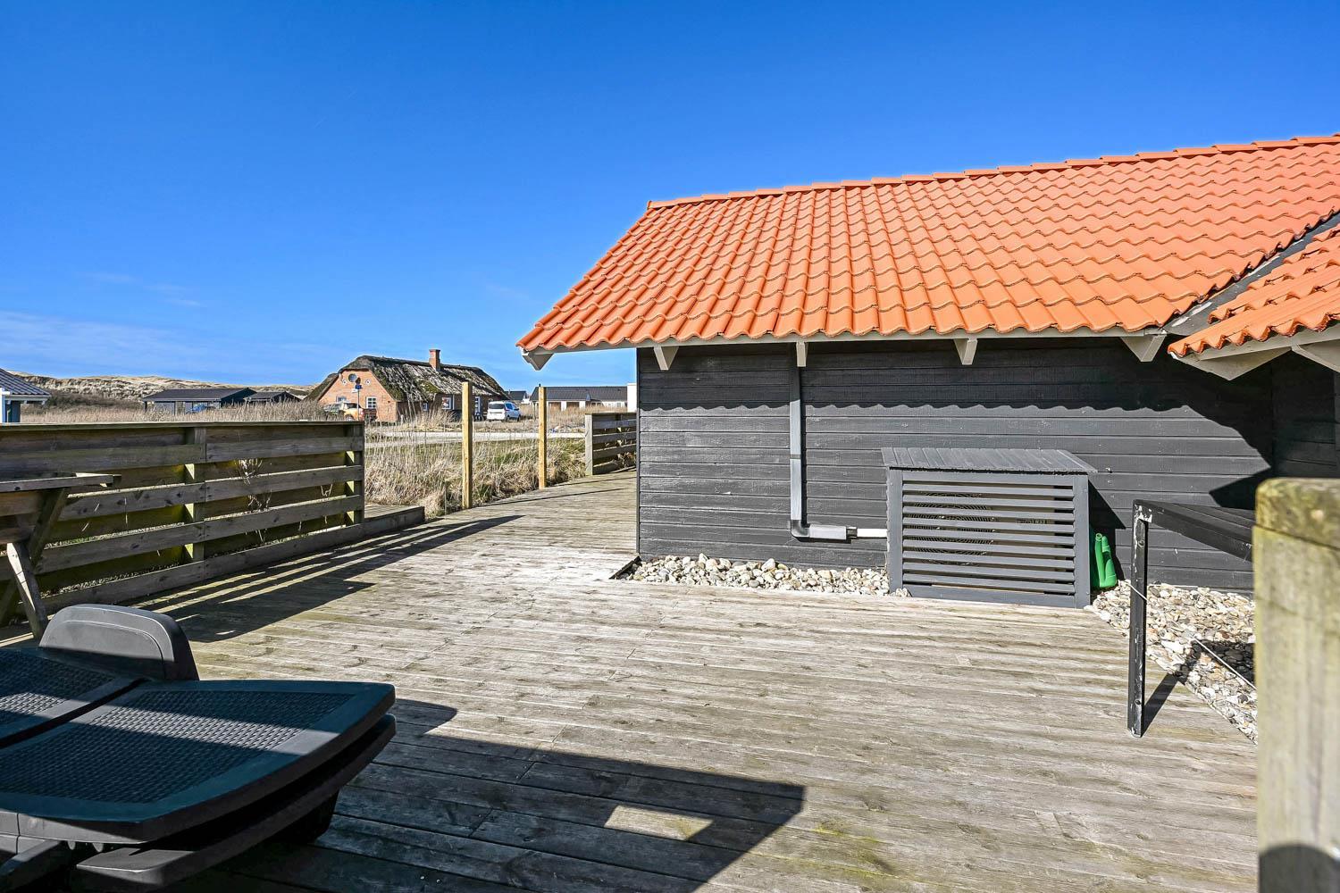 Fra stuen træder I direkte ud på en stor, delvist overdækket og indhegnet terrasse, der vender perfekt mod vest. Her kan I nyde solen dagen lang, grille om aftenen og høre Vesterhavets brusen i baggrunden. Den indhegnede terrasse gør det samtidig trygt for både børn og hund.