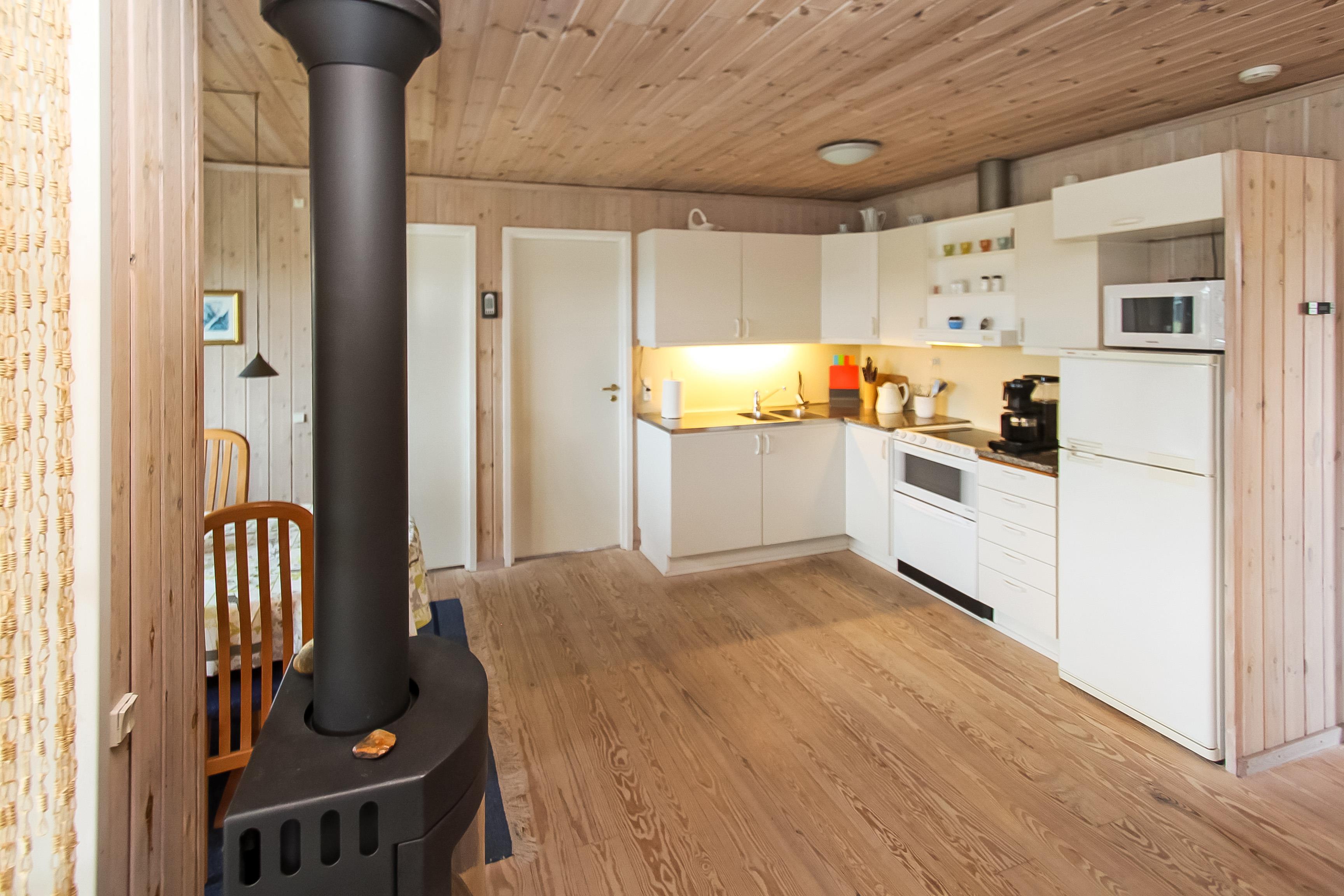 Køkkenet er praktisk og veludstyret med glaskeramisk komfur, opvaskemaskine, emhætte og mikroovn, så feriemaden er hurtigt klaret.