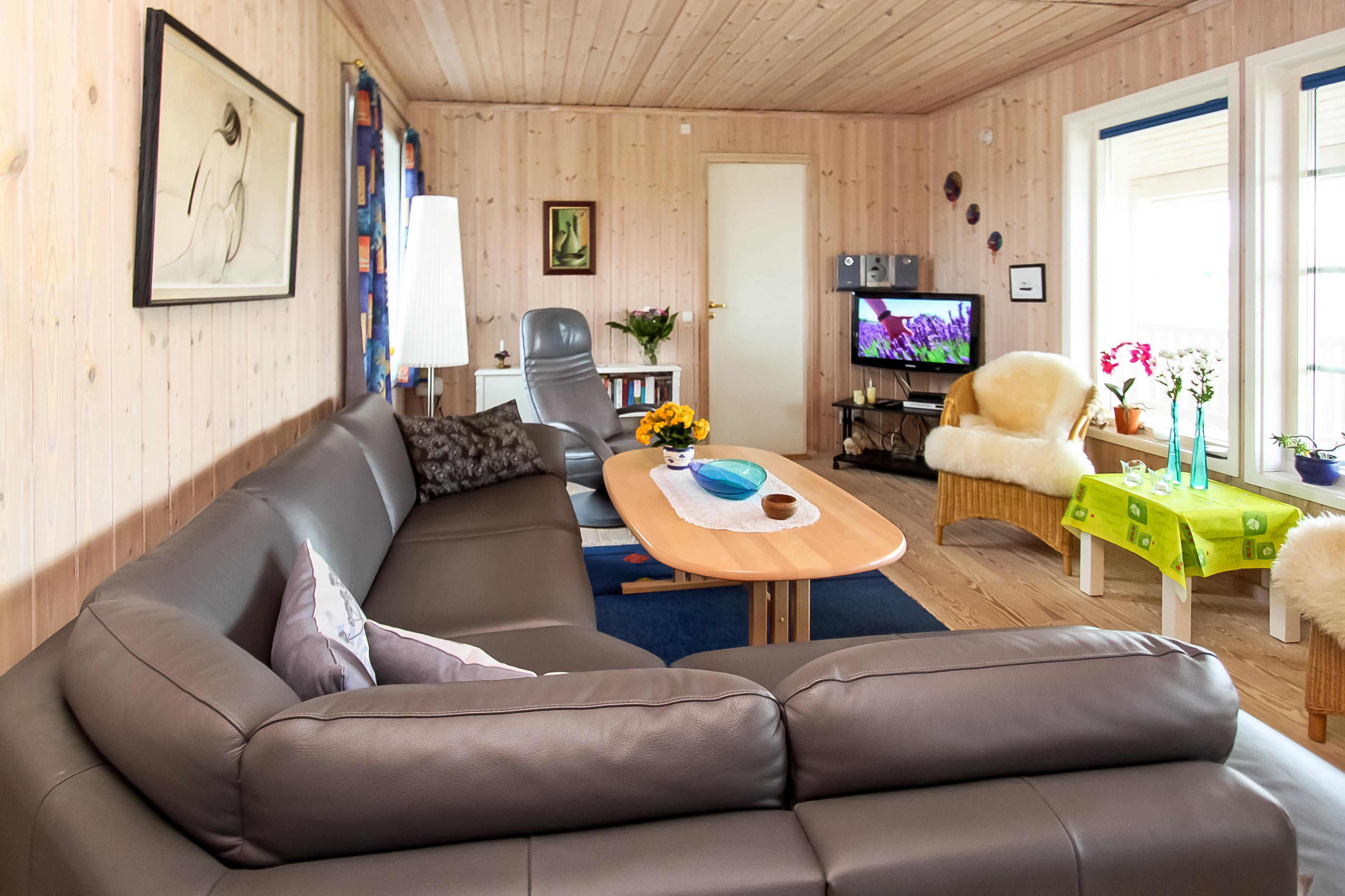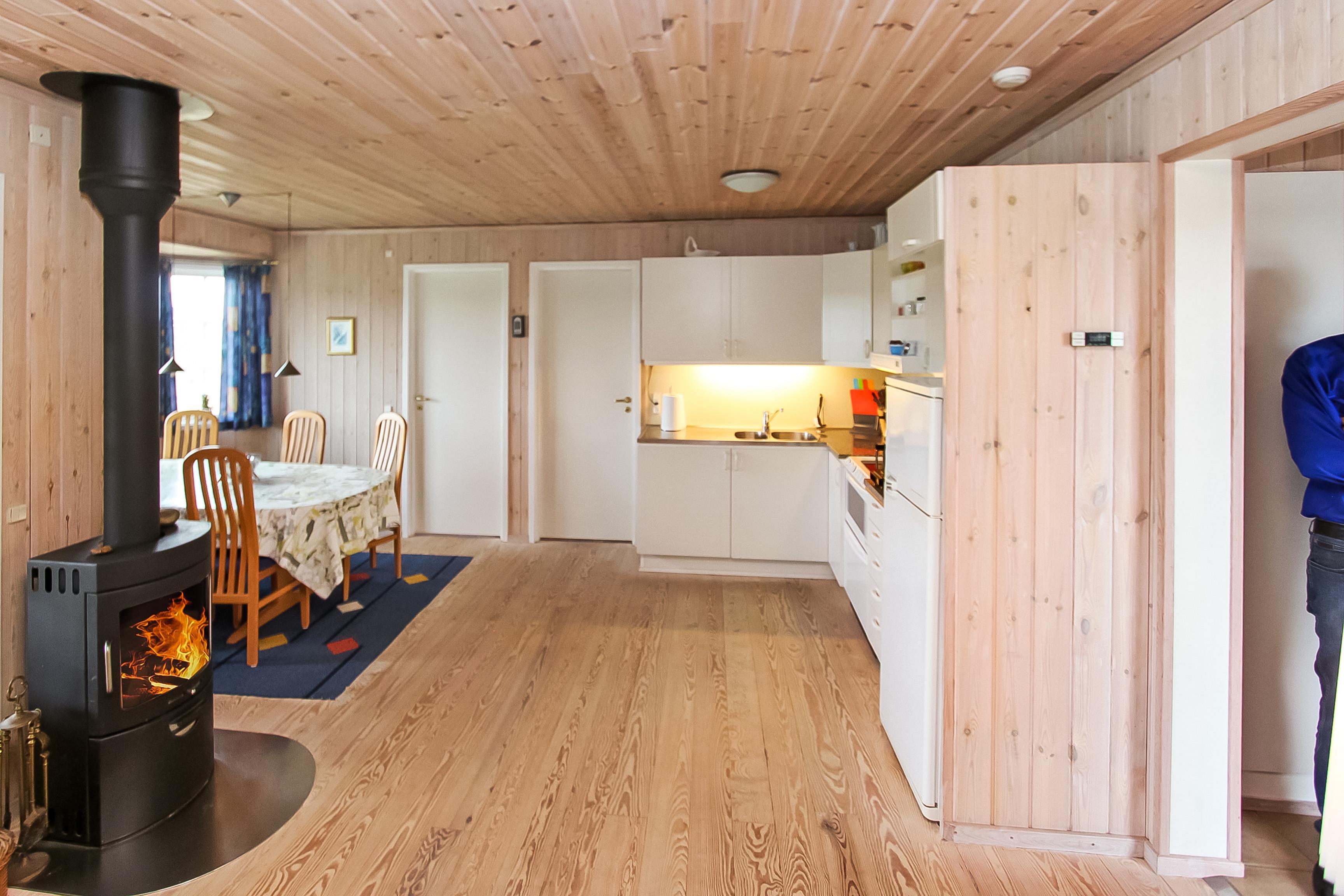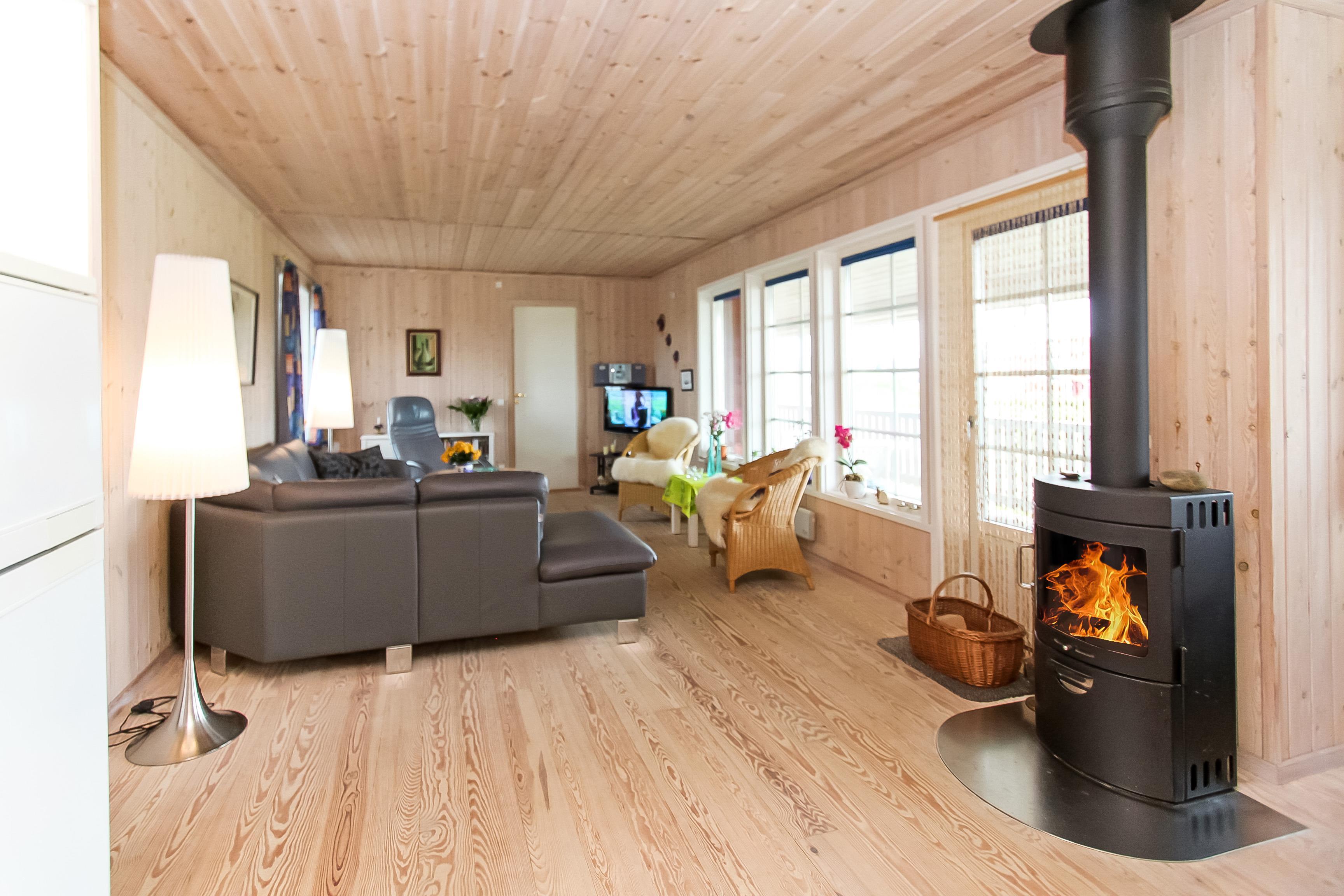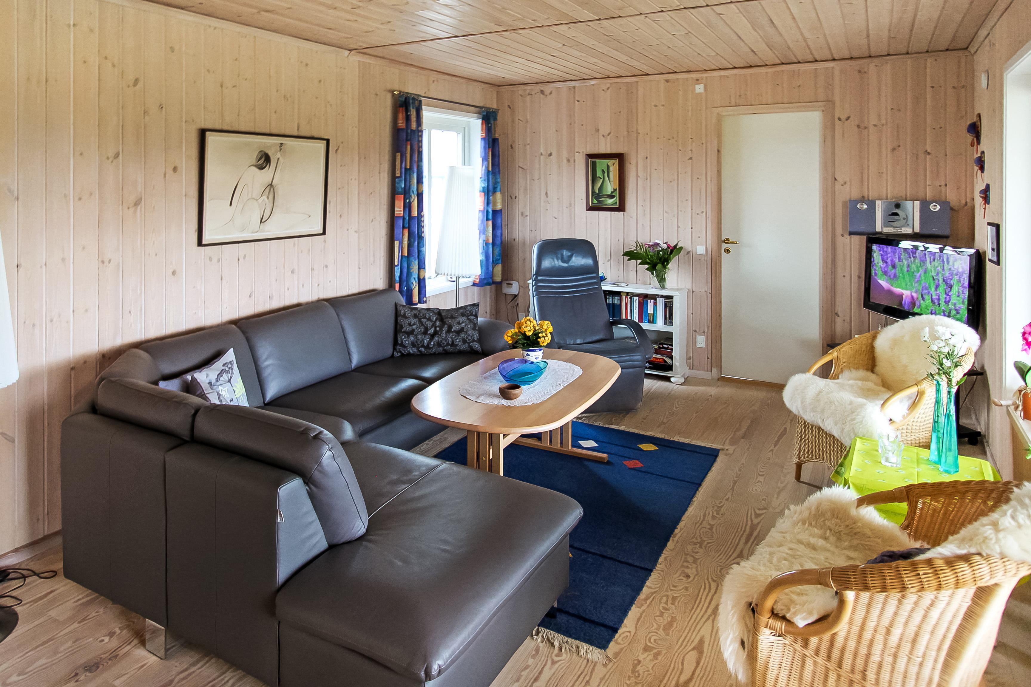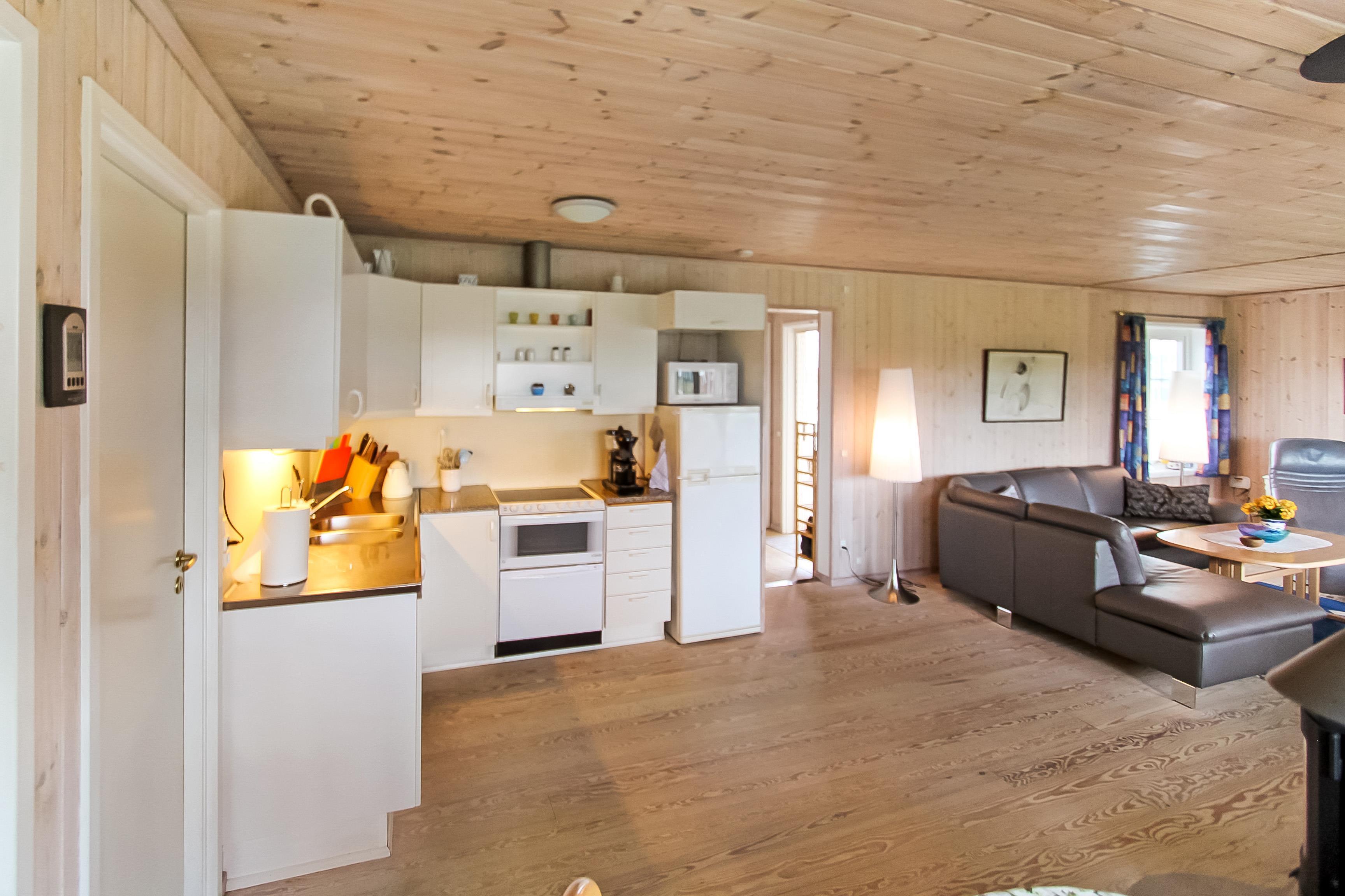 Den kombinerede stue og køkken byder på trægulve, lædermøbler, brændeovn og TV med tyske kanaler. Derudover sørger en energivenlig varmepumpe for et behageligt indeklima – og et lavere elforbrug.